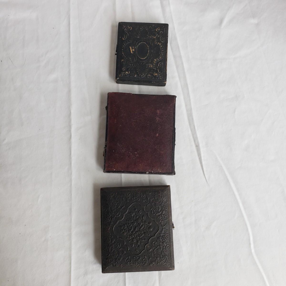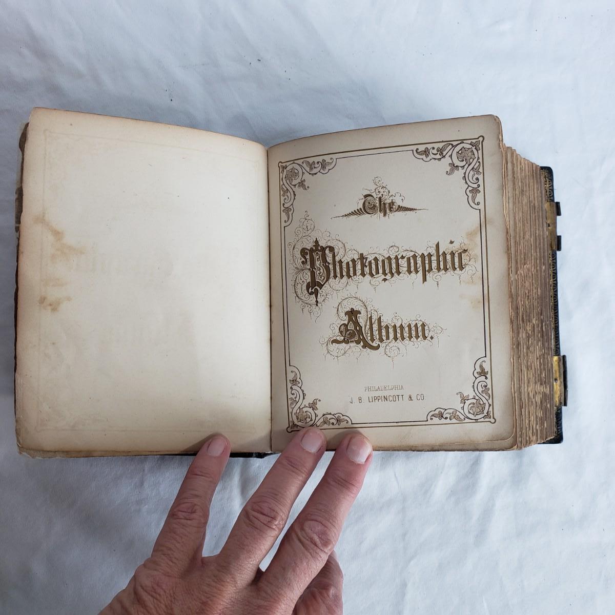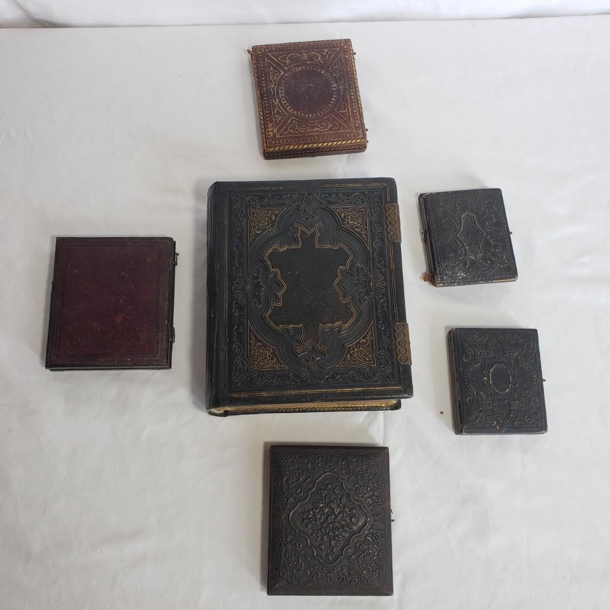 This lot features one photographic album and five tintype frames. The album (6" x 5" x 2"H) contains pictures that appear to be from 1862-1887. The album was made by the J. B. Lippincott & CO from Philadelphia. There is one brass closure missing does not lock. There is some wear on the spine, see picture. The five tintype frames have a velvety cloth side and a metal frame with glass. They have a hook latch to close it, some are missing, see pictures for details. One frame is completely separated at the spine.