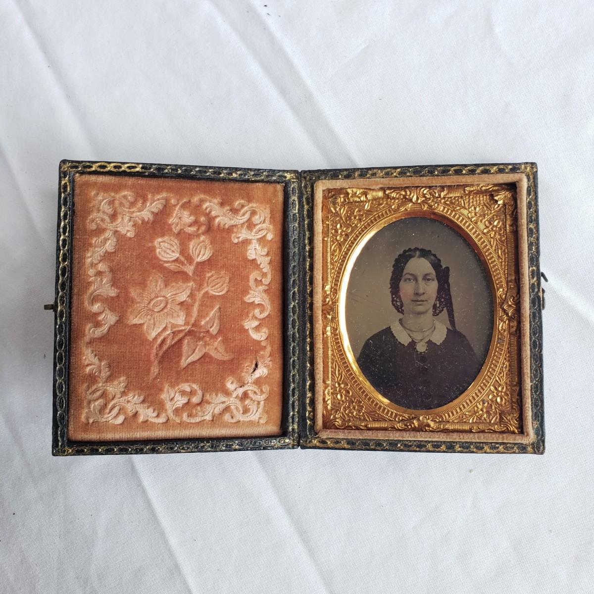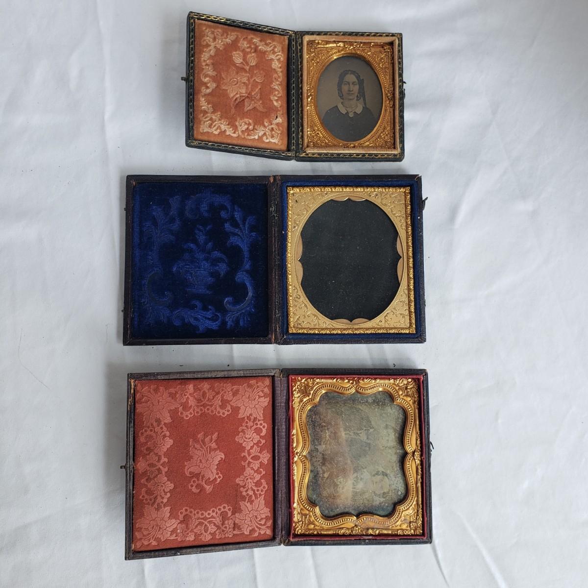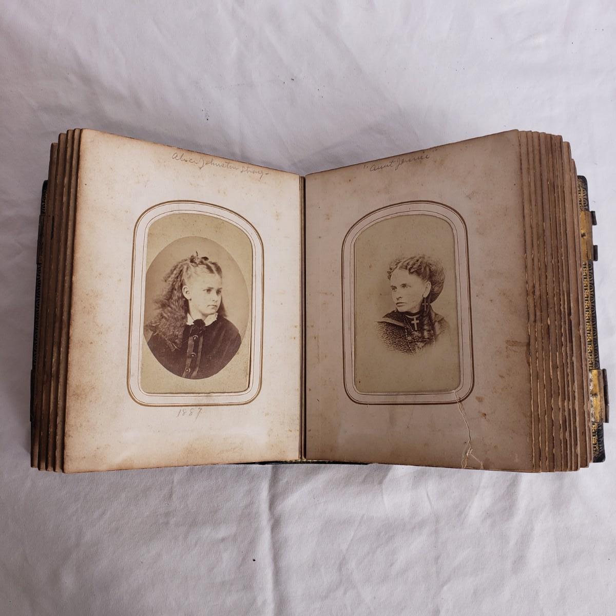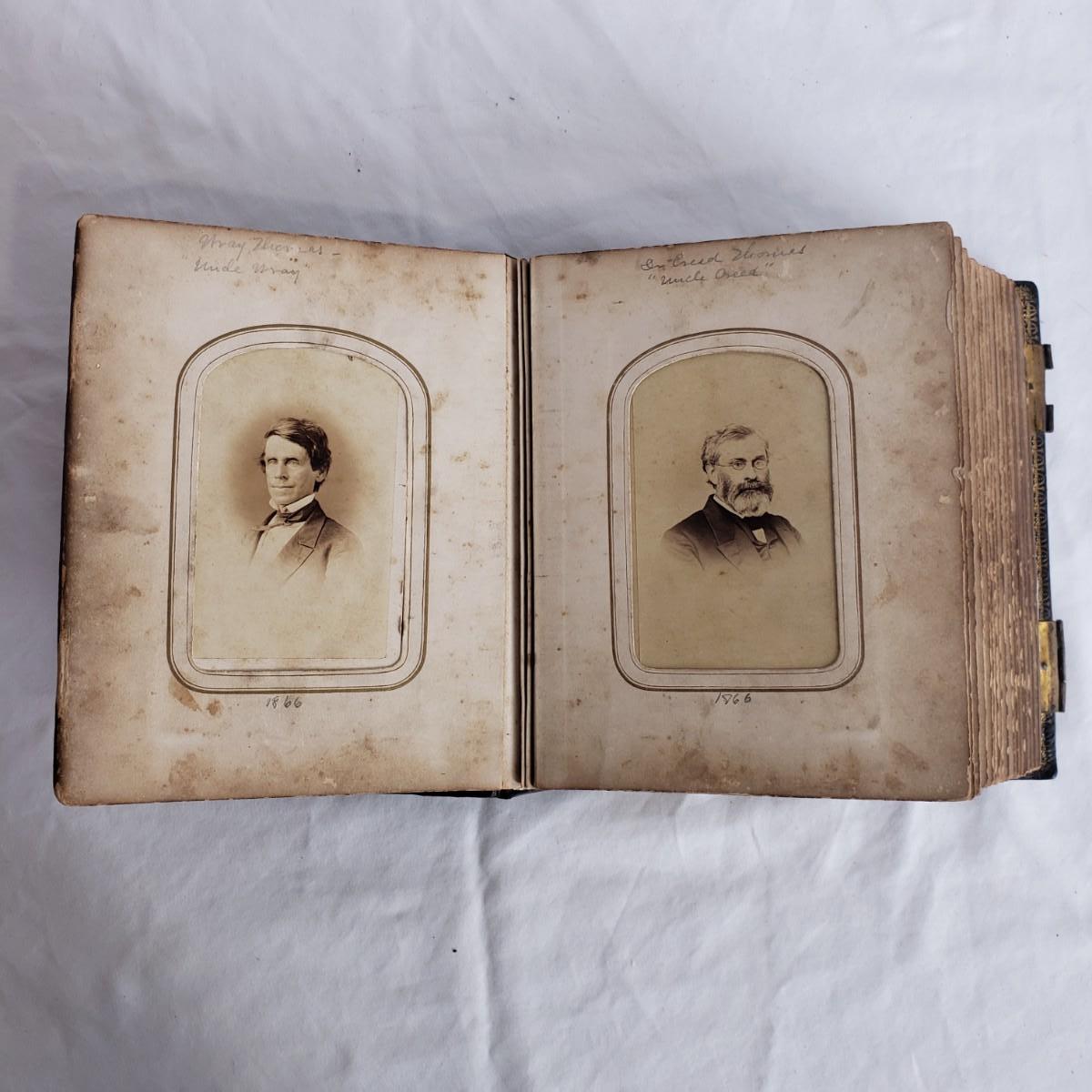 This lot features one photographic album and five tintype frames. The album (6" x 5" x 2"H) contains pictures that appear to be from 1862-1887. The album was made by the J. B. Lippincott & CO from Philadelphia. There is one brass closure missing does not lock. There is some wear on the spine, see picture. The five tintype frames have a velvety cloth side and a metal frame with glass. They have a hook latch to close it, some are missing, see pictures for details. One frame is completely separated at the spine.