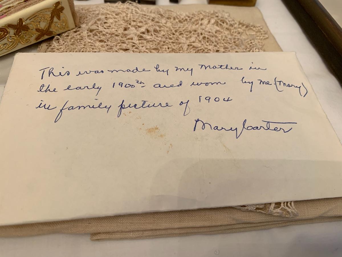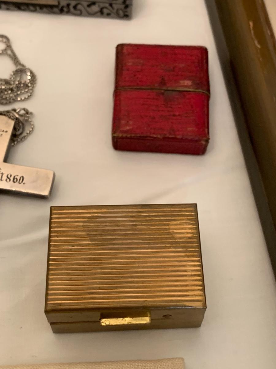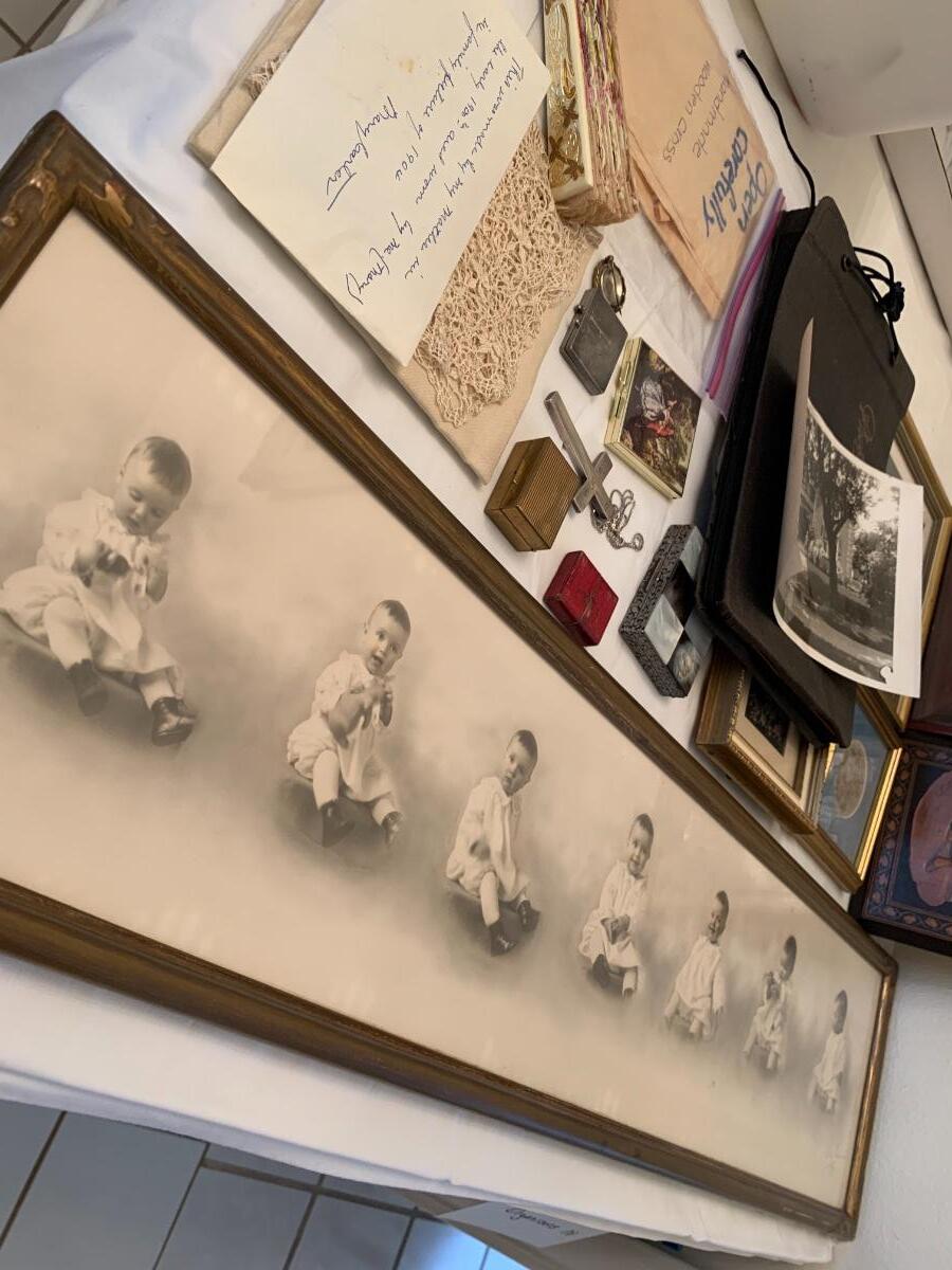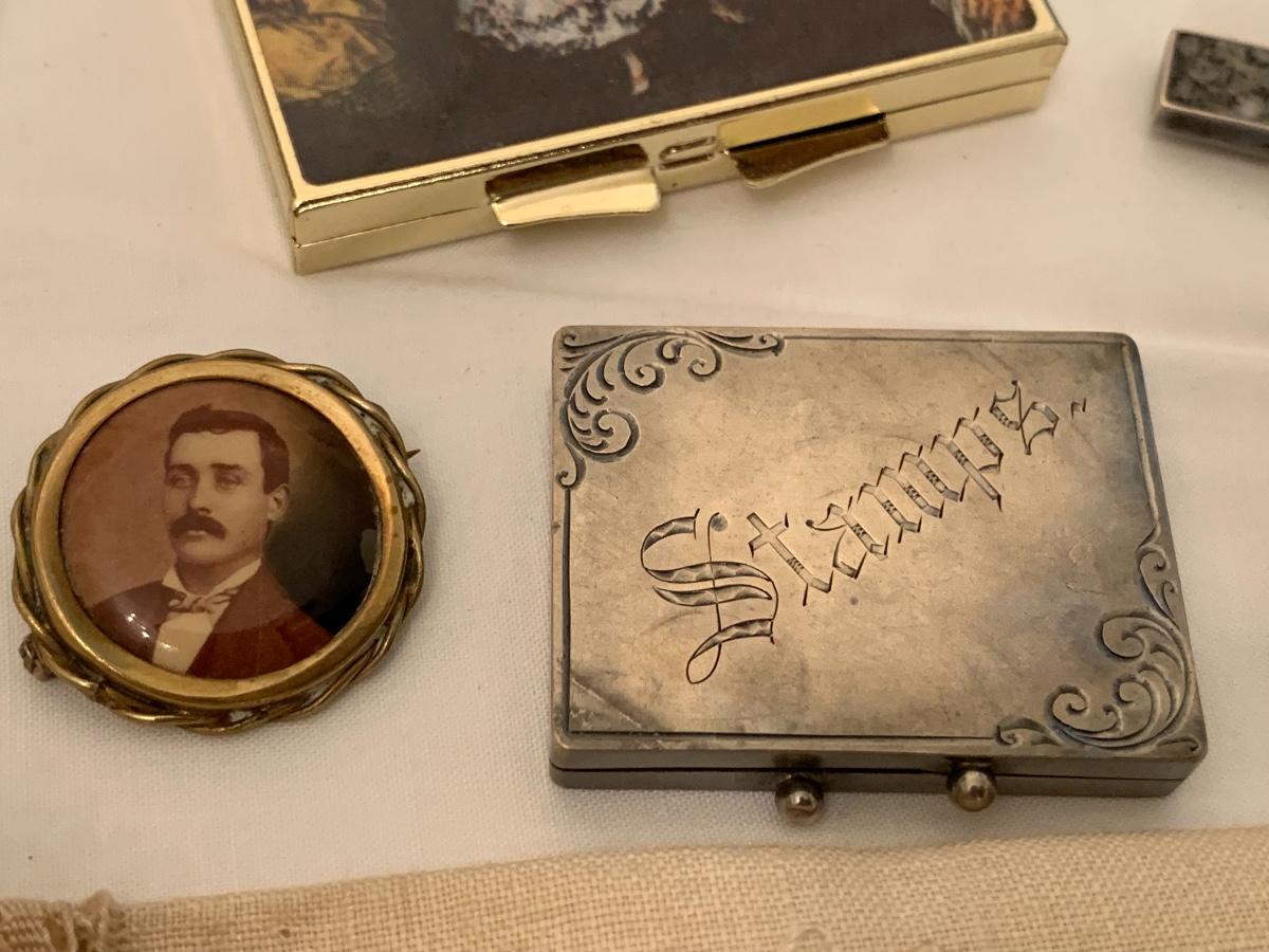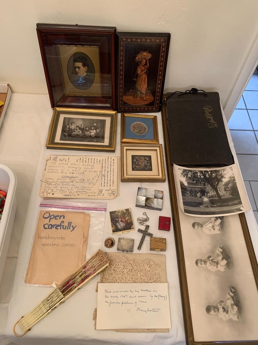 Antique photos, linens, and jewelry. Miniature pocket bible, Cross made in 1860, and more.