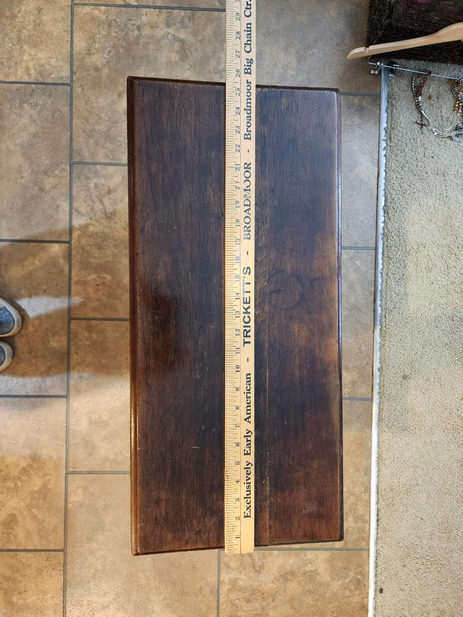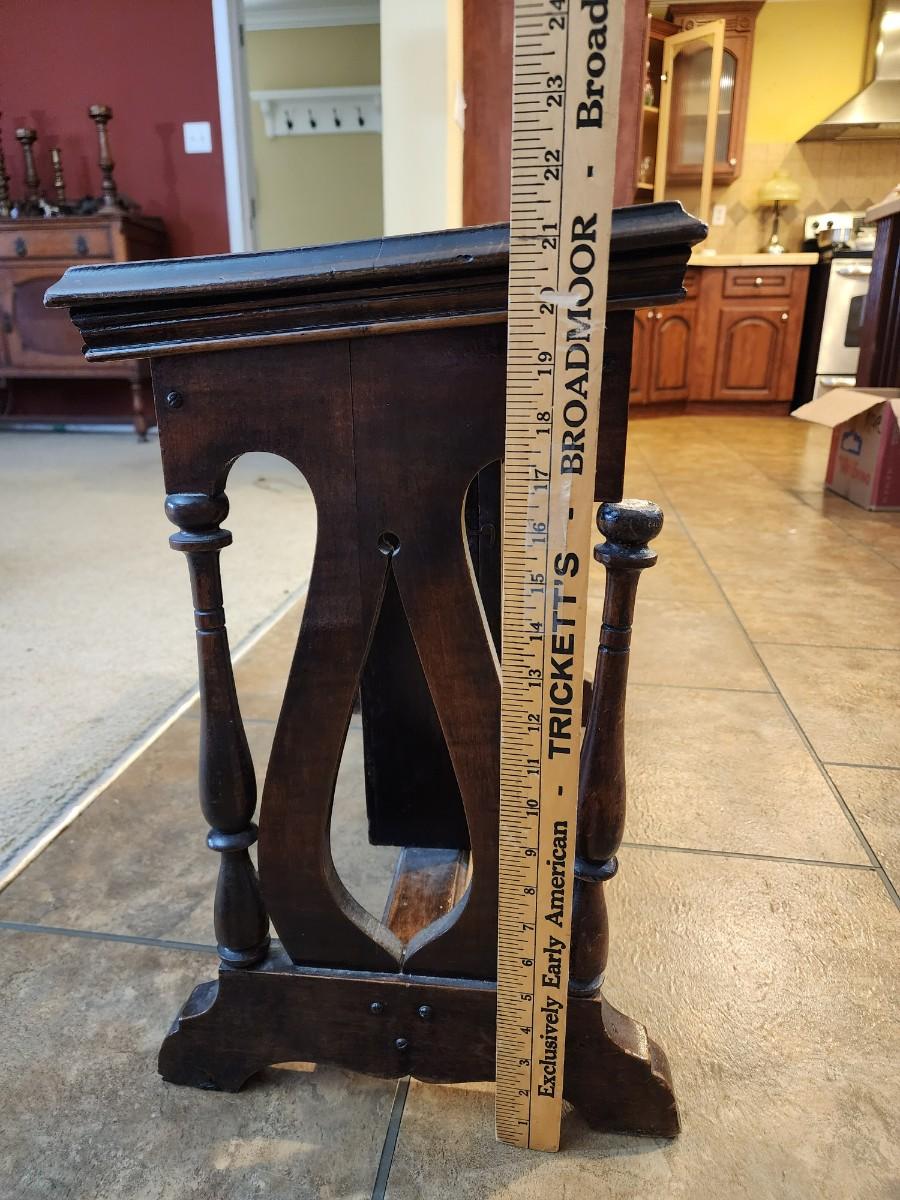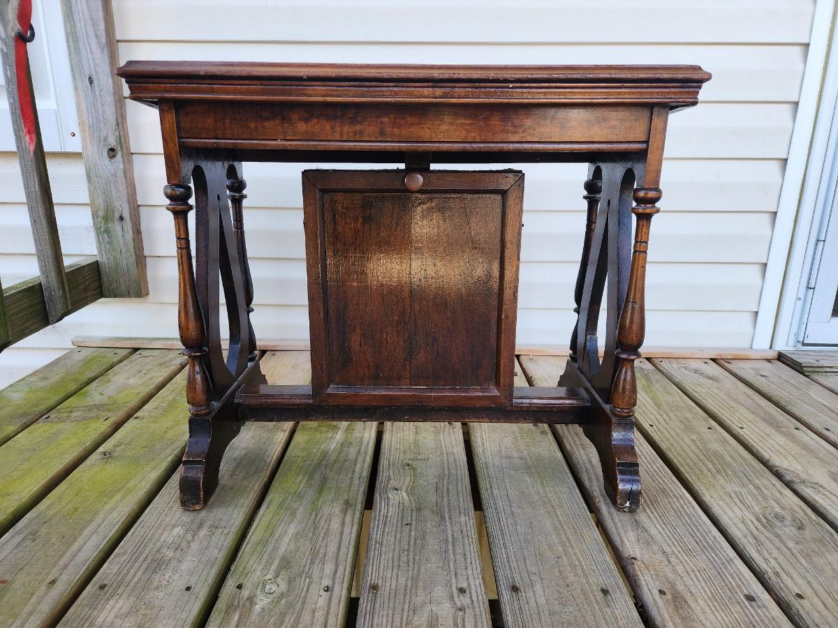 Small bench, has a compartment for music or possibly a bible or hymnal.