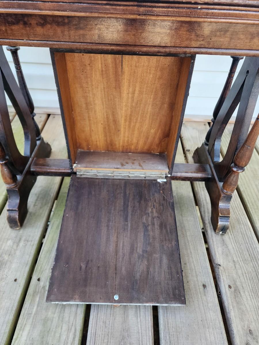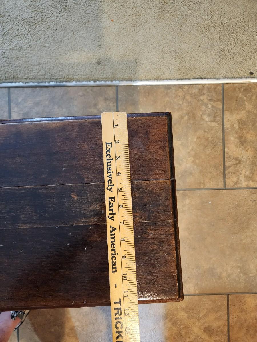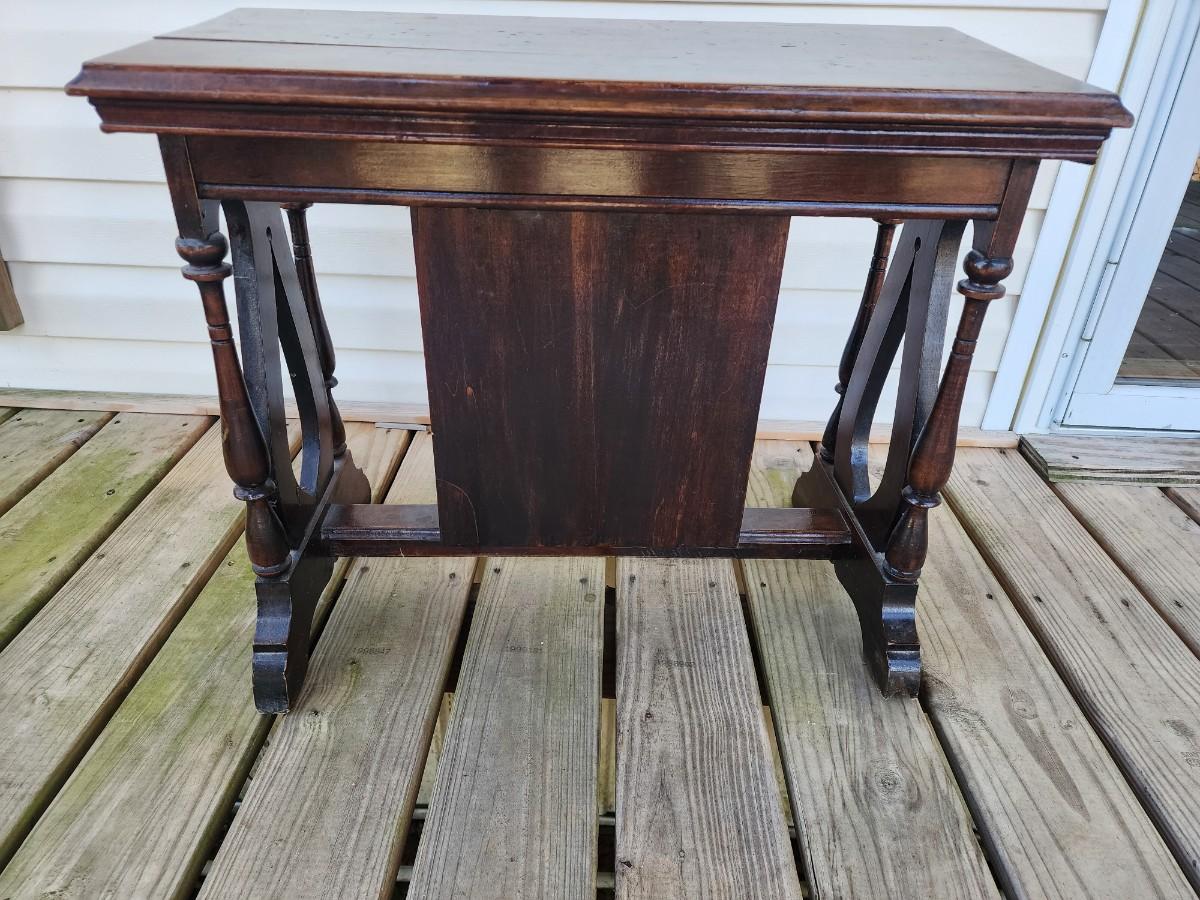 Small bench, has a compartment for music or possibly a bible or hymnal.