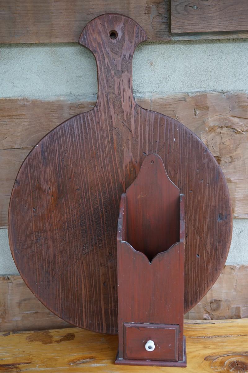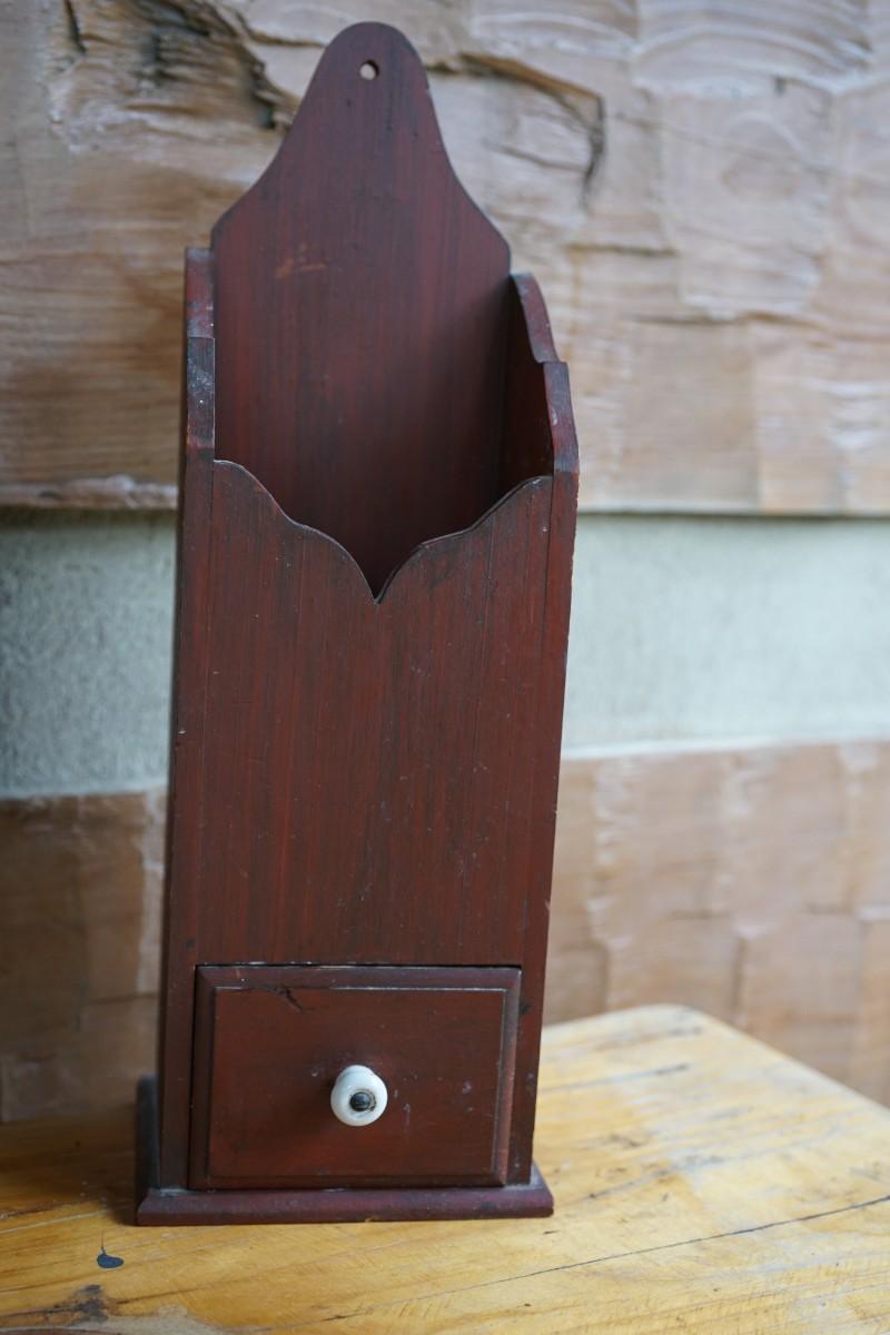 The candlebox I date to mid 20th century. red painted not old?. antique porcelain knob. very nice design on the side and front