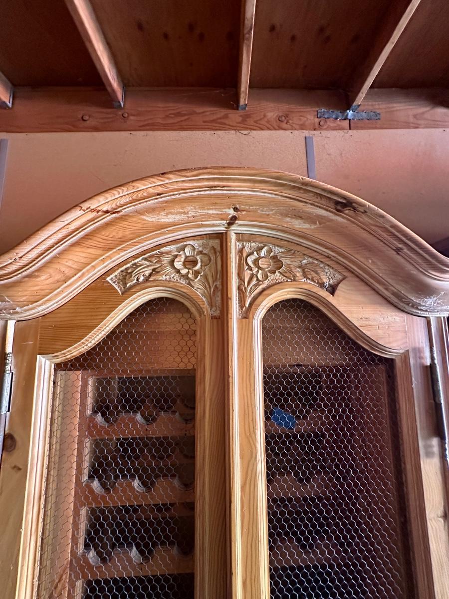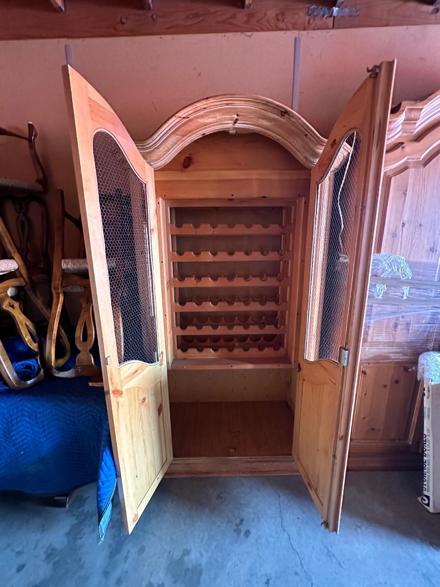 A handsome, tall wine cabinet in pine with classic, clean lines and a warm, honeyed tone. Stored for over 20 years and never put into service—excellent, well-preserved condition for its age and rare to find this nice.