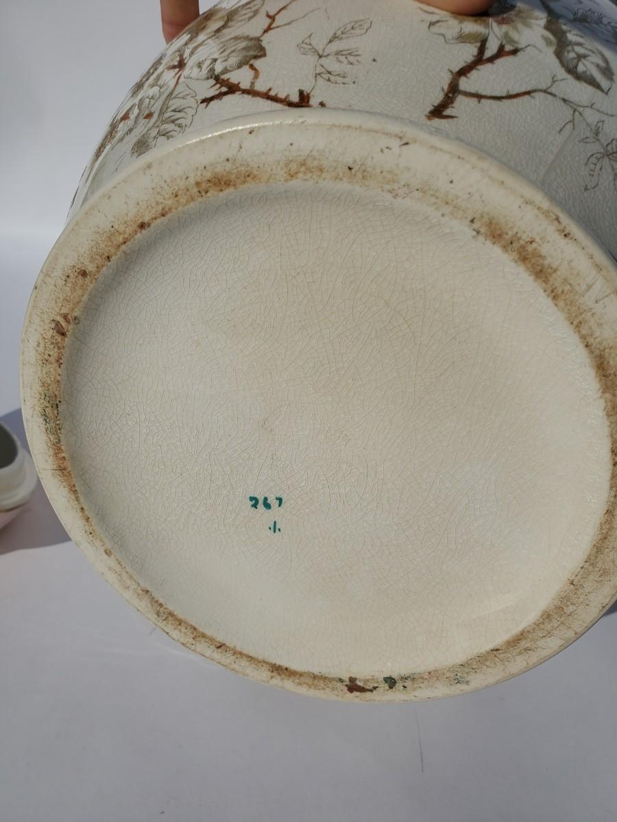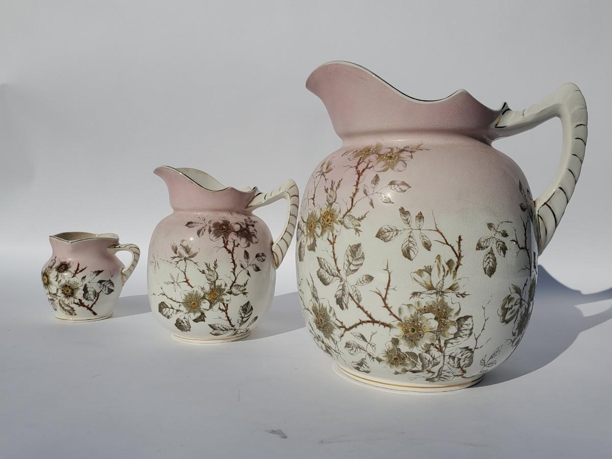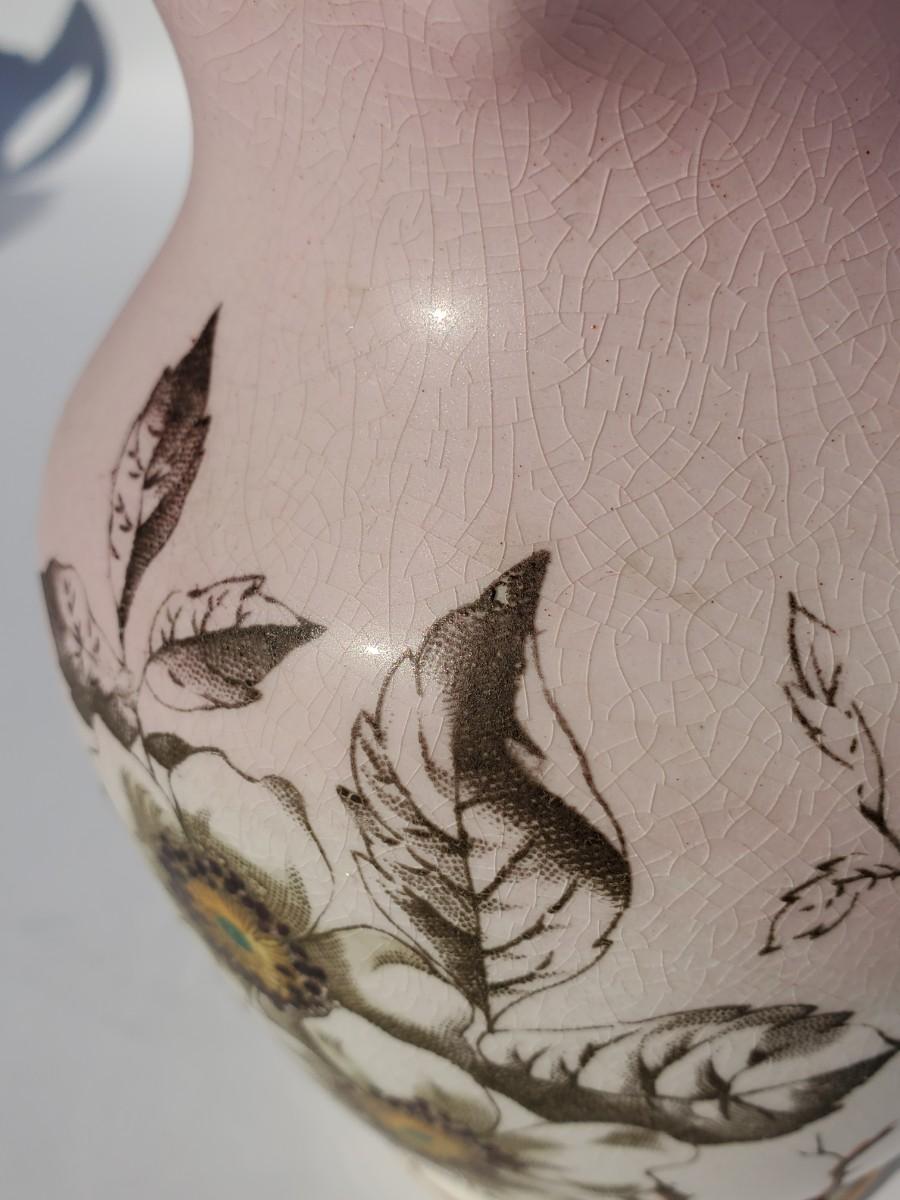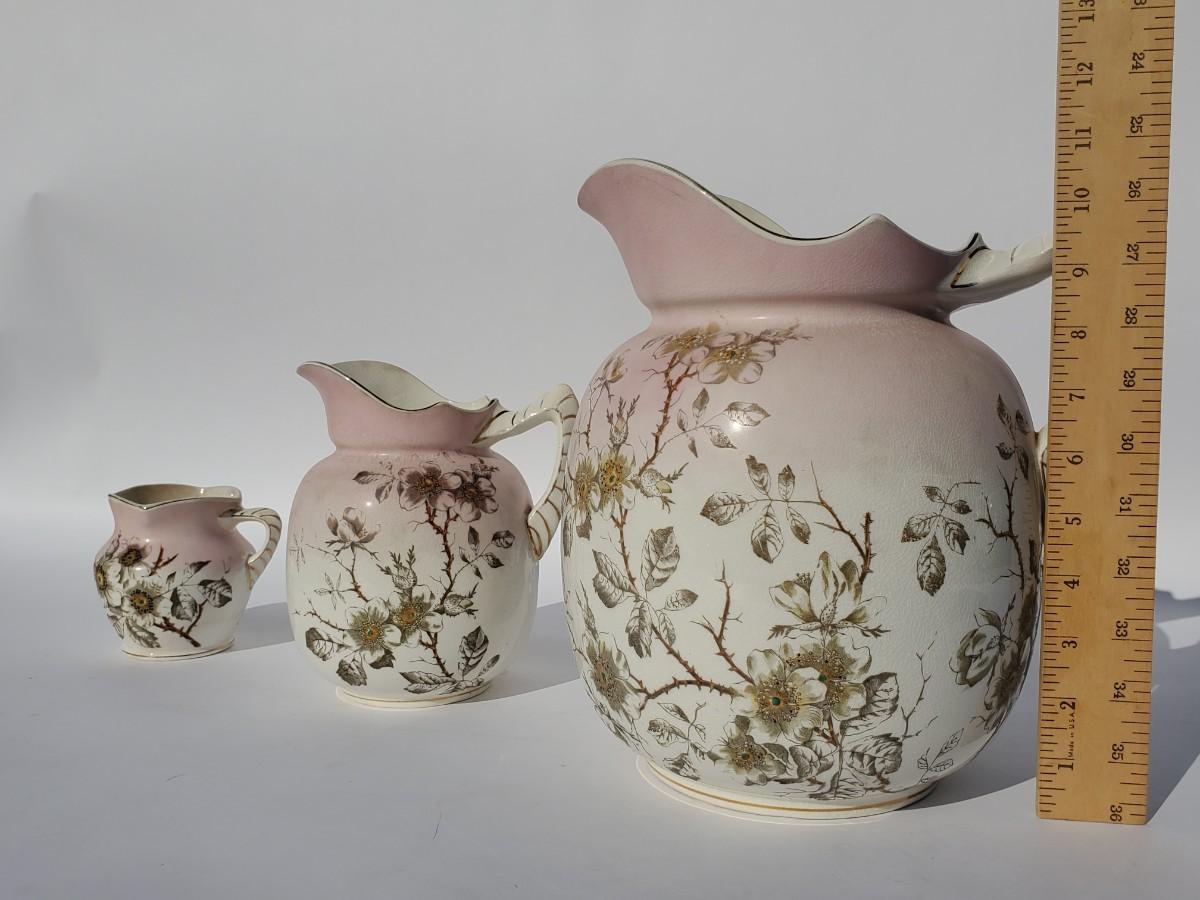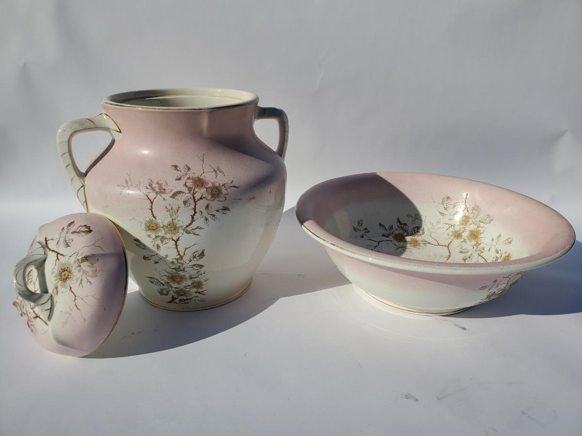 Chamber pot with lid and wash basin, large pitcher, small pitcher, vase, and cup with handles. 7 pieces total.