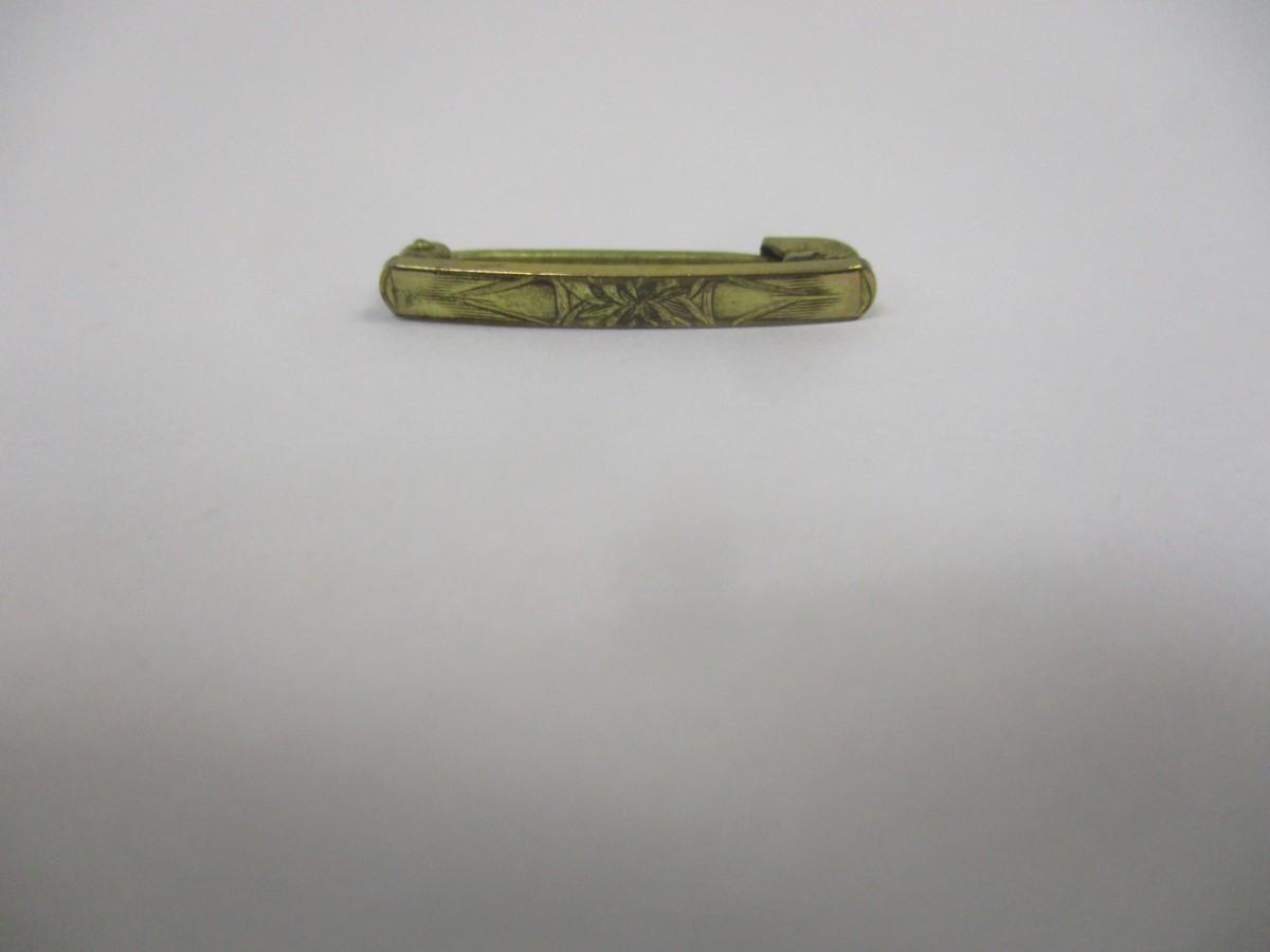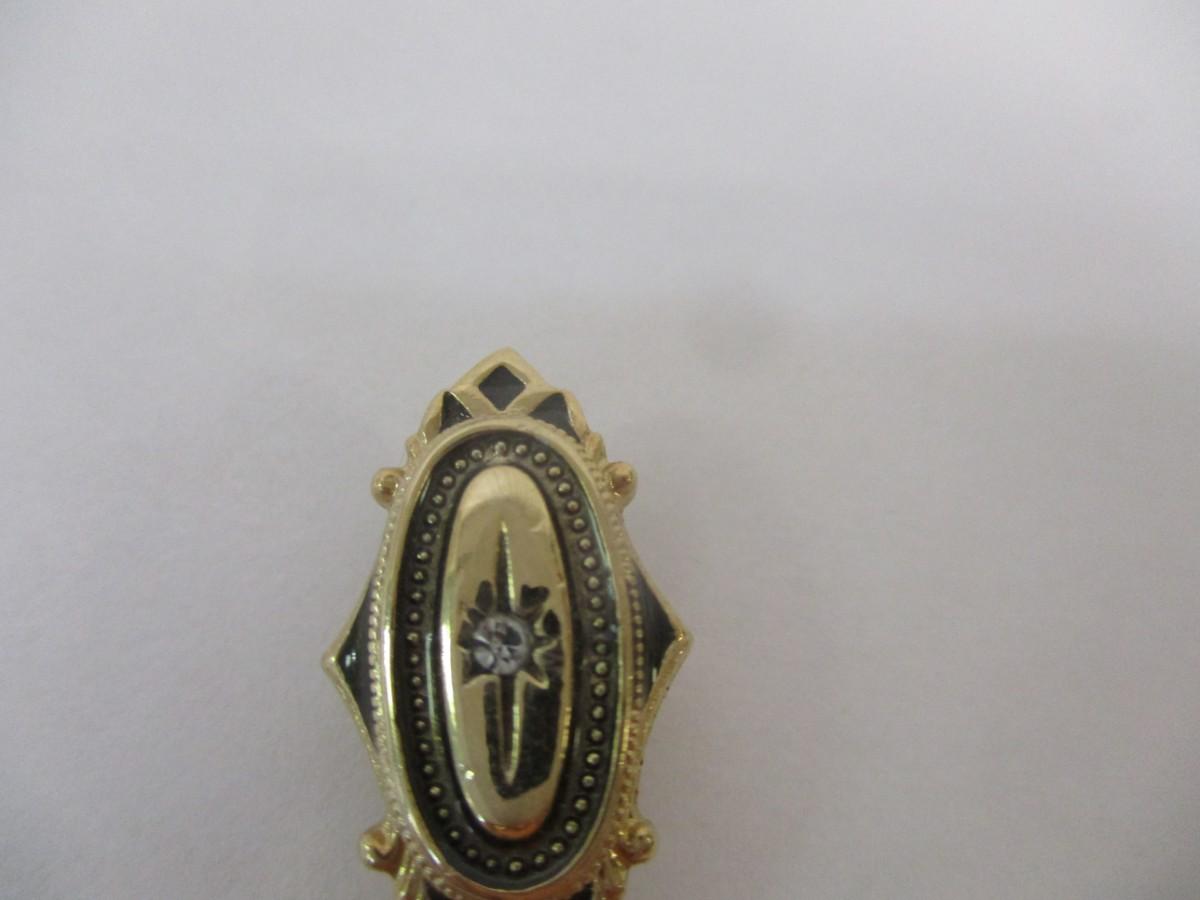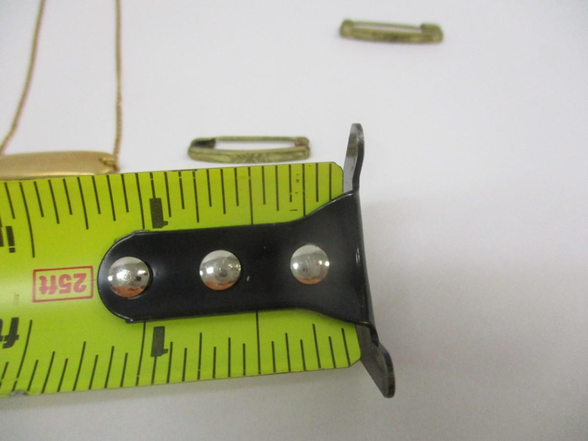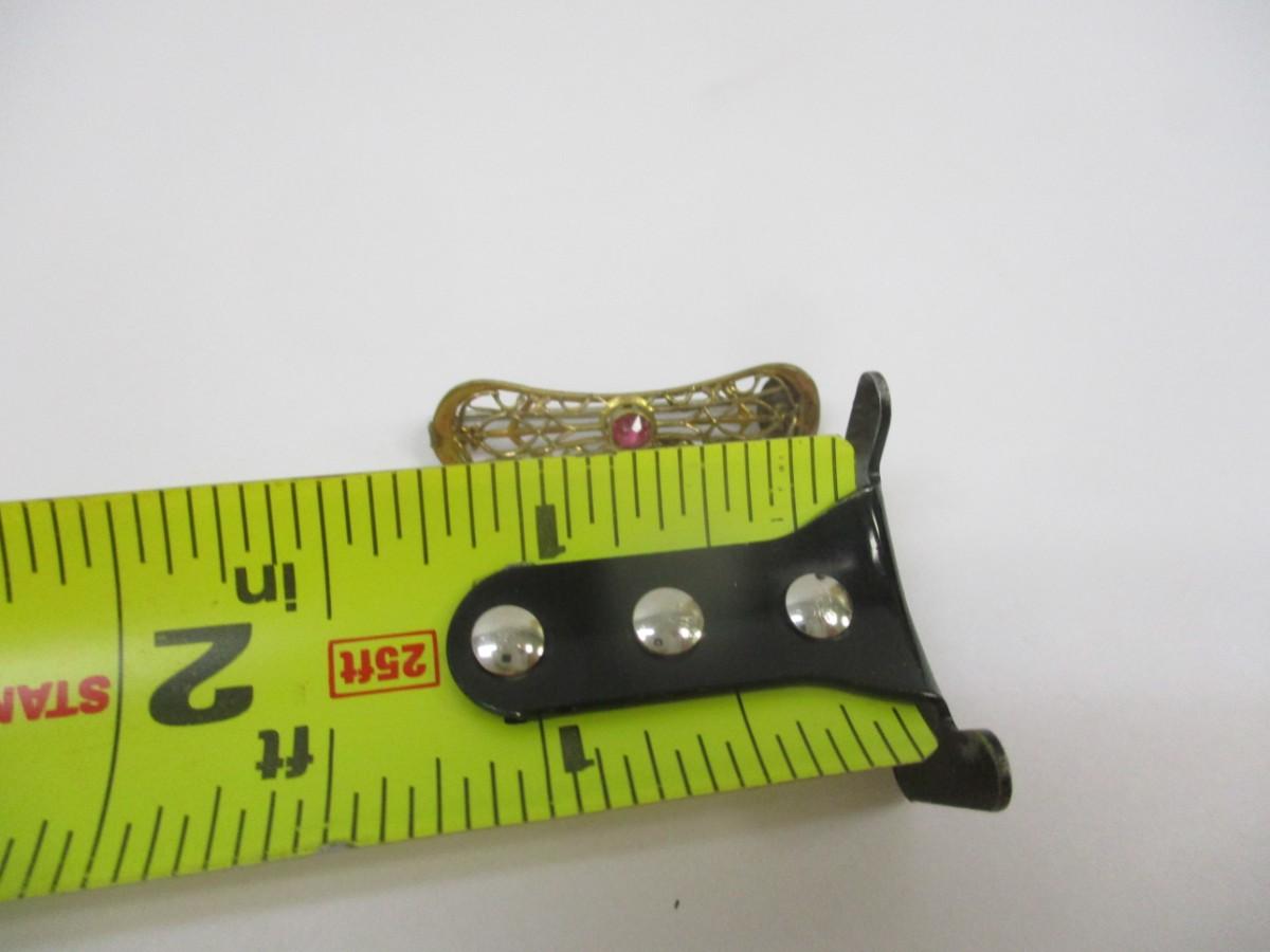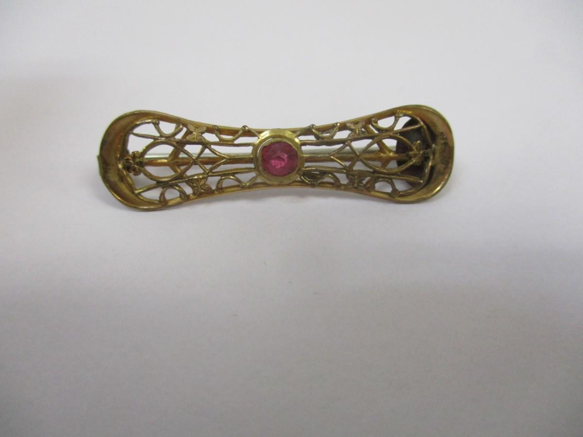 Antique Victorian Filgree Gold Tone Ruby Red Rhinestone Bar pin Brooch - Gold Tone Engraved Brooch - Vintage Clam Shell Necklace - Avon Rhinestone Stick Pin