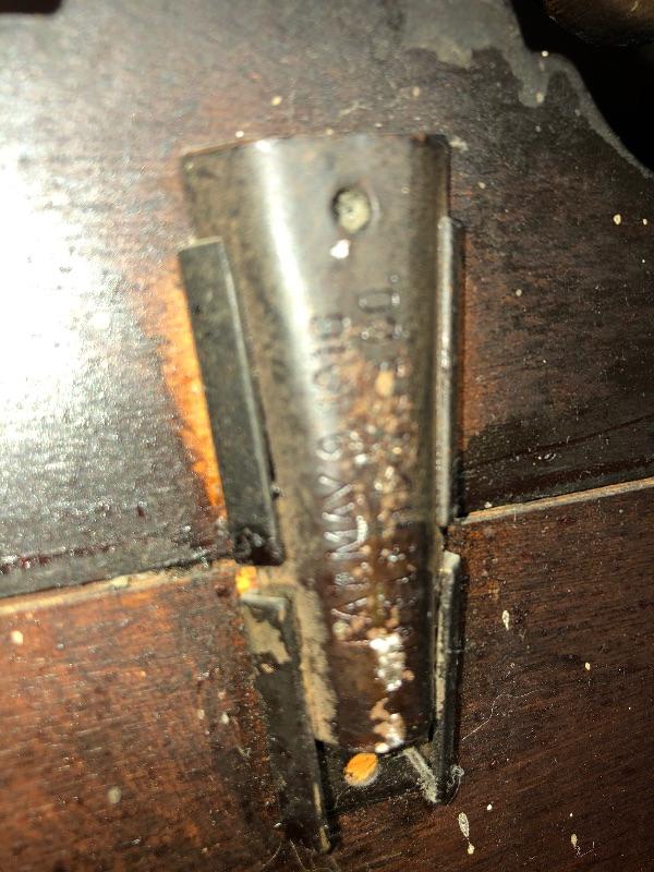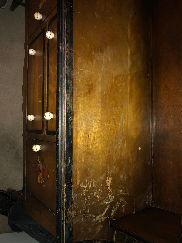 Antique plate china hutch from the 1900s with 2 plate shelf’s and 2 drawers and 2 cabinets for storage, Brass on back side is made by Keeler brass co in 1916. Decorated with painted flowers on doors.