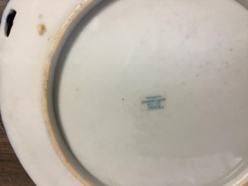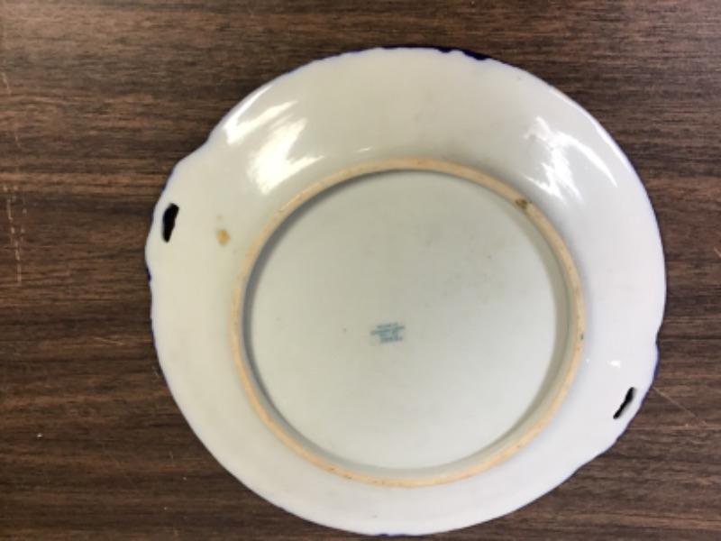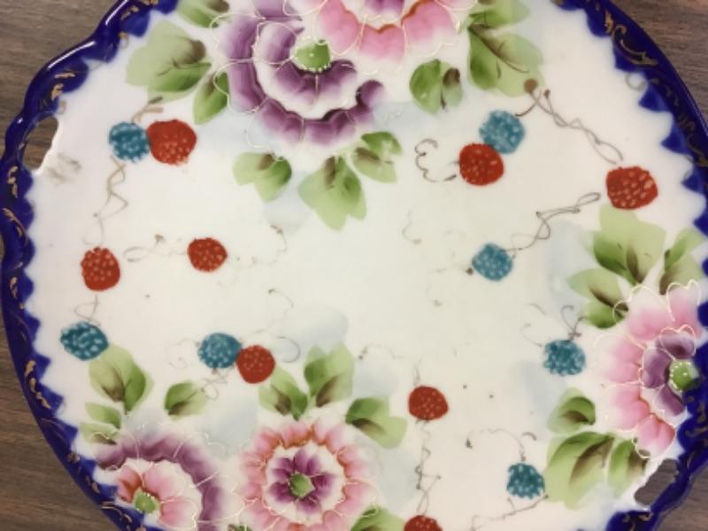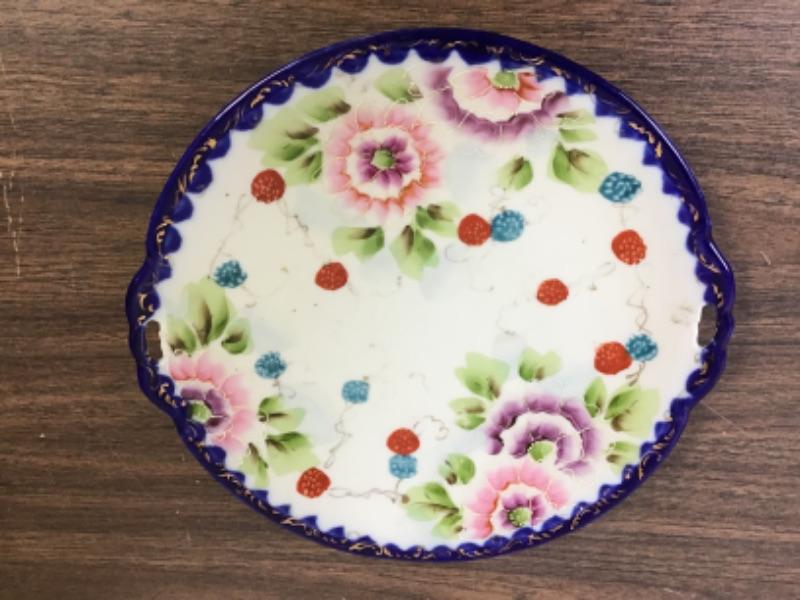 Two handle plate measured 10 inches across. Stamp marks it as Made in China Nippon Handpainted. Raspberries and flower motif