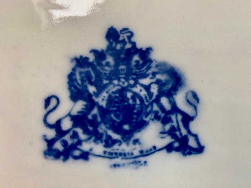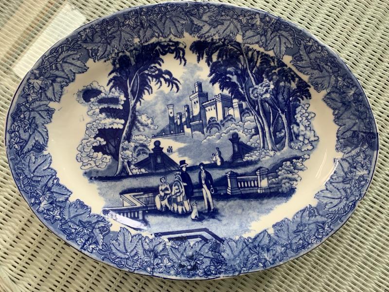 Blue & white flow-blue Staffordshire antique oval platter. Marked on back.