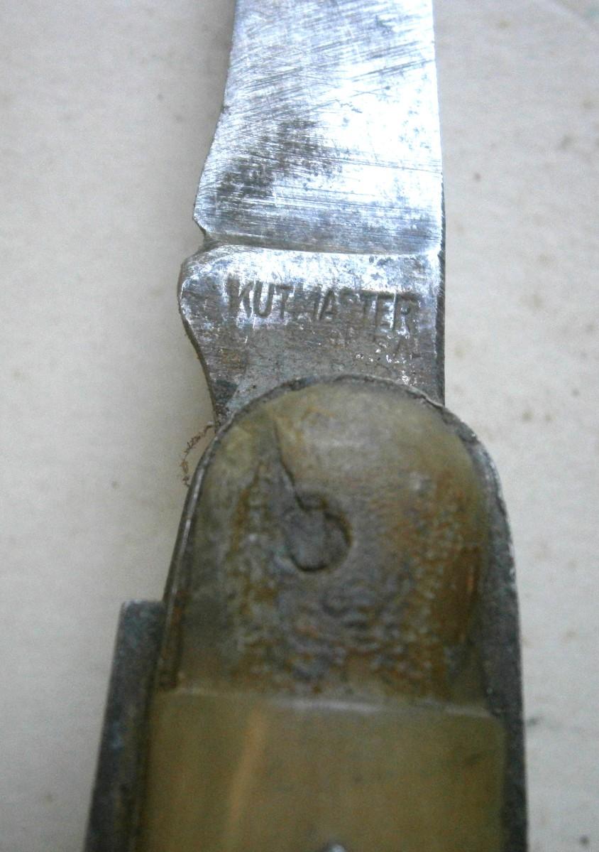 Antique Pocket Knife with Horn Handle by Kutmaster, 3 1/4 in. long (closed, tip of one blade broken off.