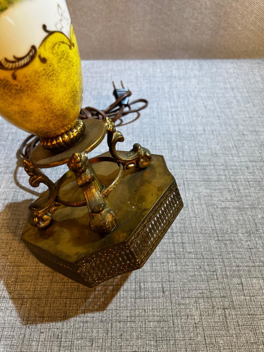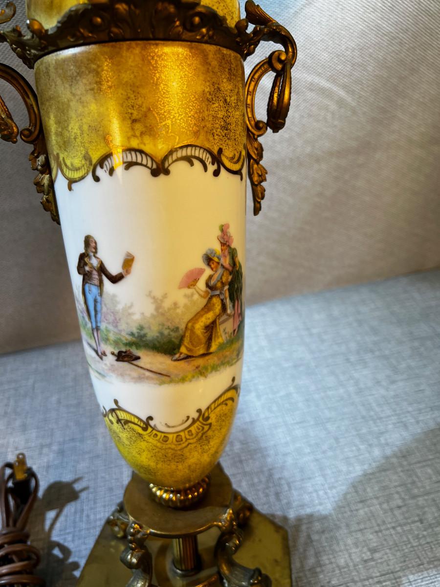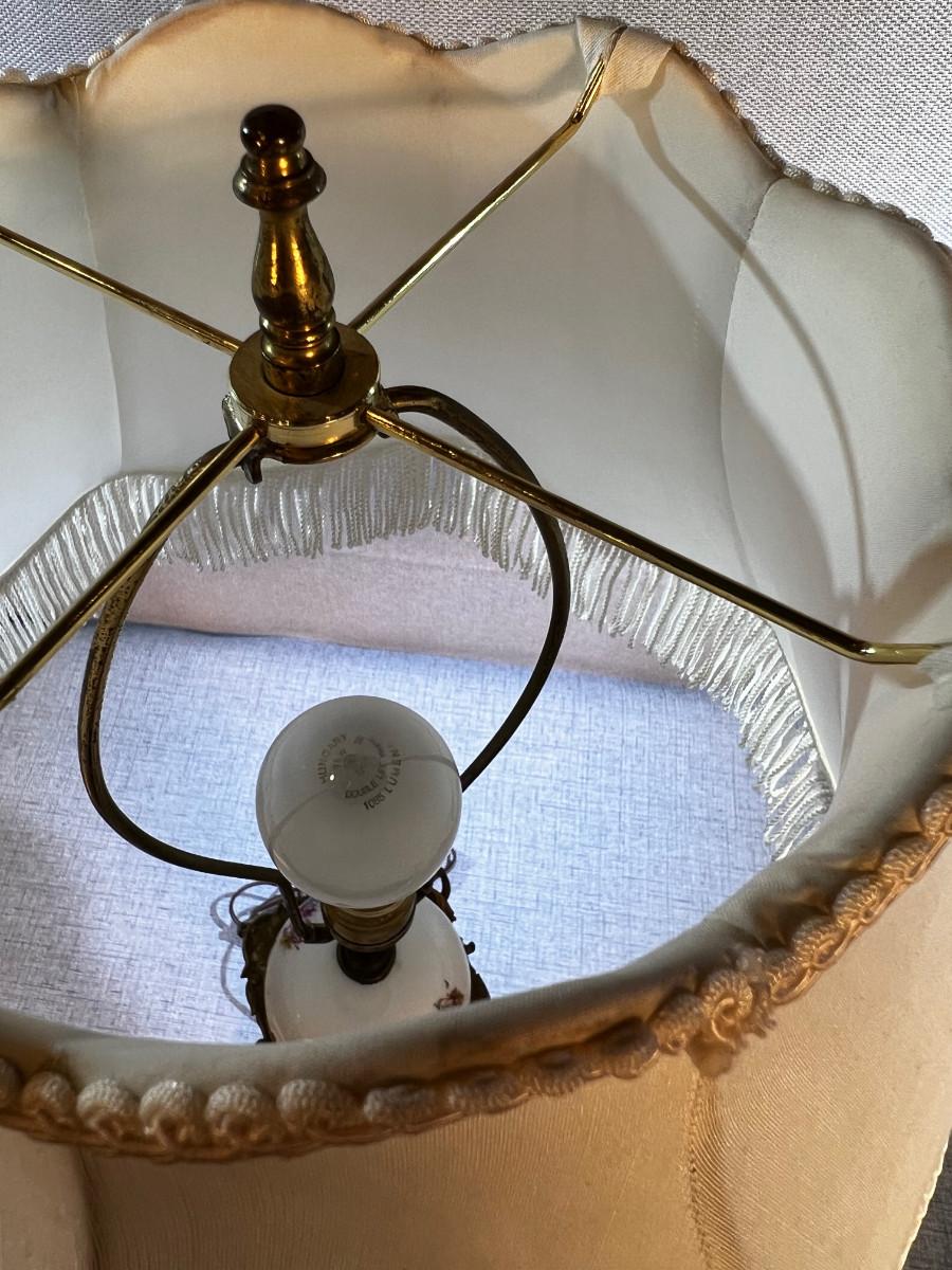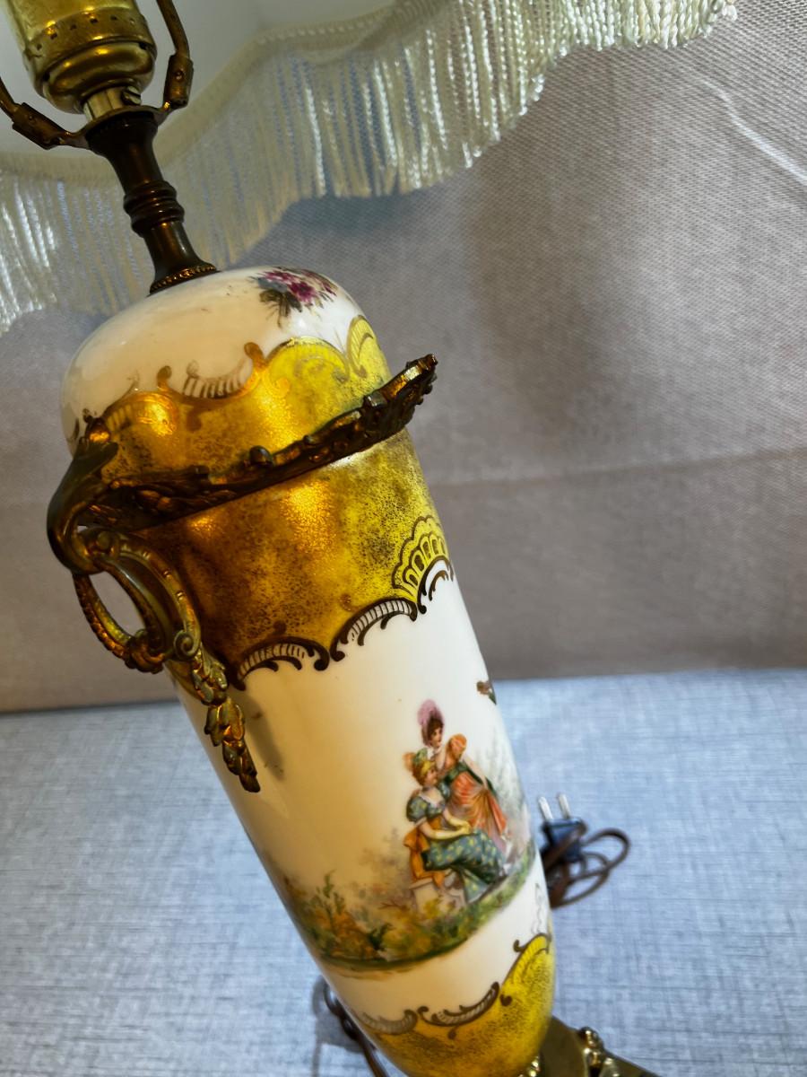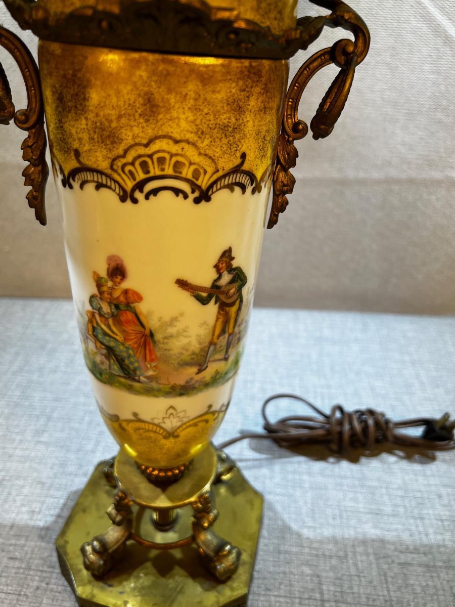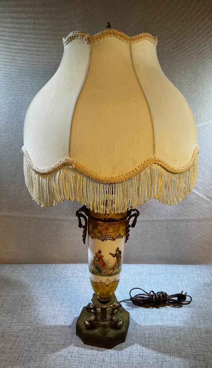 Antique Porcelain and Brass Lamp with Fringe Shade Musician Playing to 2 women.
