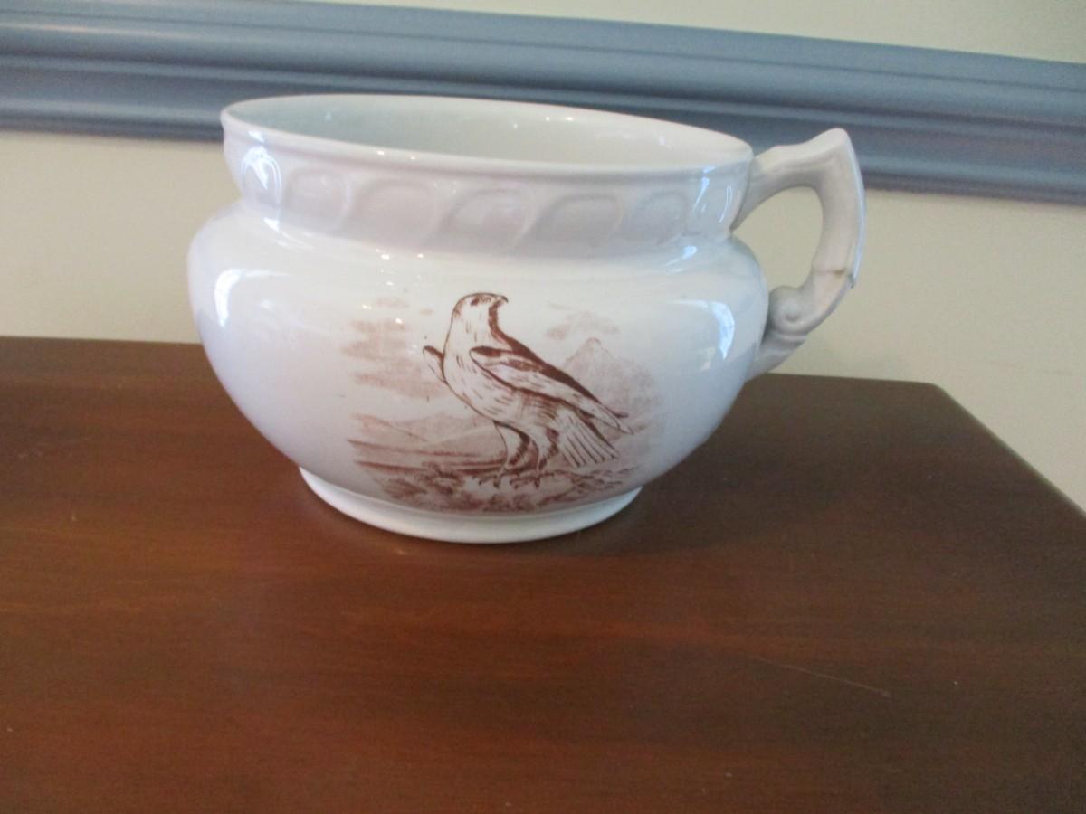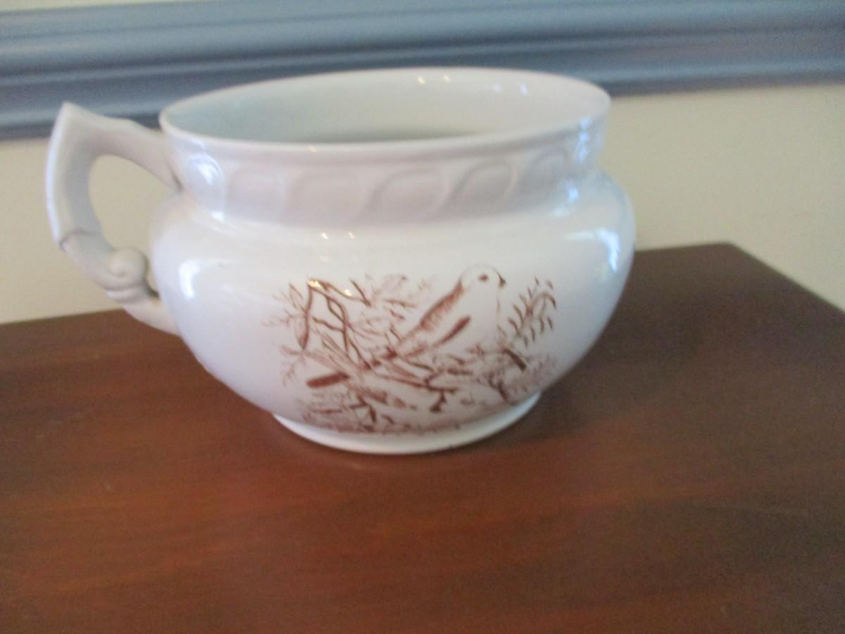 Antique Porcelain Chamber Pot Birds On Both Sides Transferware (DR)