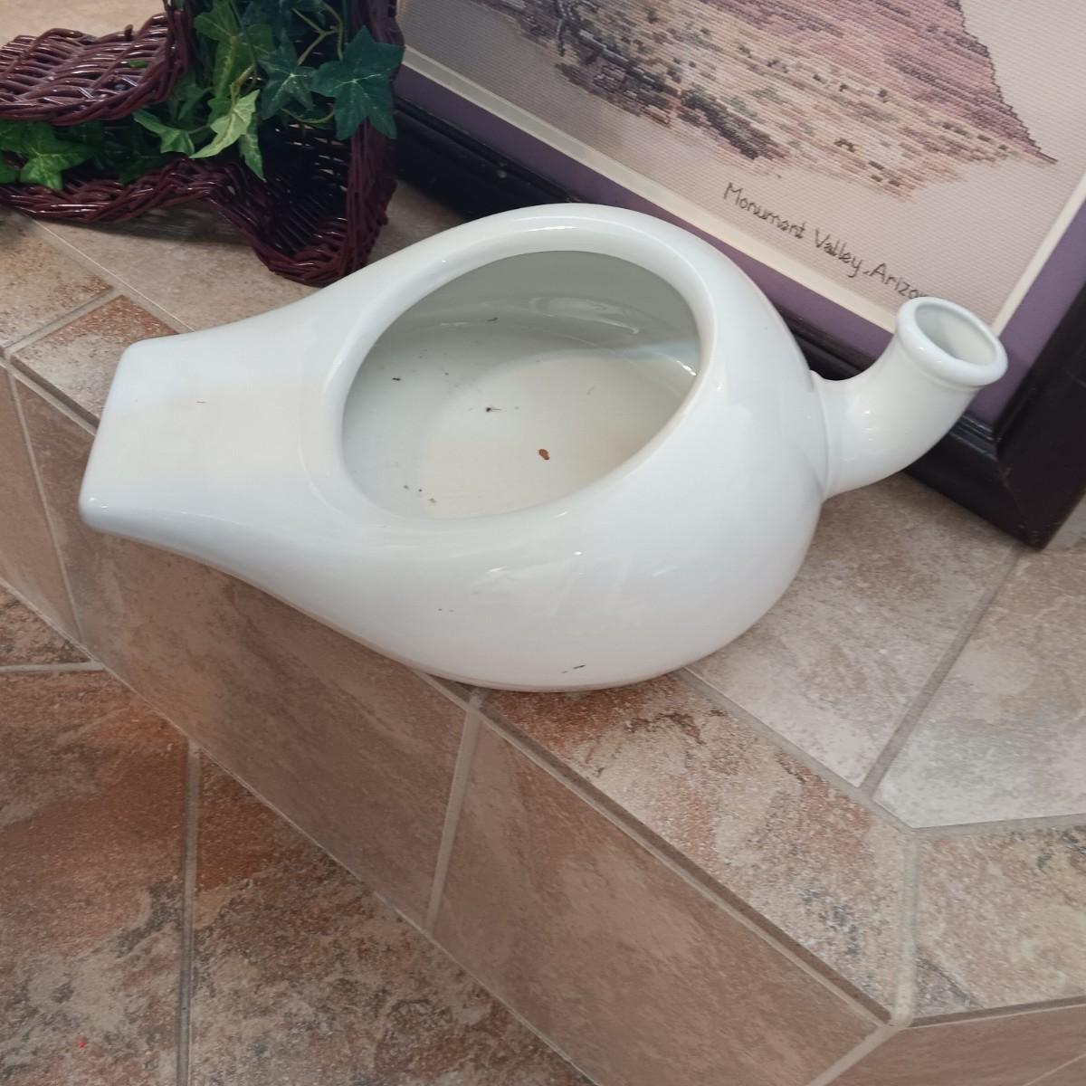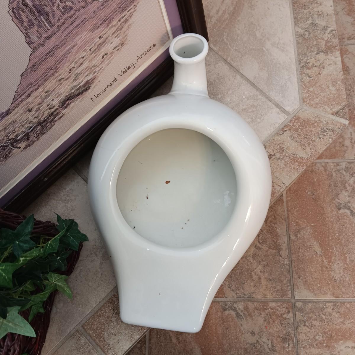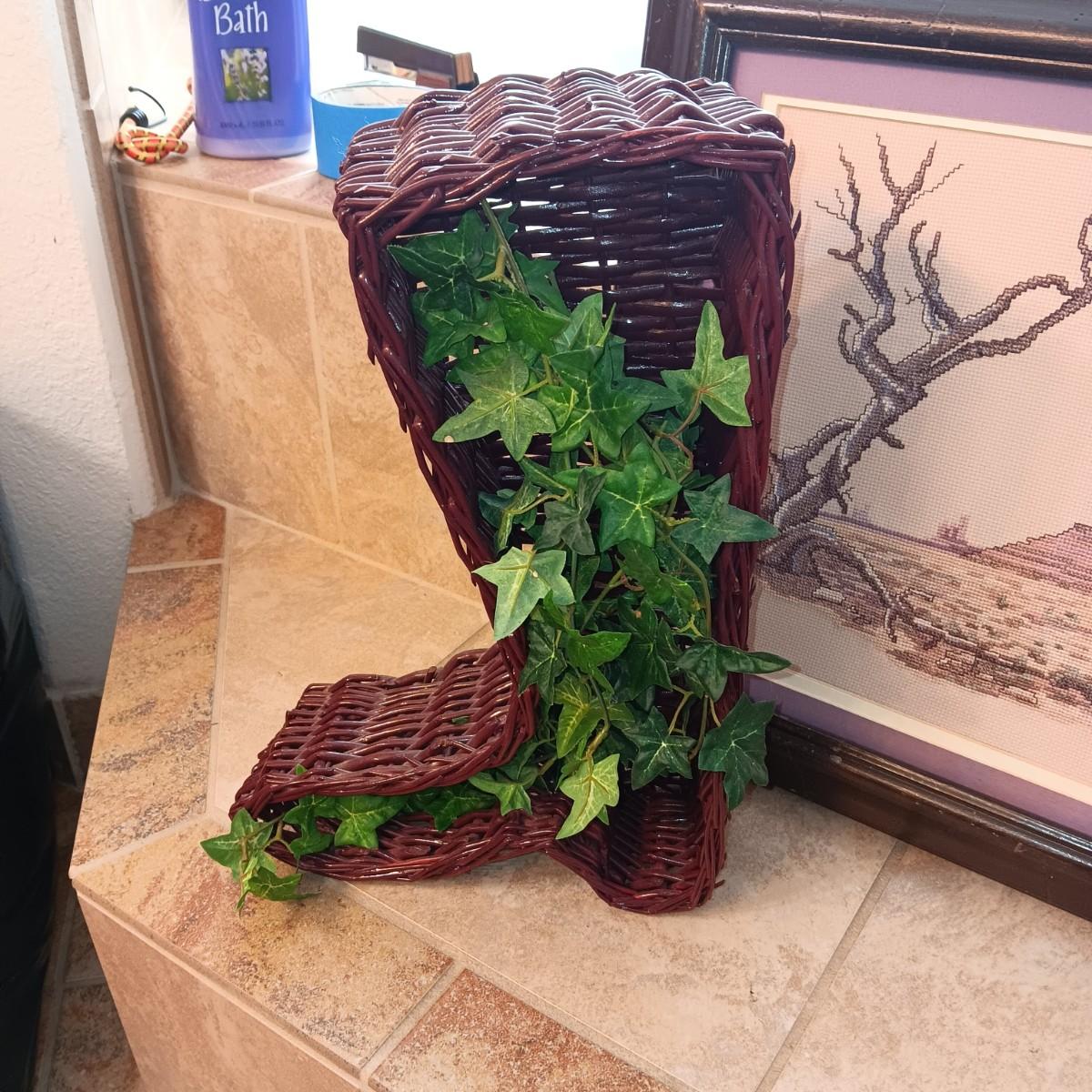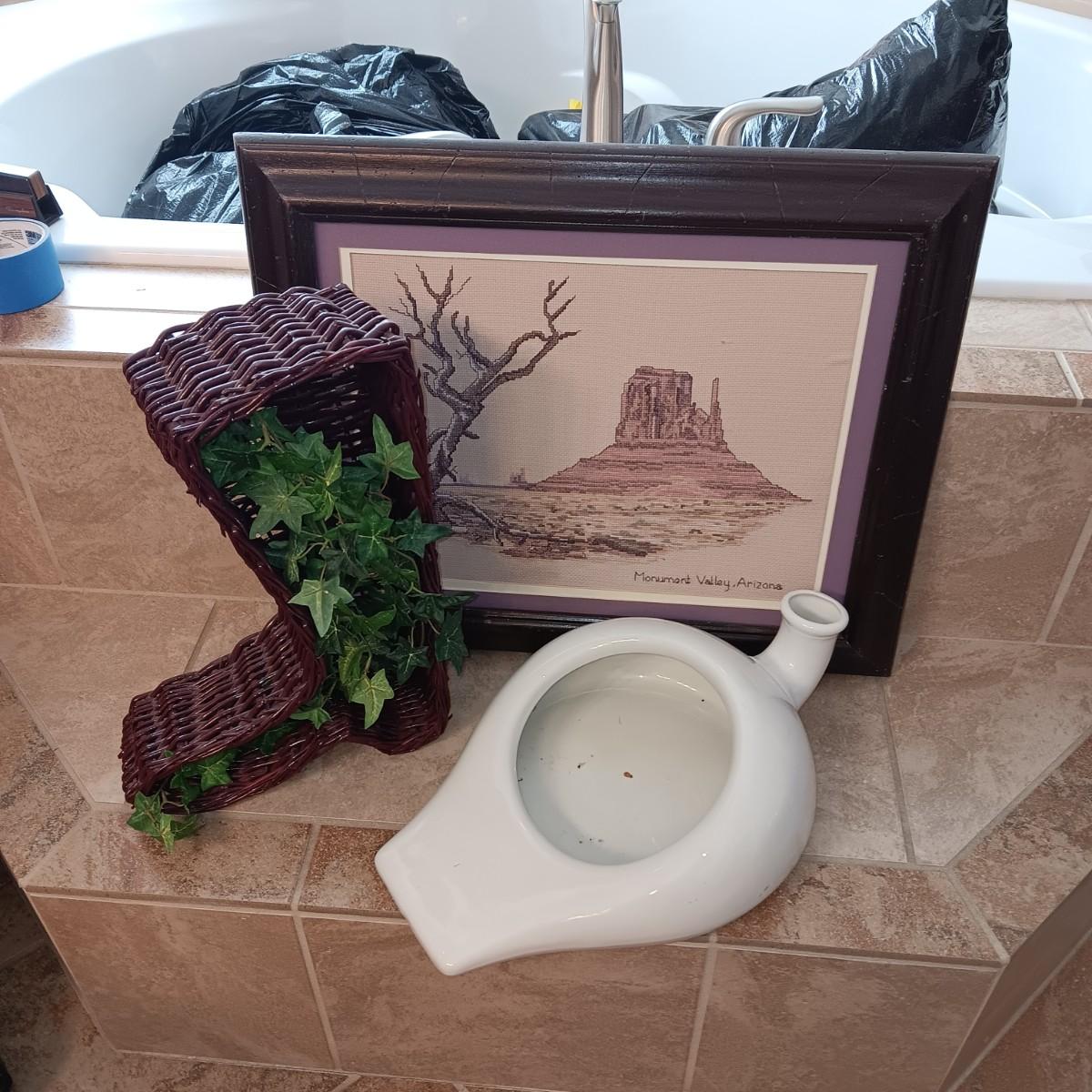 ANTIQUE PORCELAIN COMMODE, NEEDLEPOINT PICTURE AND WICKER BOOT