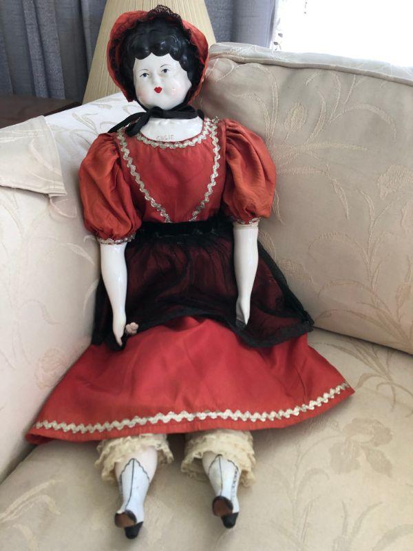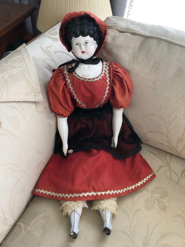 An antique doll named "Susie". She has porcelain bust, lower arms, and legs. The rest of her body is a soft body. I did not find any other markings on her but didn't undress completely. 27" long. Good Condition, except toe of one shoe, is chipped.