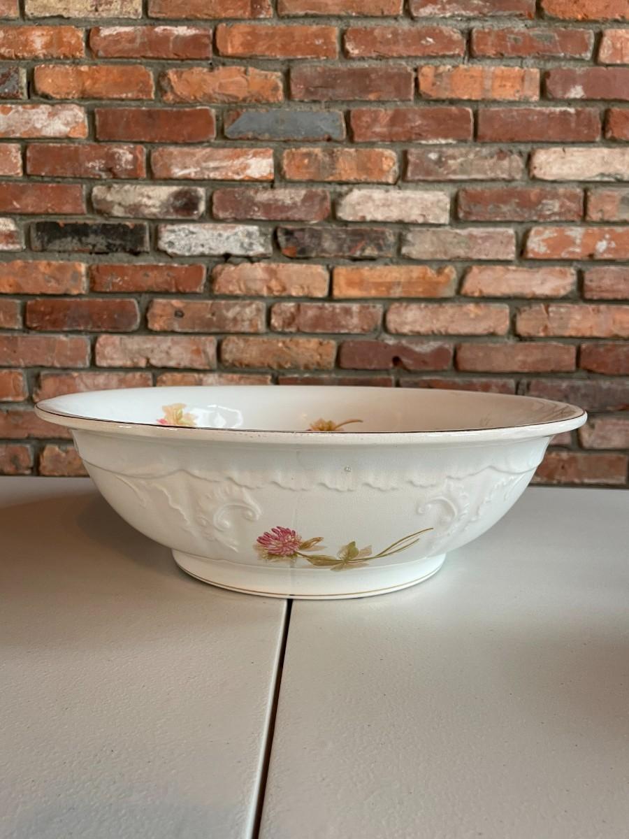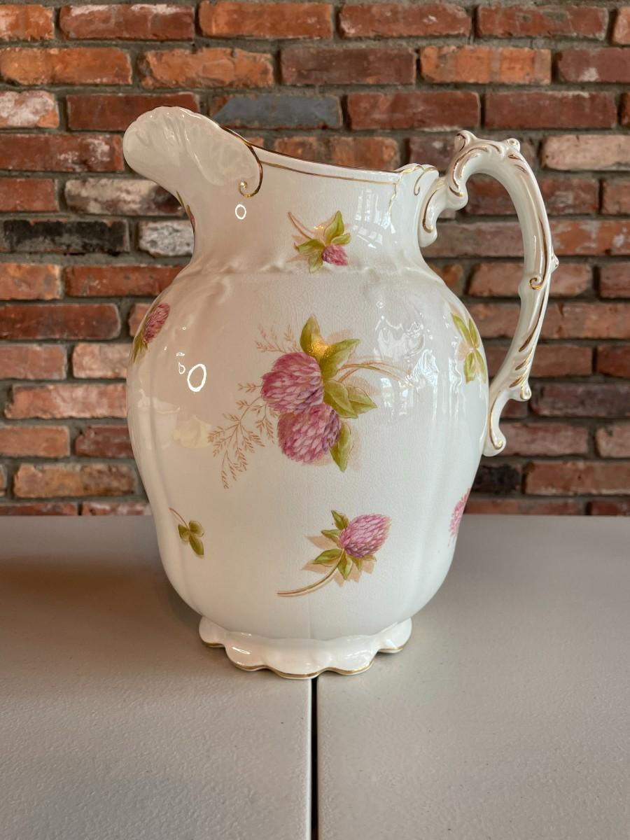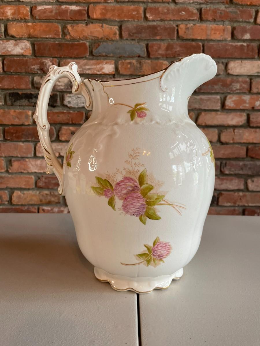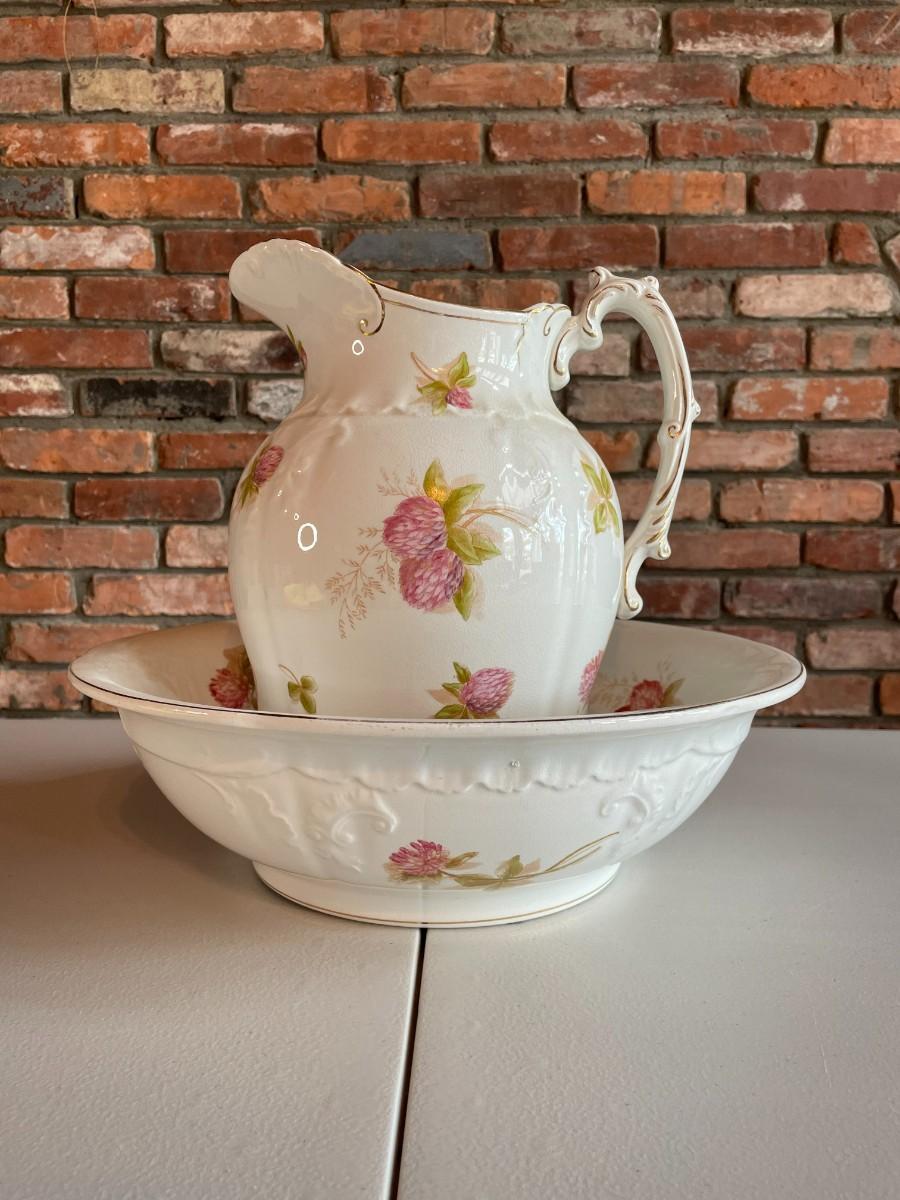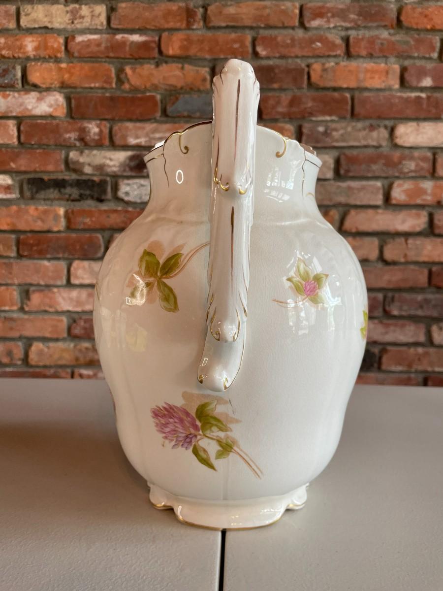 K.T. & K. Knowles, Taylor, & Knowles pitcher and bowl set. Beautiful floral pattern. Semi-Vitreous porcelain. Both the pitcher and bowl are in beautiful condition. Bowl: 15w x 4 1/2h. Pitcher: 19w x 12h.