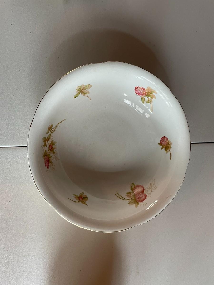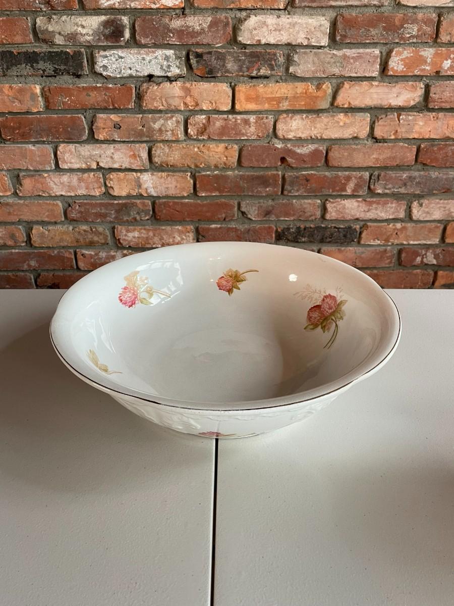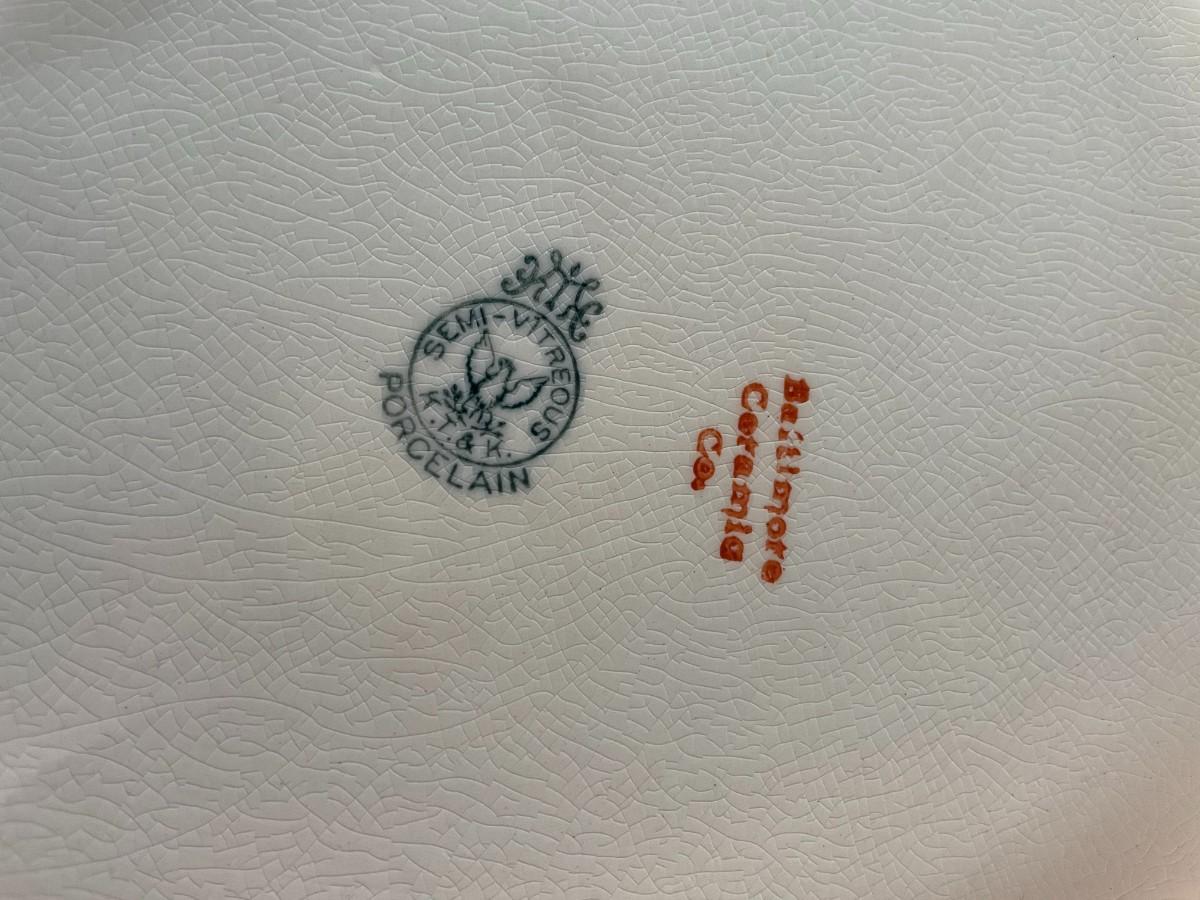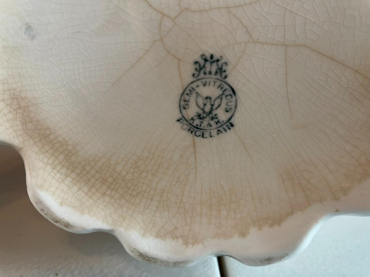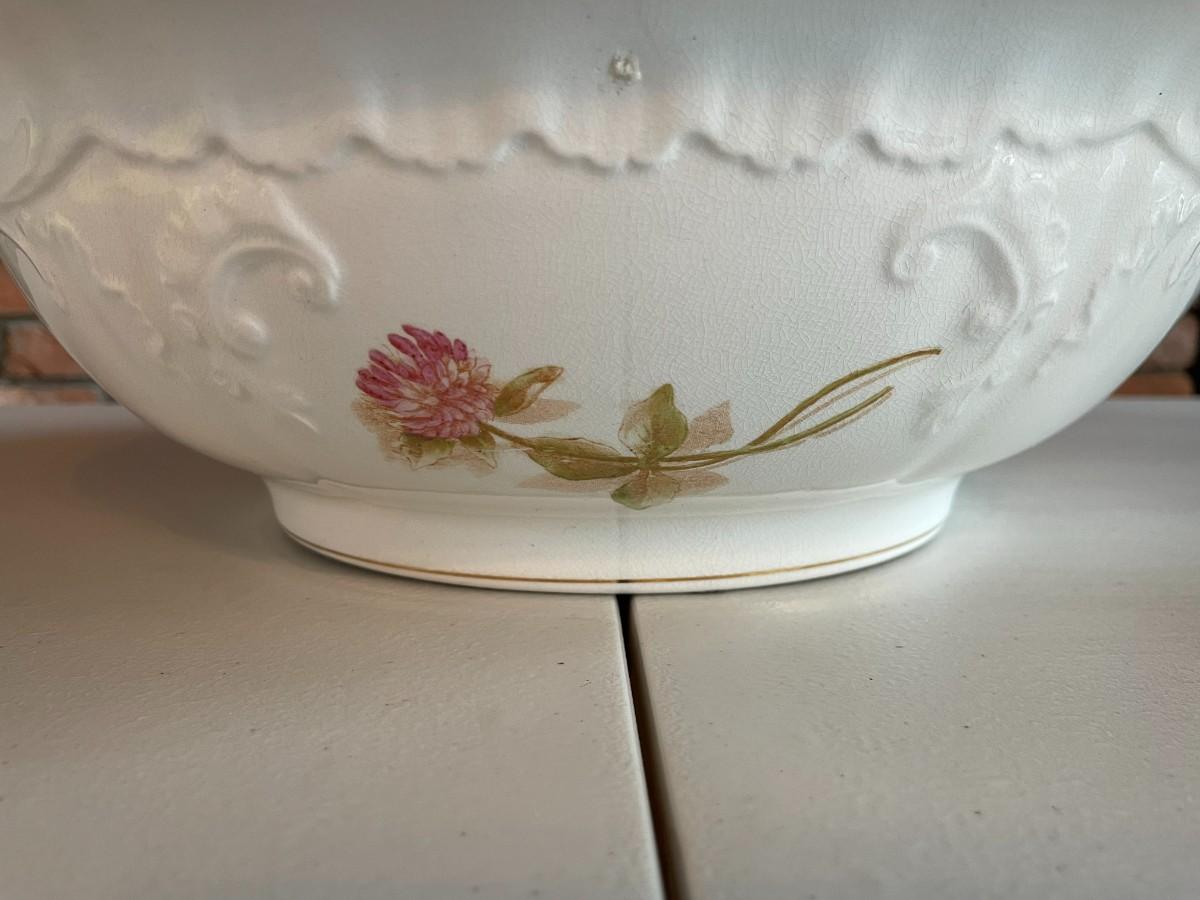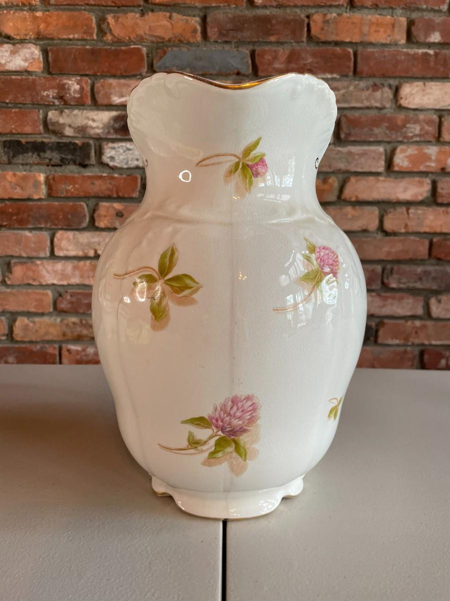 K.T. & K. Knowles, Taylor, & Knowles pitcher and bowl set. Beautiful floral pattern. Semi-Vitreous porcelain. Both the pitcher and bowl are in beautiful condition. Bowl: 15w x 4 1/2h. Pitcher: 19w x 12h.