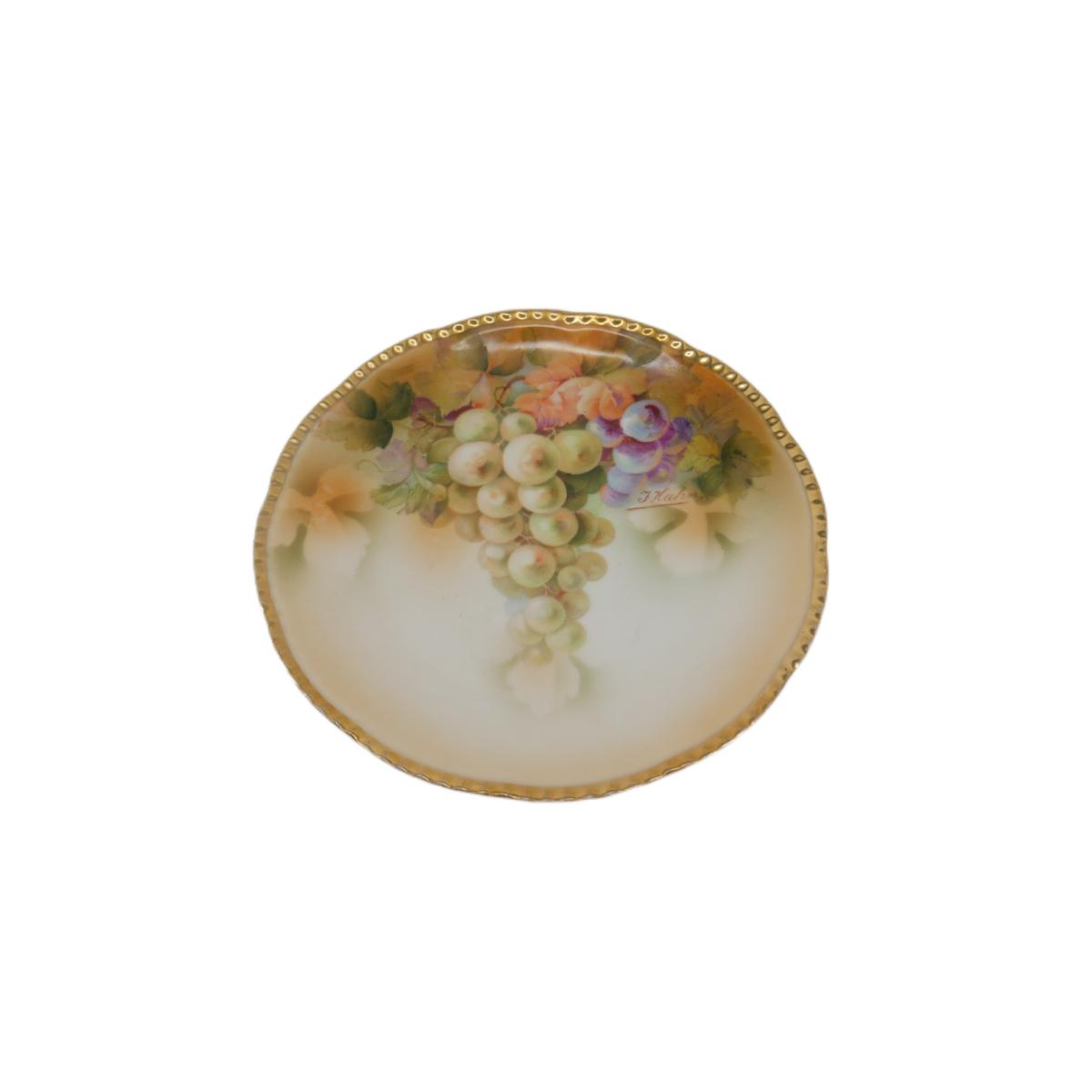 Antique (c.1905 - c. 1920) hand painted porcelain green grapes and gold trimmed scalloped plated and ruffled bowls. Each signed by artist, F. Hahn. Marked "Hand Painted, Prussia, Royal Rudolstadt" on bottom. Crown with "B" indicates maker was Beyer & Bock , made in Germany. Six plates that measure approximately 6" in diameter. All look to be in great condition, no major chips or cracks. Some wear to paint from age and use. Five bowls that measures approximately 5.25" in diameter and 1.5" in depth. A few bowls have chips and cracks around the edges (see photos). Wear to paint from age and use. Lot weighs 3 lbs. (G38)