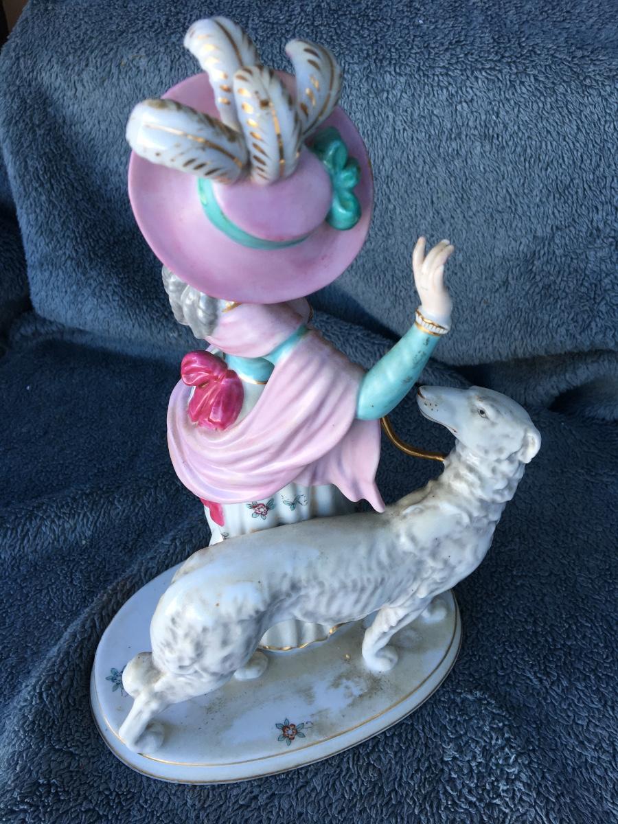 Antique Porcelain Sculpture Woman with Dog 13”h