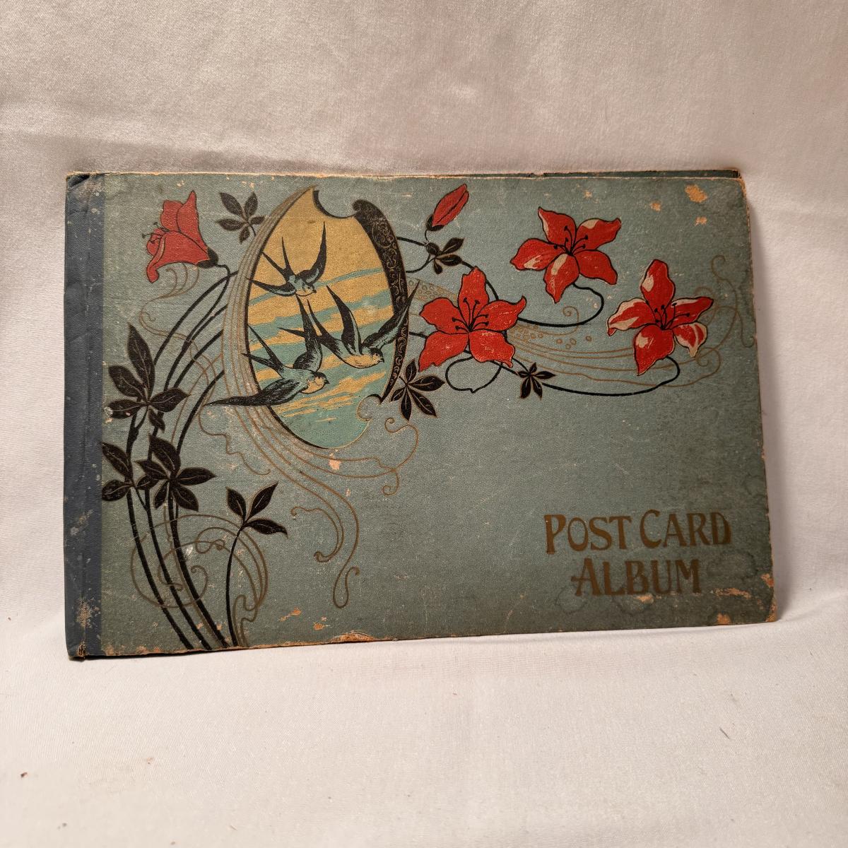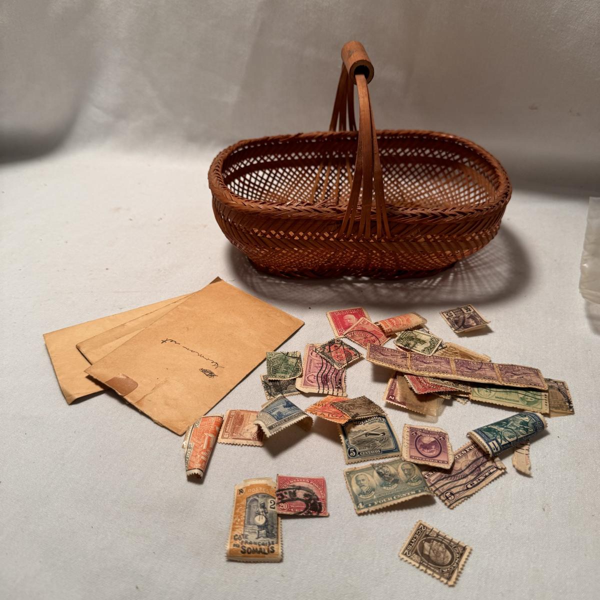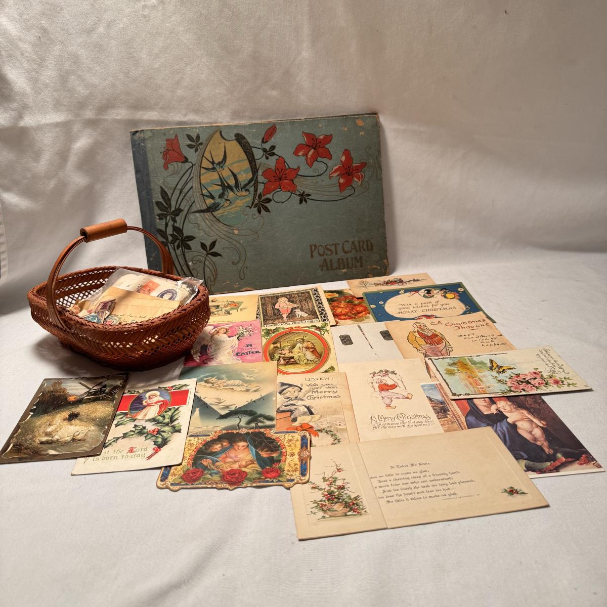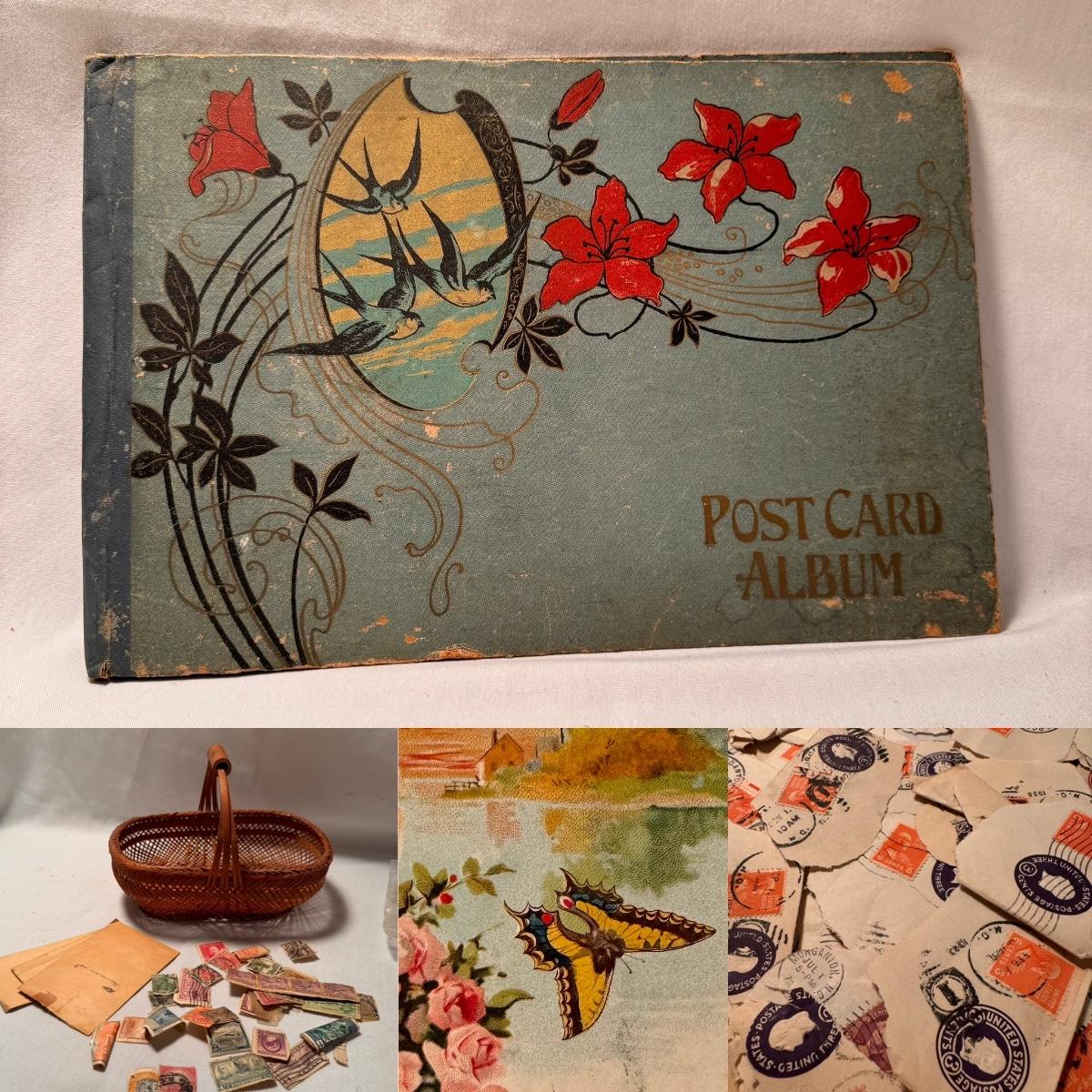 This lot includes one empty post card album, one basket, several vintage stamps, and over fifteen antique post cards. The post card album measures 14” x 9.25”H. Shipping available. All sales are final. No returns or refunds. Please bid accordingly.