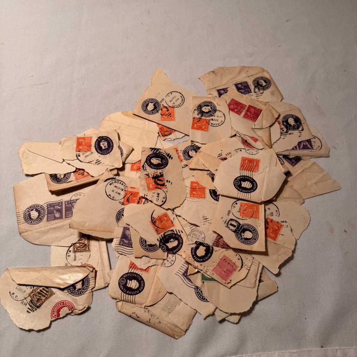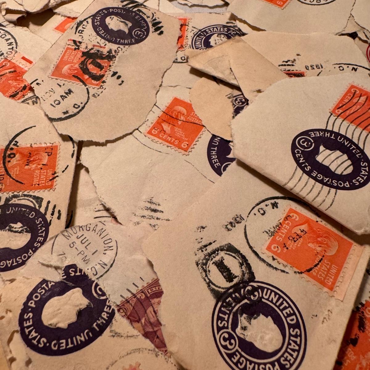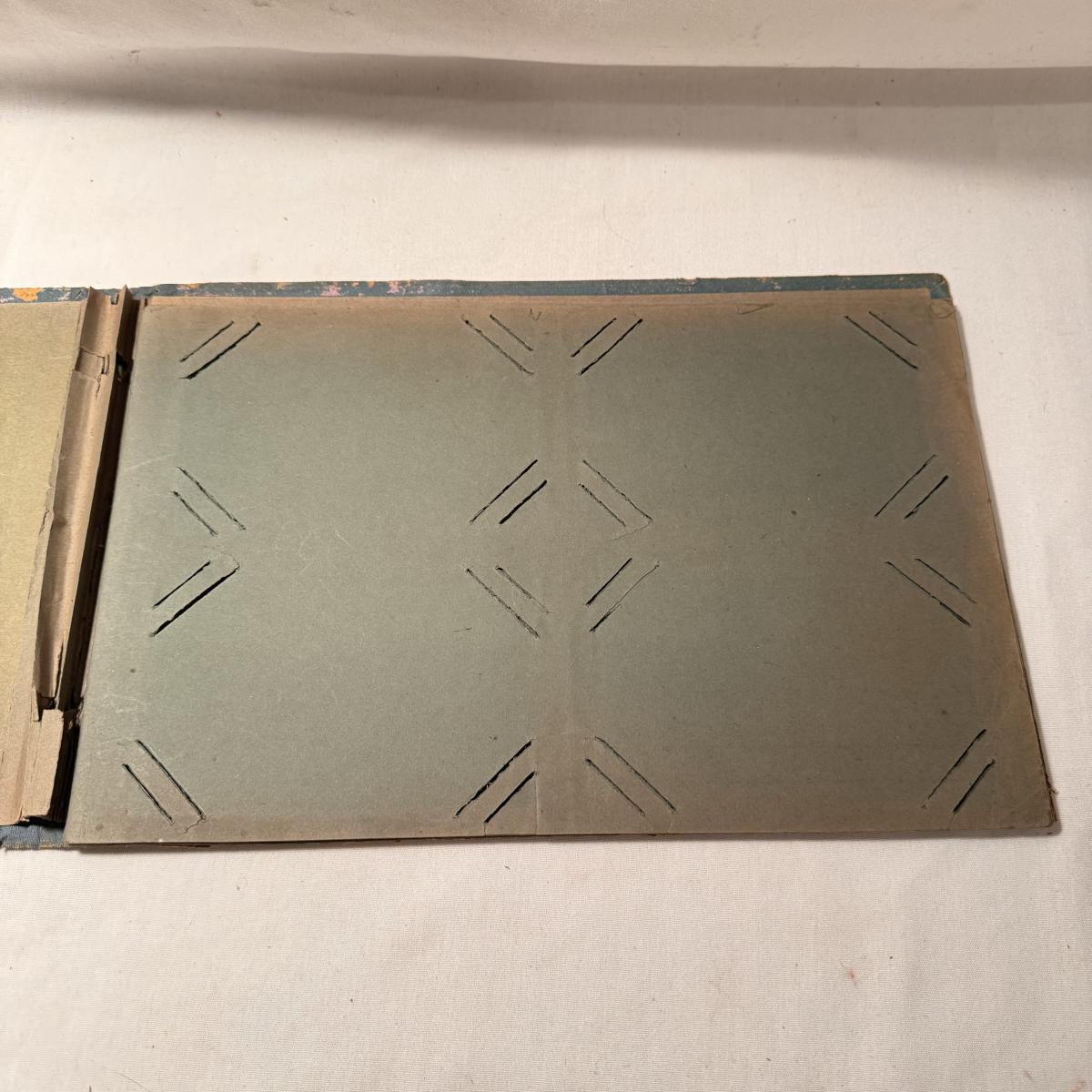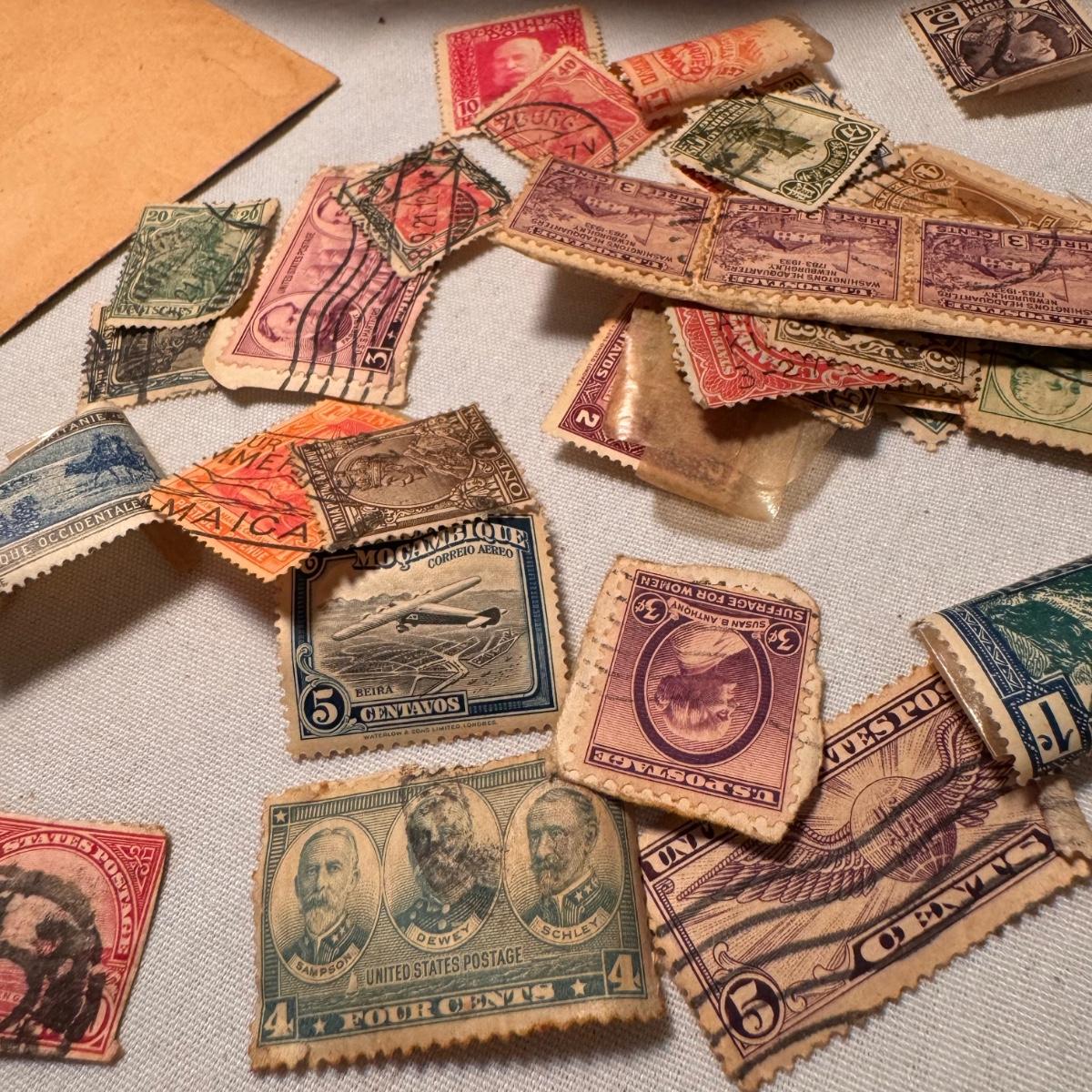 This lot includes one empty post card album, one basket, several vintage stamps, and over fifteen antique post cards. The post card album measures 14” x 9.25”H. Shipping available. All sales are final. No returns or refunds. Please bid accordingly.