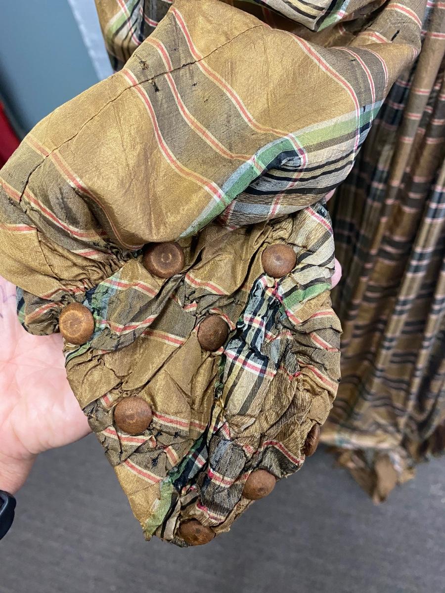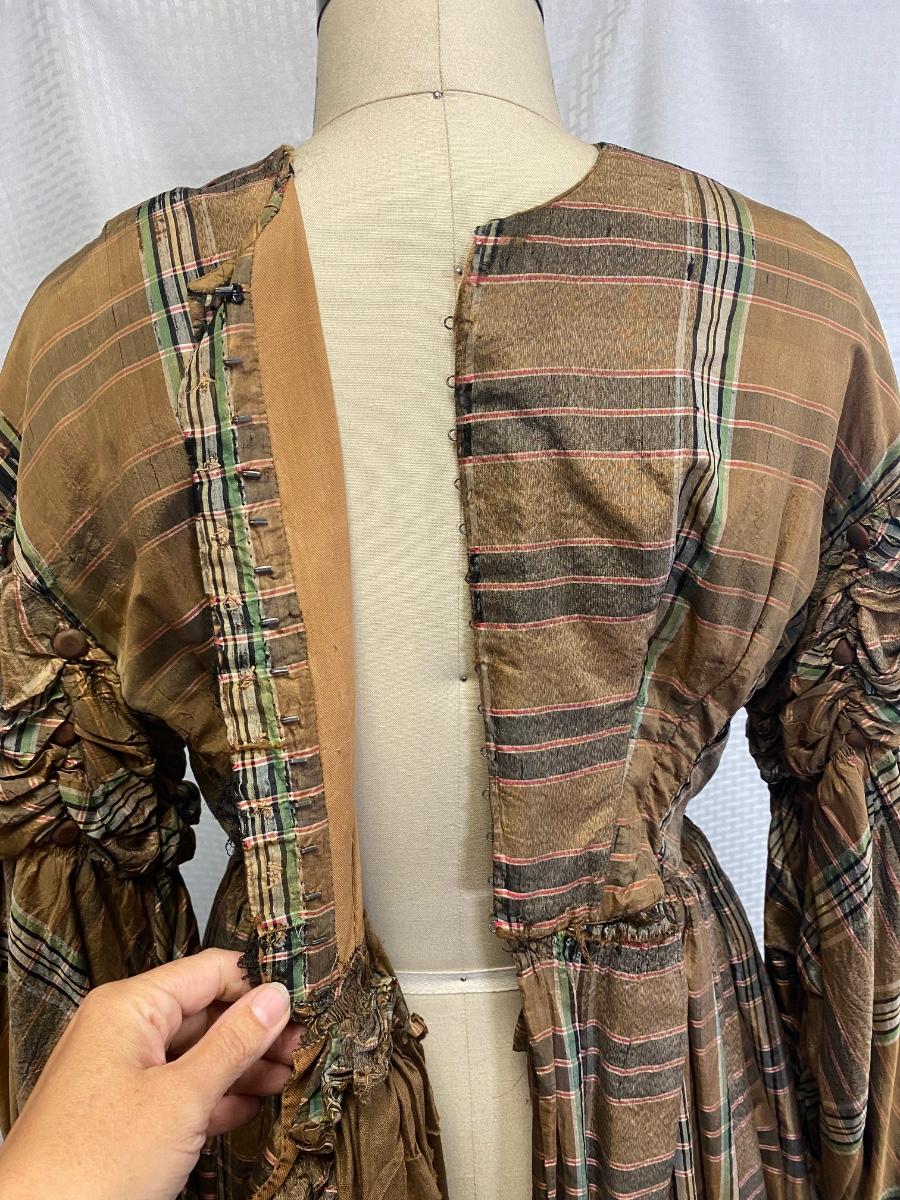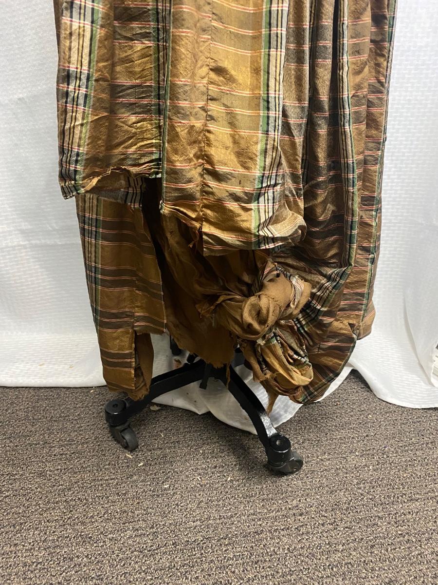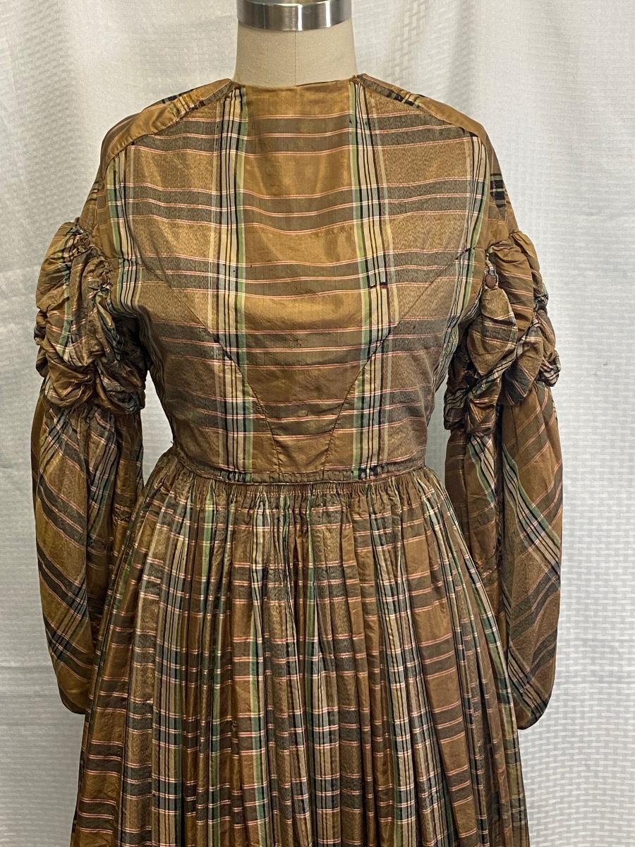Antique Post Civil War Era Late 1860s Silk Plaid Wedding Dress. In antique condition, fabric has been torn at the bottom and is very delicate. Fits the size 8 mannequin but has an odd cut to the dress. Good for display or reference.