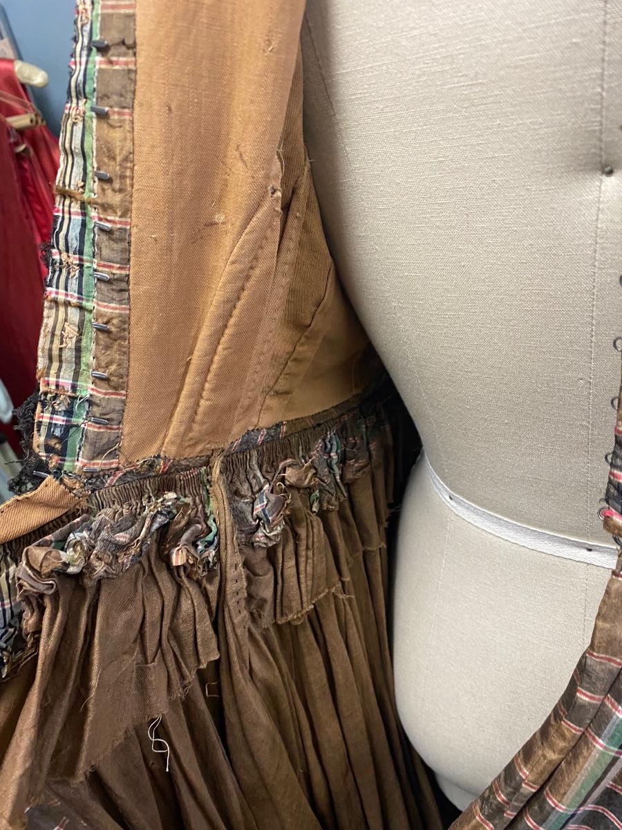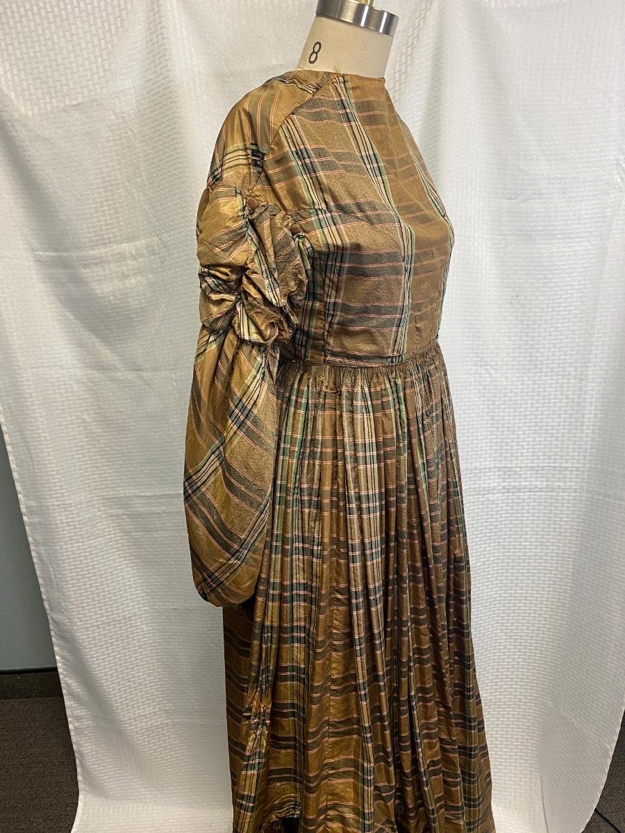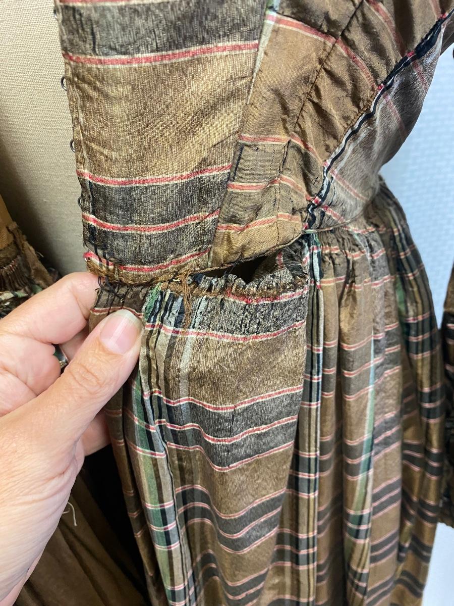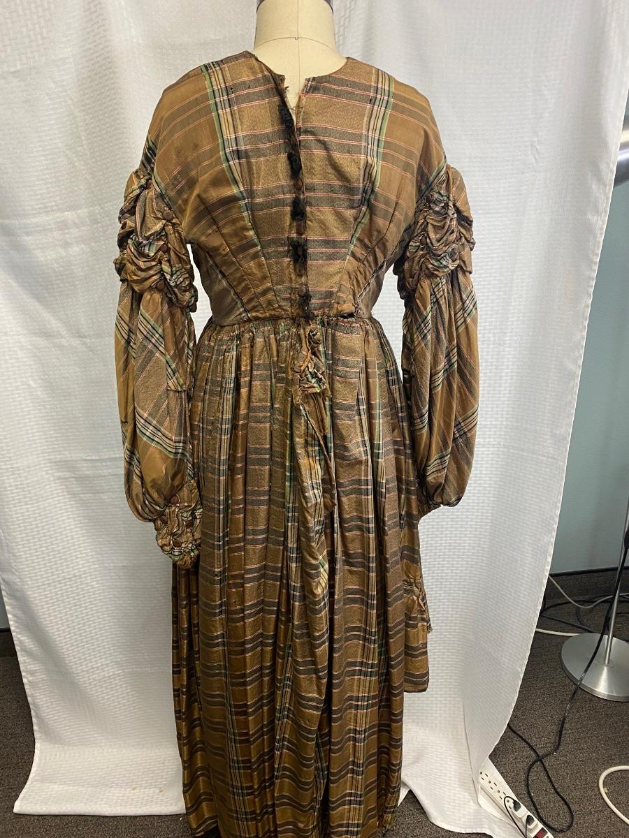 Antique Post Civil War Era Late 1860s Silk Plaid Wedding Dress. In antique condition, fabric has been torn at the bottom and is very delicate. Fits the size 8 mannequin but has an odd cut to the dress. Good for display or reference.