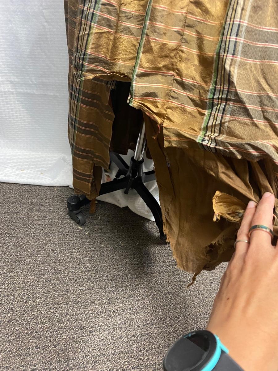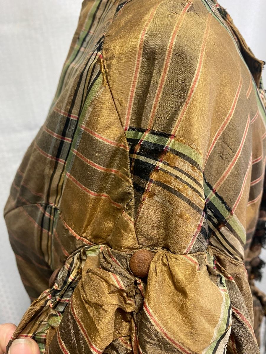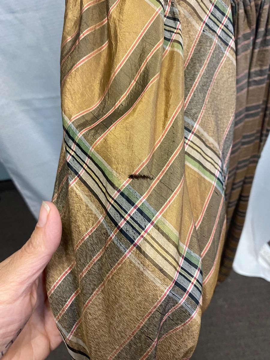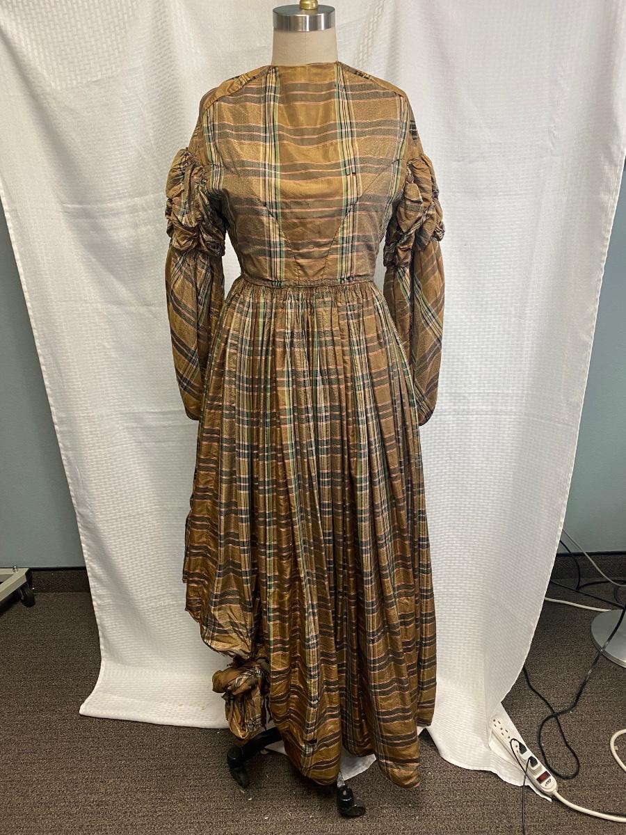 Antique Post Civil War Era Late 1860s Silk Plaid Wedding Dress. In antique condition, fabric has been torn at the bottom and is very delicate. Fits the size 8 mannequin but has an odd cut to the dress. Good for display or reference.