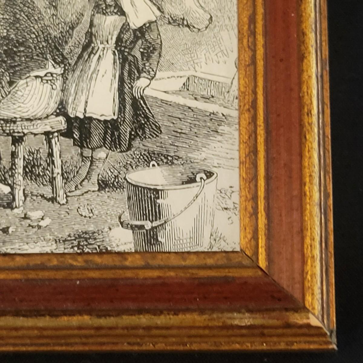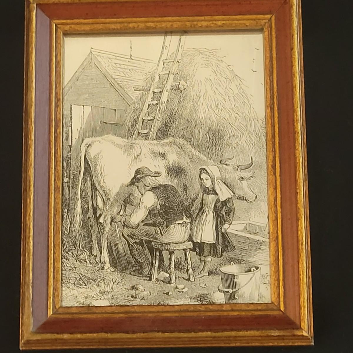 This lot also includes a reverse painted mirror of what appears to be an English farm scene. This piece resembles a stamped block print on a thin mirror with a wooden frame. Measures 4" x .5" x 5". Shipping available
