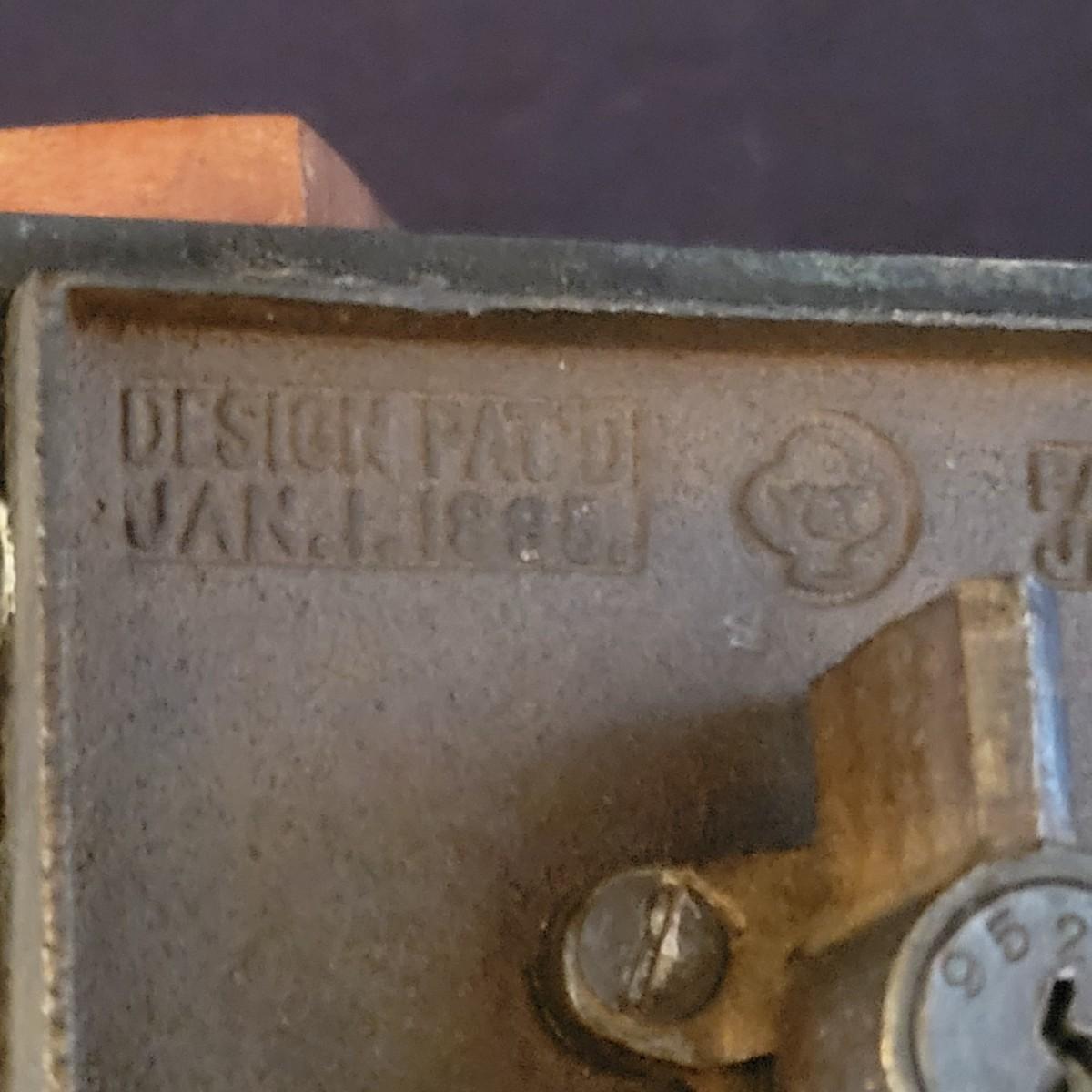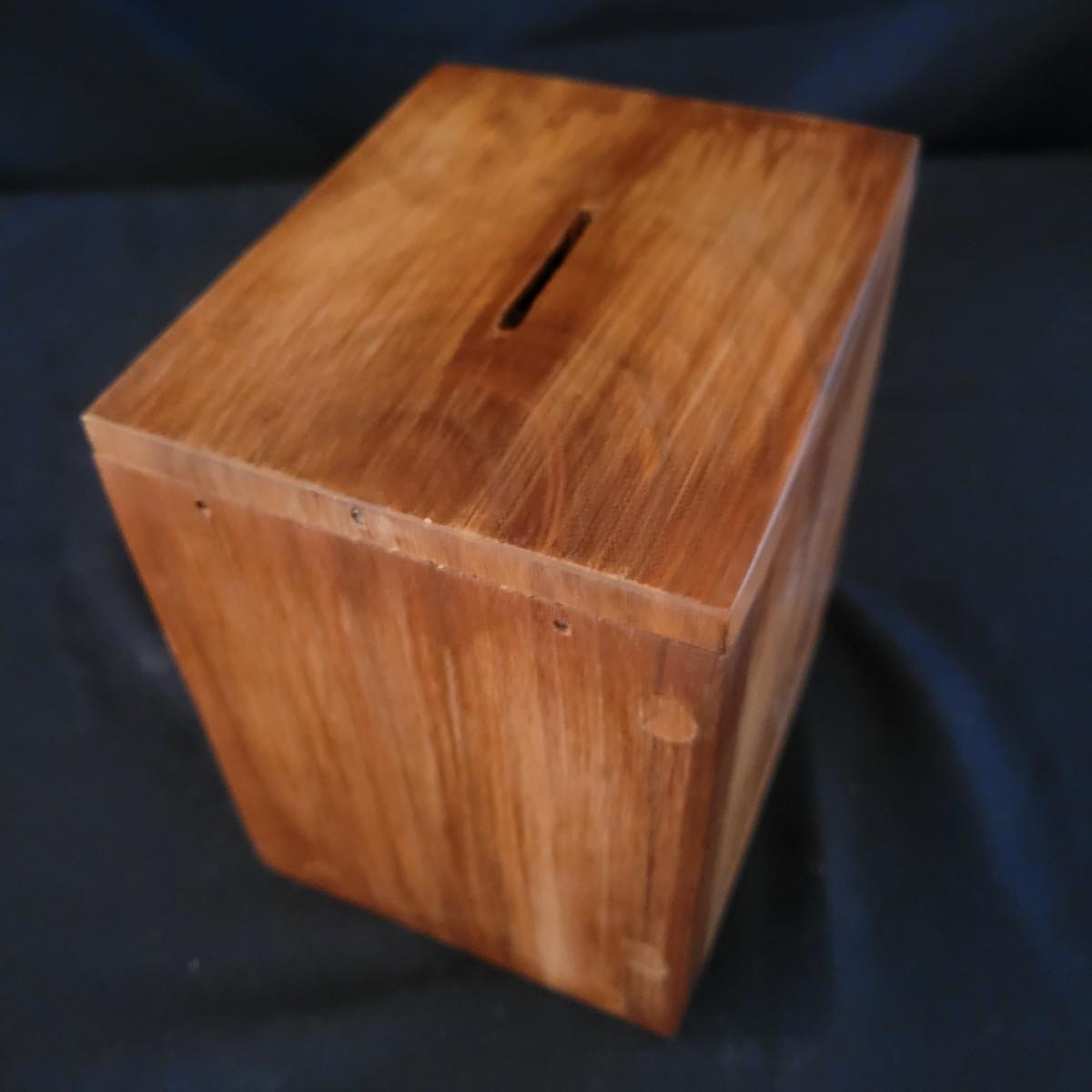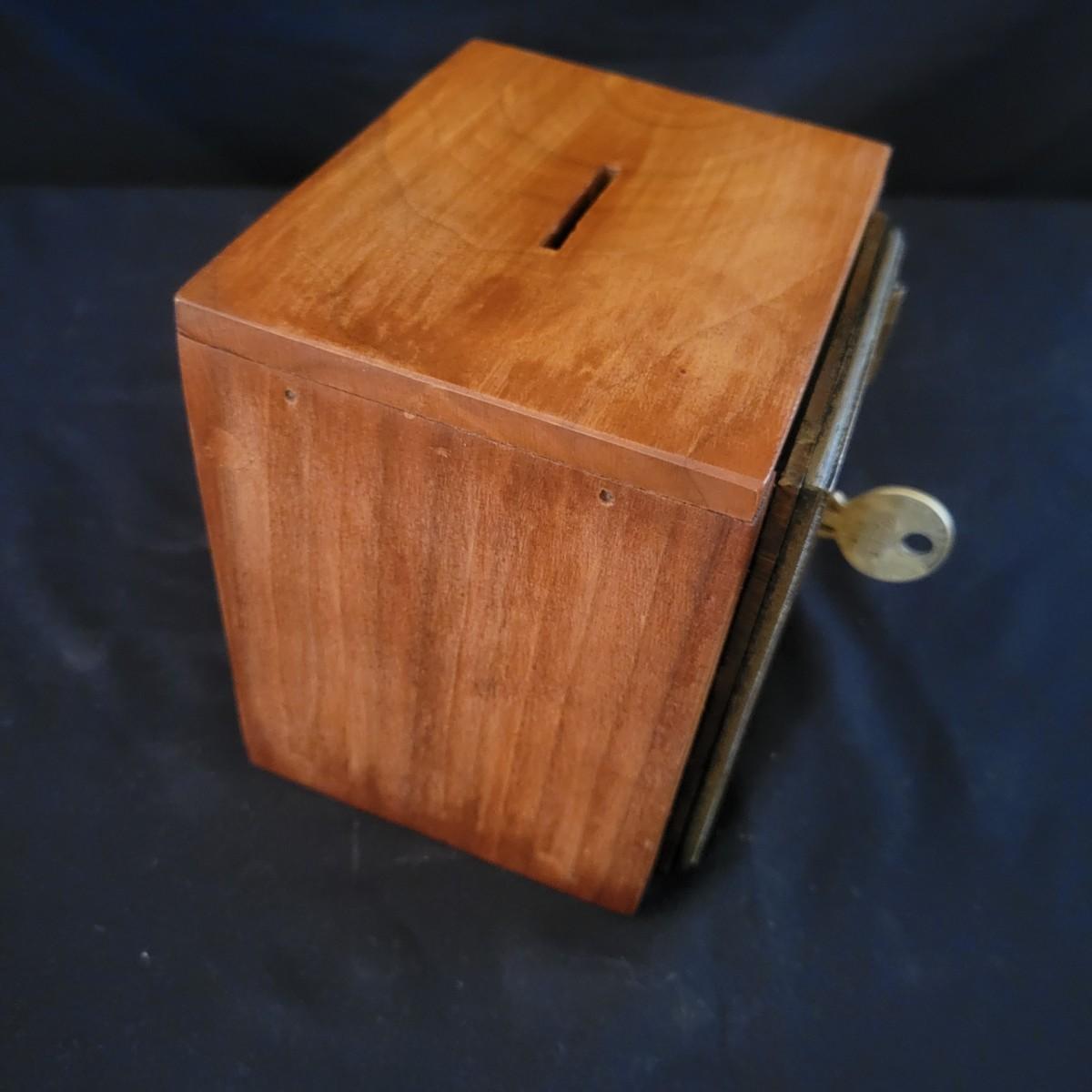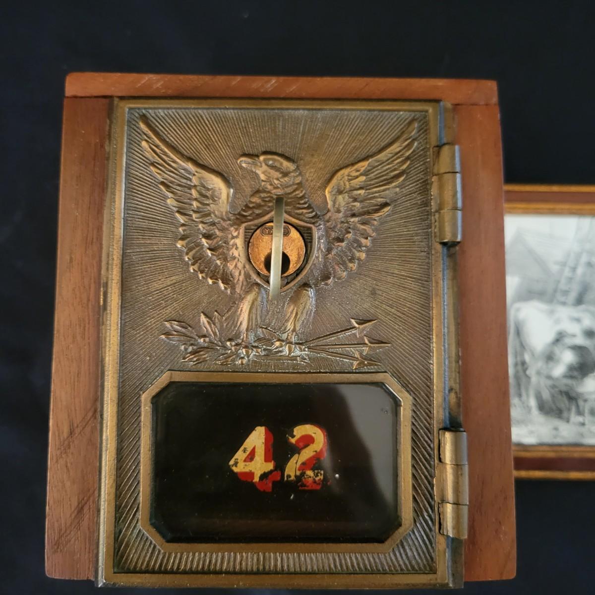 An antique door from a post office mailbox that has been turned jnto a piggy bank. Door is made of brass with an eagle and a glass viewing window. Measures approximately 5" x 4.5" x 5".