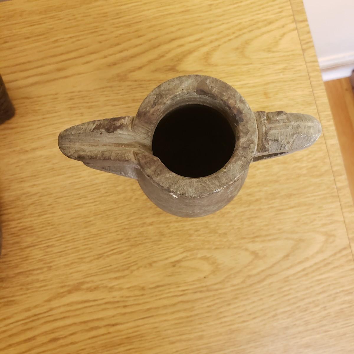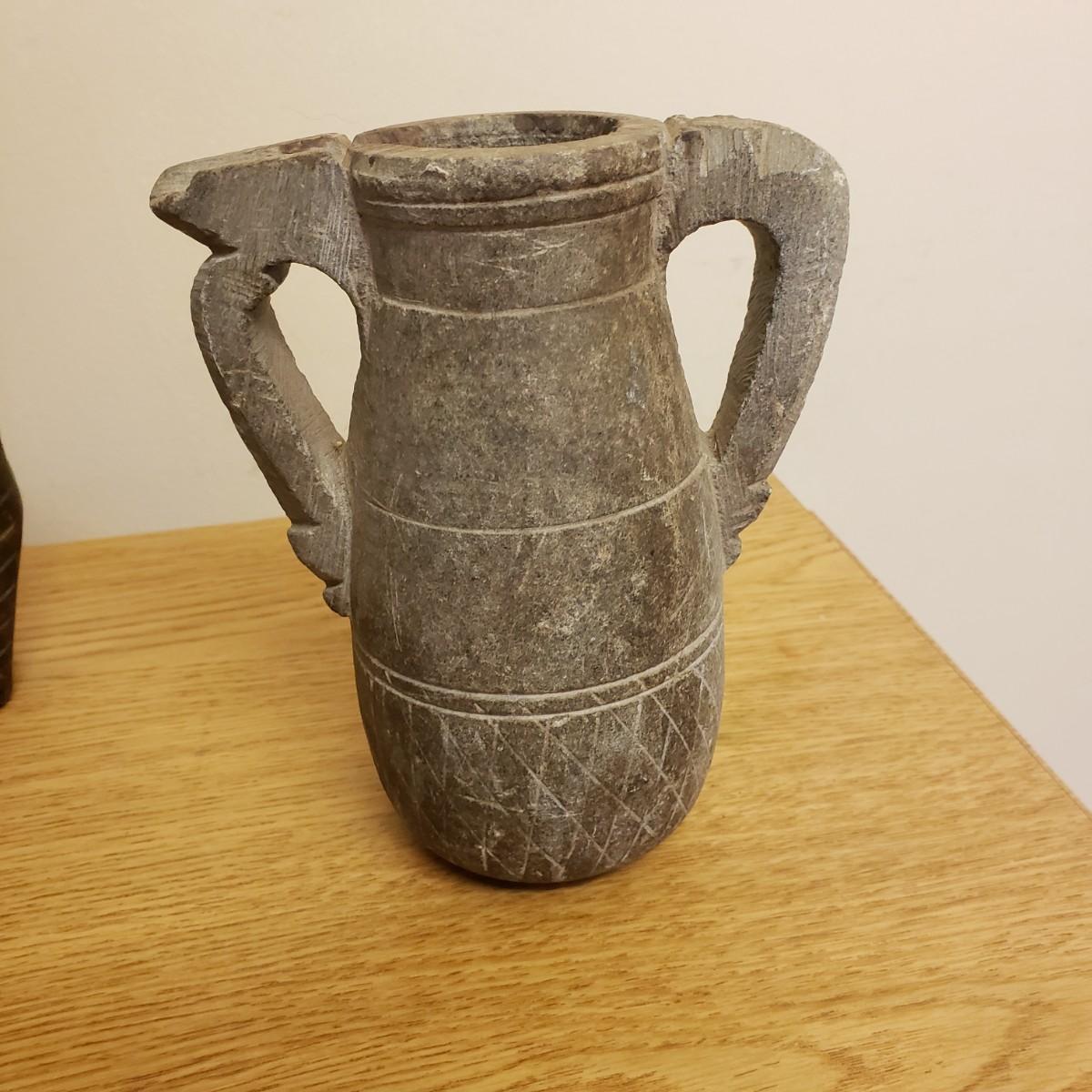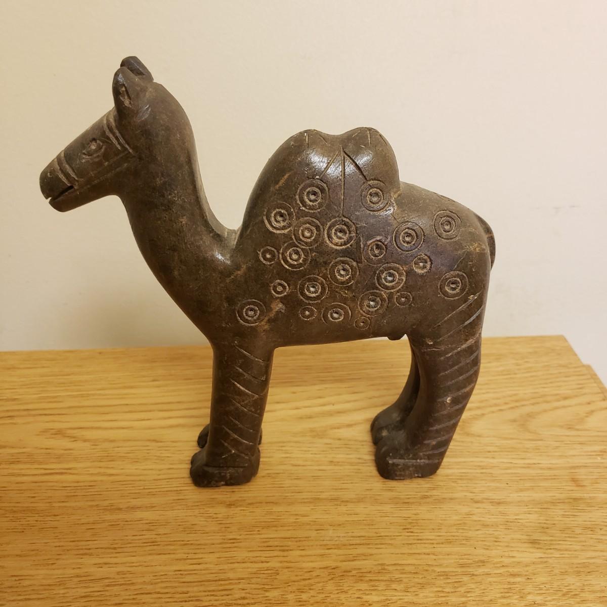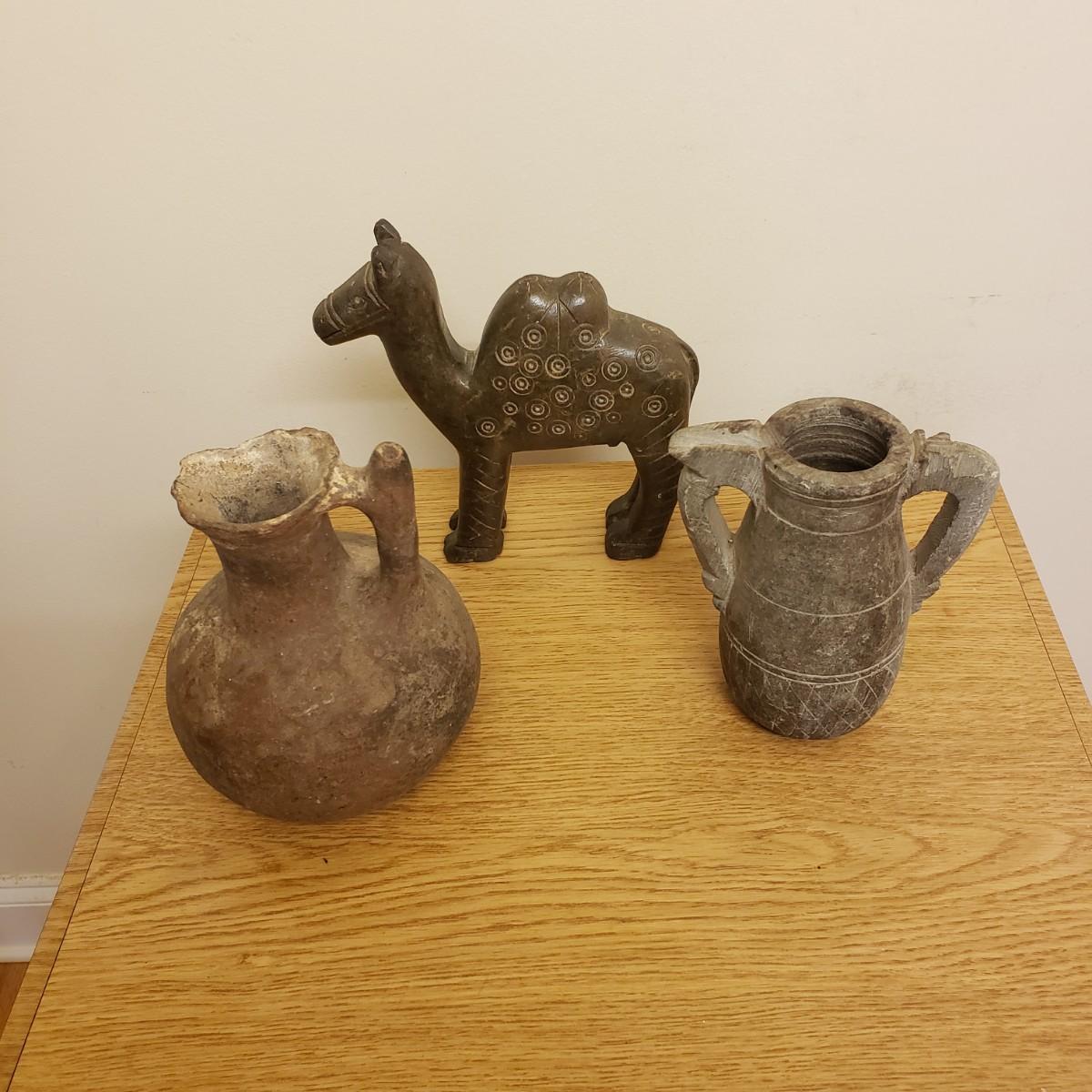 This three piece lot features two pitchers and a carved stone camel. The camel measures 8" x 2" x 8"H. It is heavy to the touch and has interesting carved features. The largest pitcher appears to be antique, yet there are no markings. The handle is fluted and rim has some wear. The smallest vase/pitcher feels like stone that has been carved. The one side near the handle appears like it has been carved out.