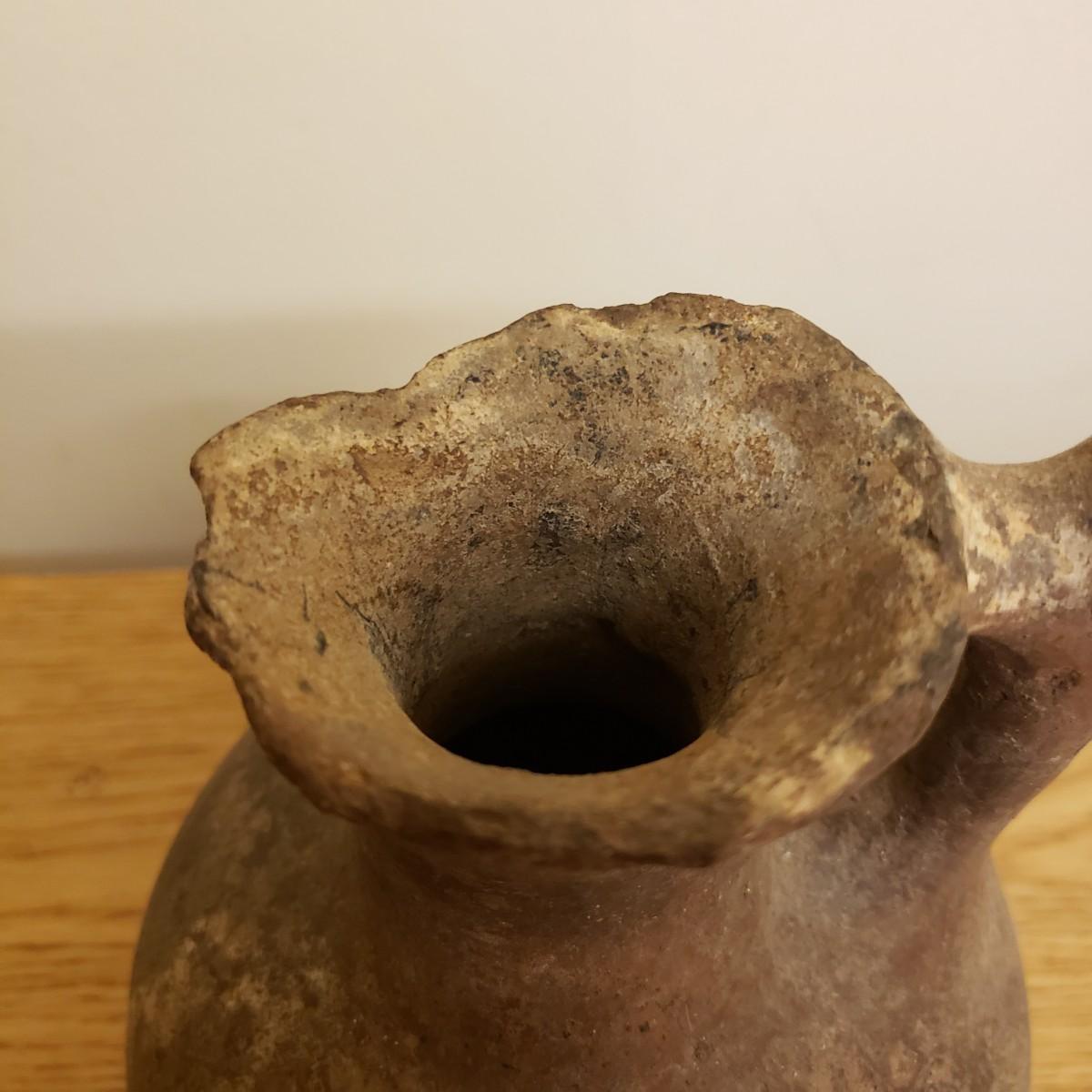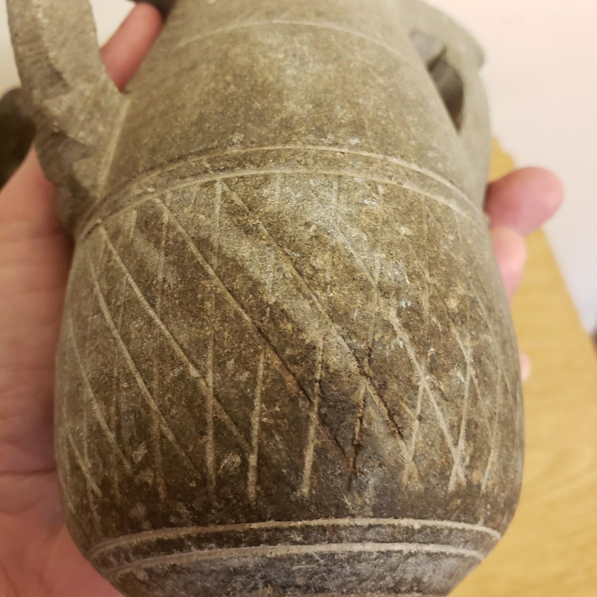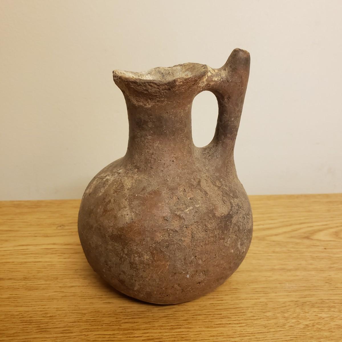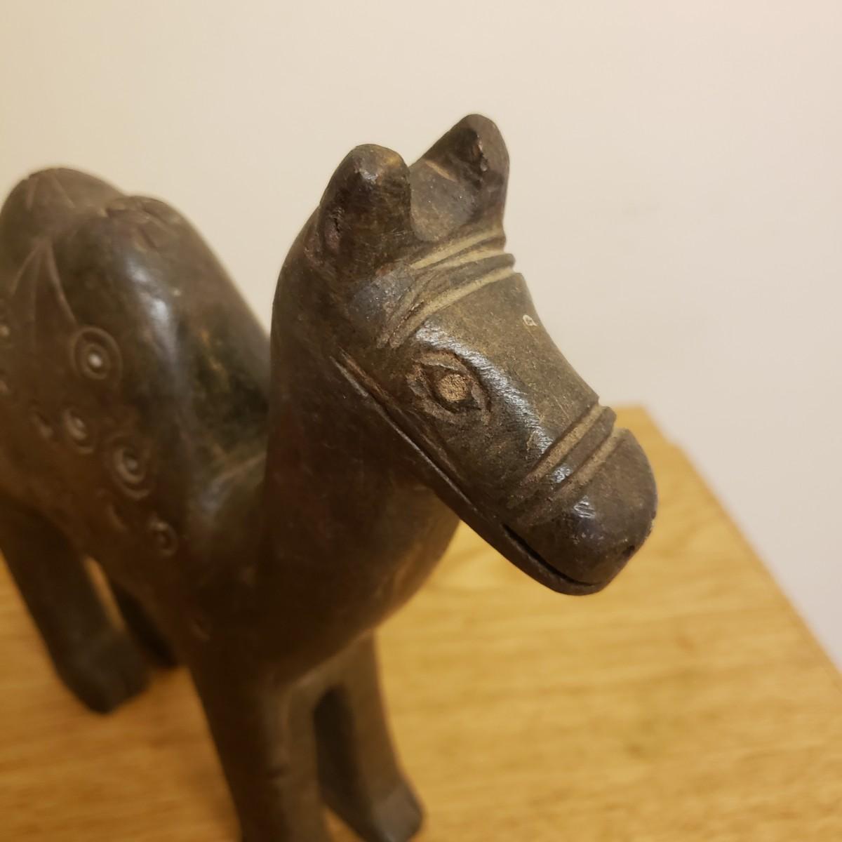 This three piece lot features two pitchers and a carved stone camel. The camel measures 8" x 2" x 8"H. It is heavy to the touch and has interesting carved features. The largest pitcher appears to be antique, yet there are no markings. The handle is fluted and rim has some wear. The smallest vase/pitcher feels like stone that has been carved. The one side near the handle appears like it has been carved out.