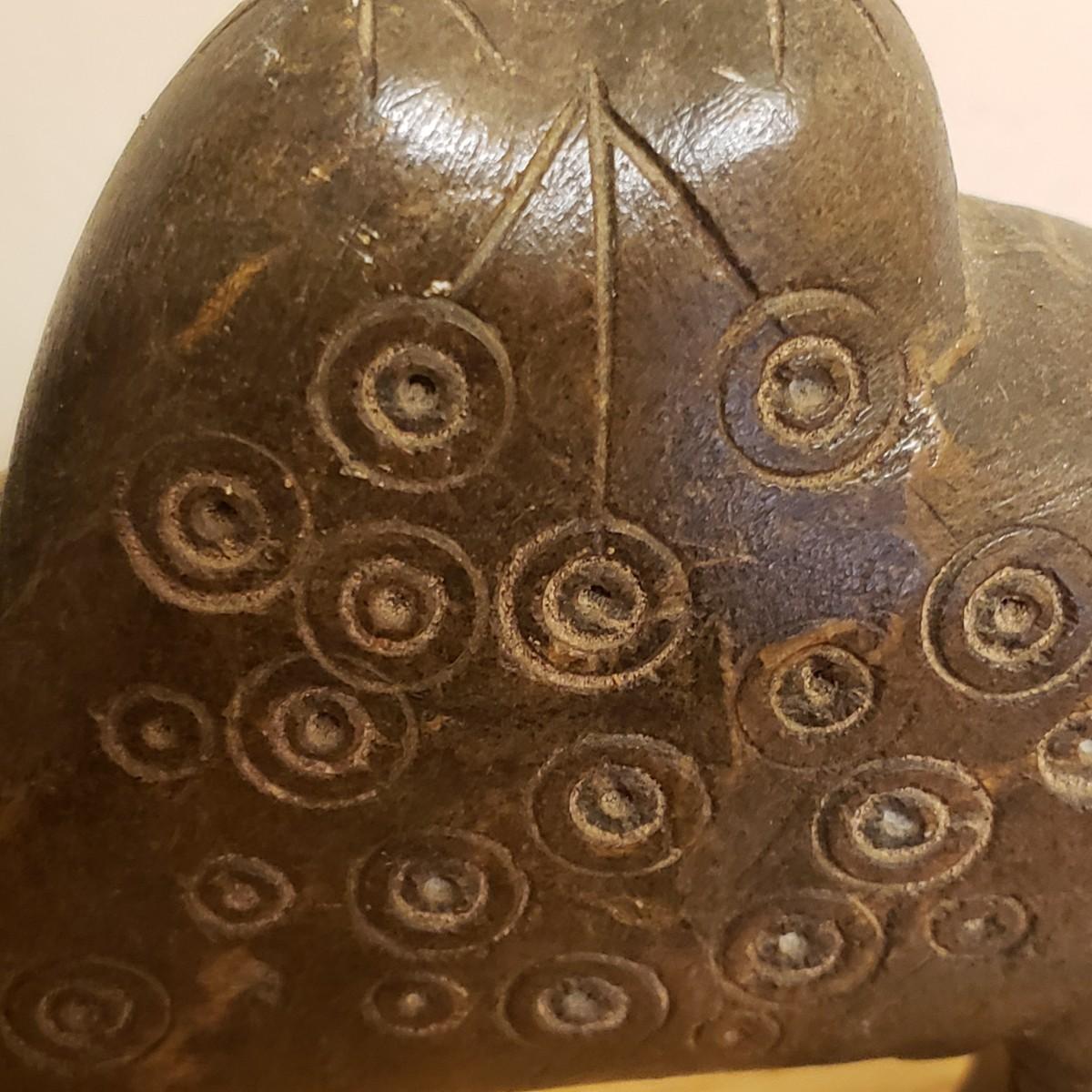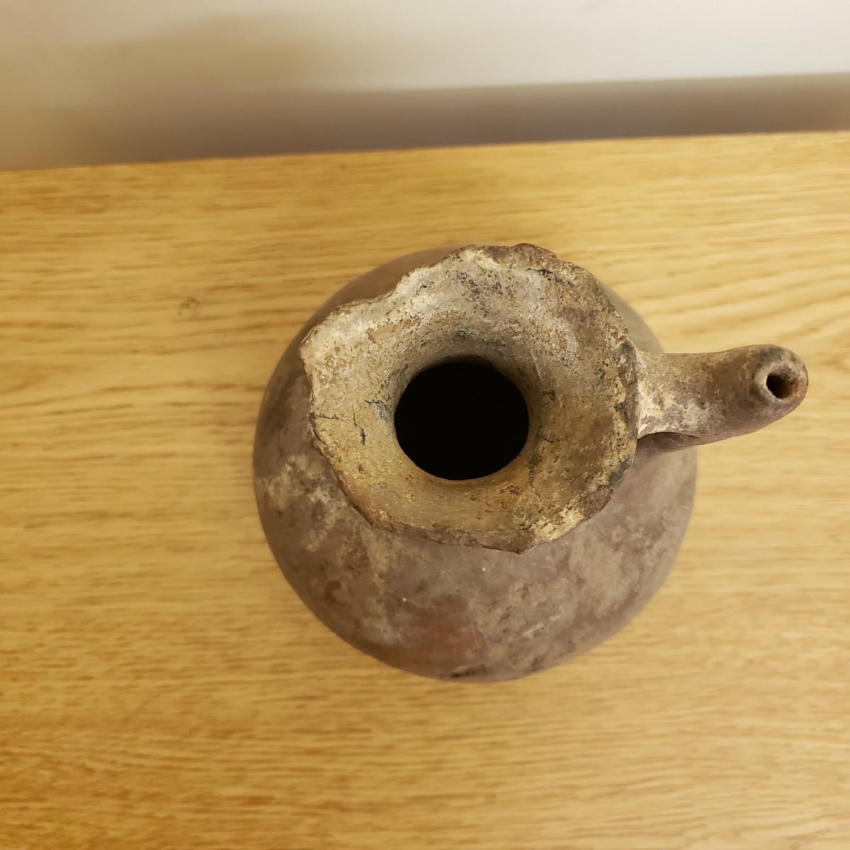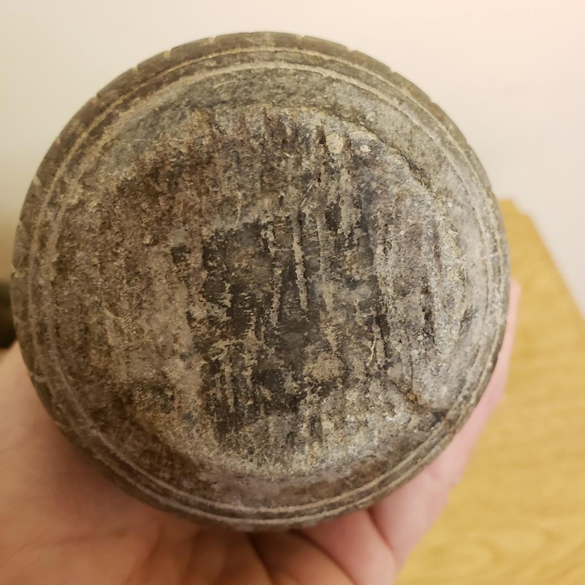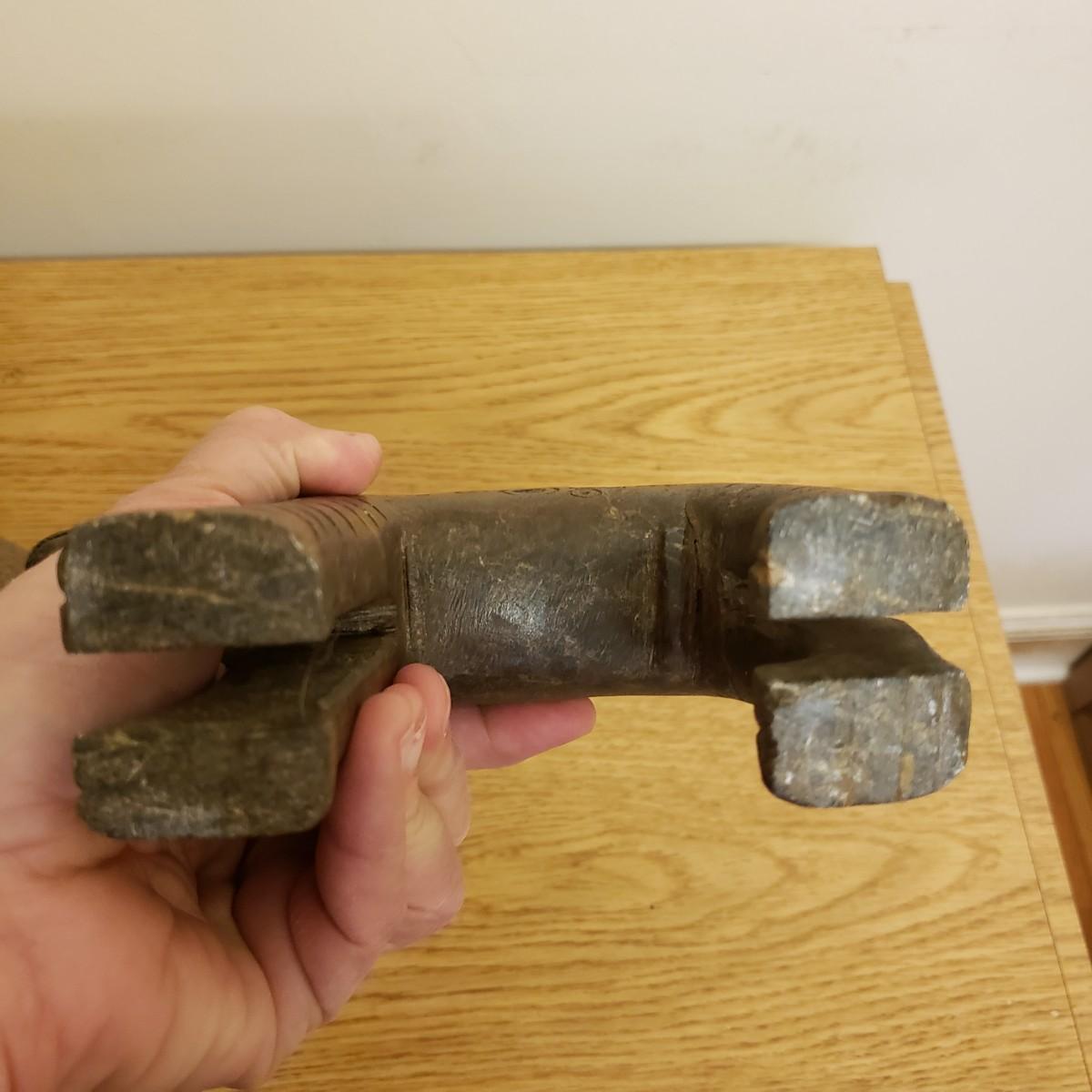 This three piece lot features two pitchers and a carved stone camel. The camel measures 8" x 2" x 8"H. It is heavy to the touch and has interesting carved features. The largest pitcher appears to be antique, yet there are no markings. The handle is fluted and rim has some wear. The smallest vase/pitcher feels like stone that has been carved. The one side near the handle appears like it has been carved out.