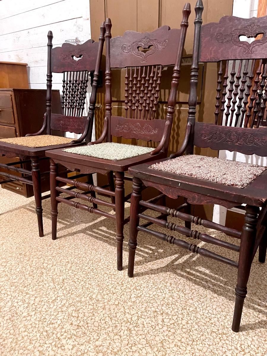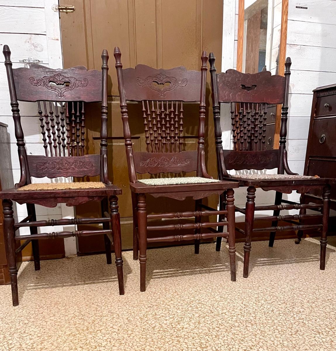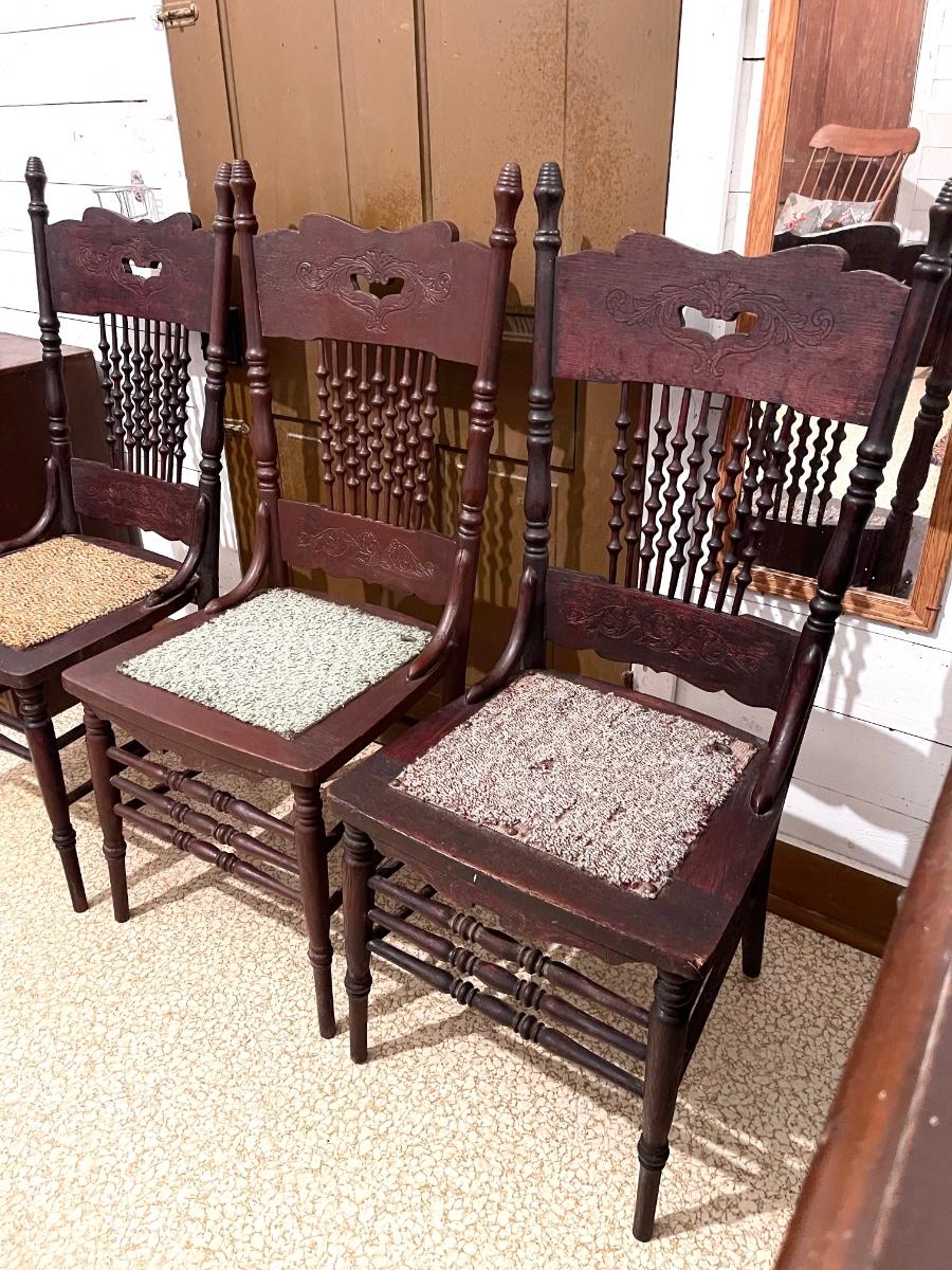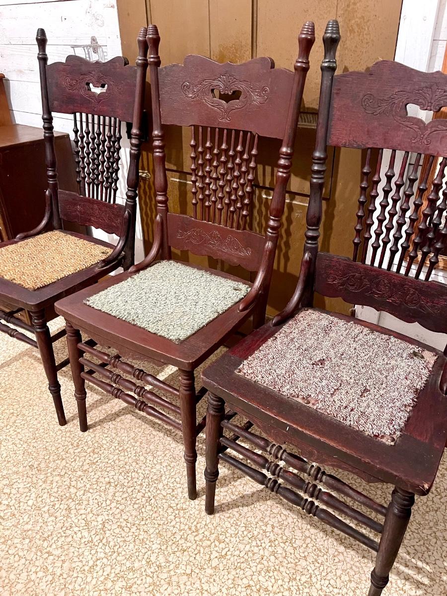 These 3 chairs are beautiful. The cane has probably been long gone. The seats have been repaired with what they had. Though it’s a primitive repair, these chairs are still new with those spindles and the press back with cut out. Just need someone that sees the potential