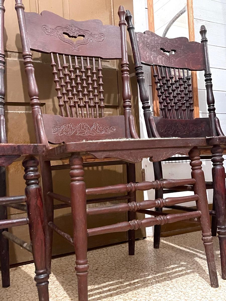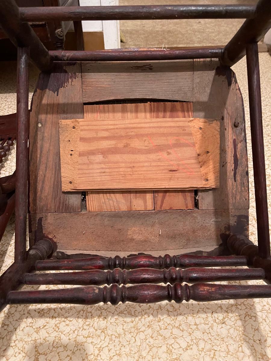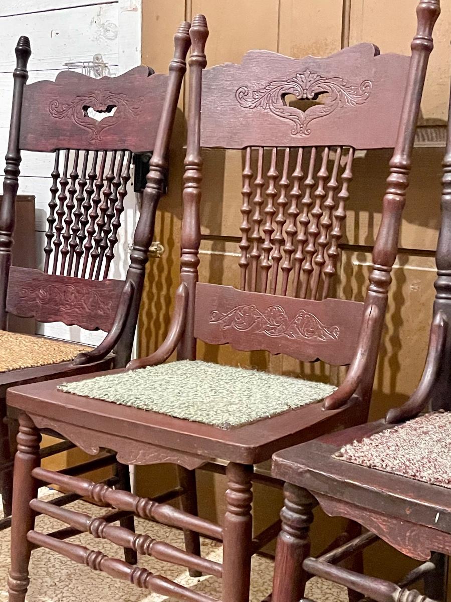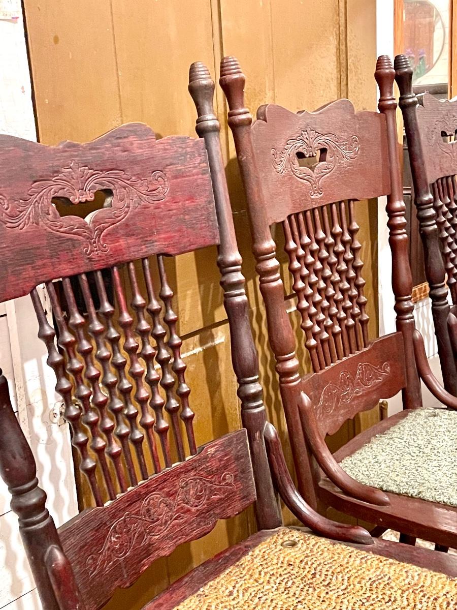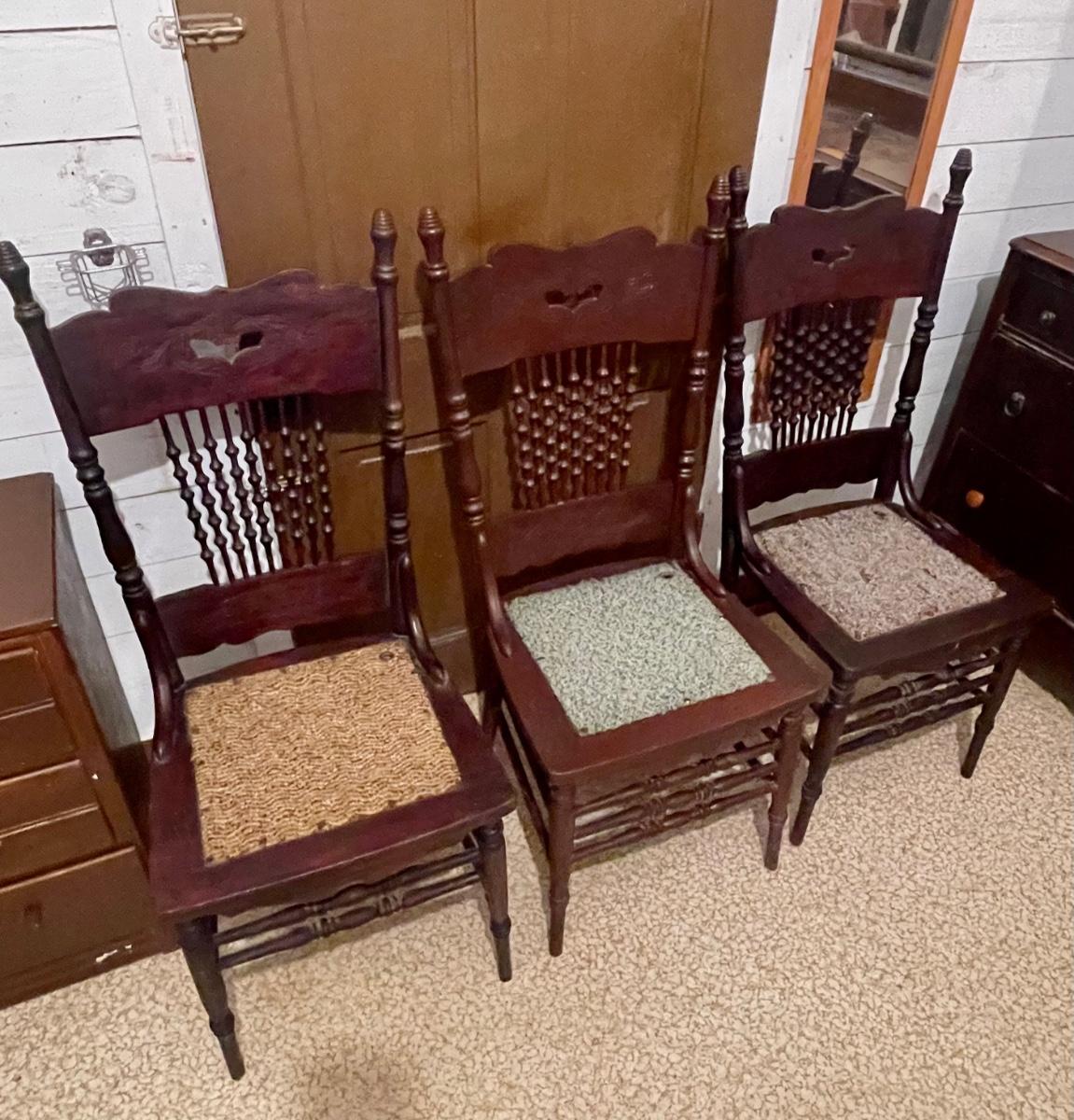 These 3 chairs are beautiful. The cane has probably been long gone. The seats have been repaired with what they had. Though it’s a primitive repair, these chairs are still new with those spindles and the press back with cut out. Just need someone that sees the potential