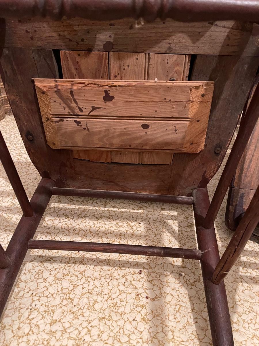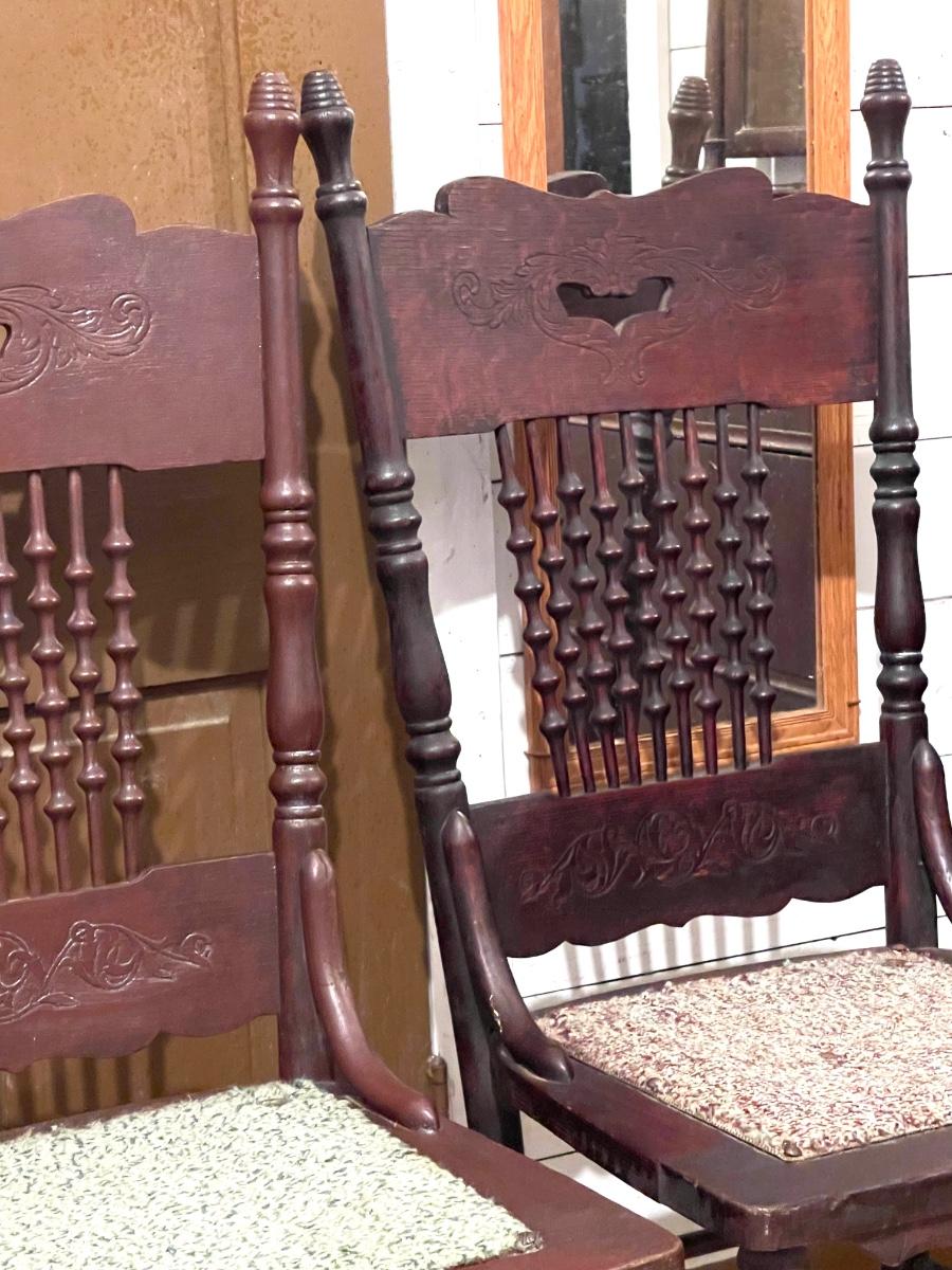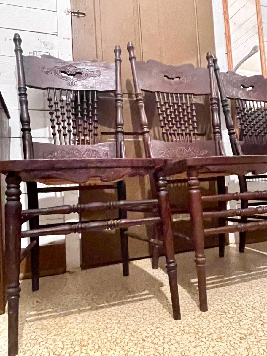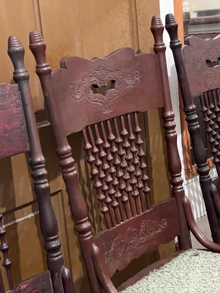 These 3 chairs are beautiful. The cane has probably been long gone. The seats have been repaired with what they had. Though it’s a primitive repair, these chairs are still new with those spindles and the press back with cut out. Just need someone that sees the potential