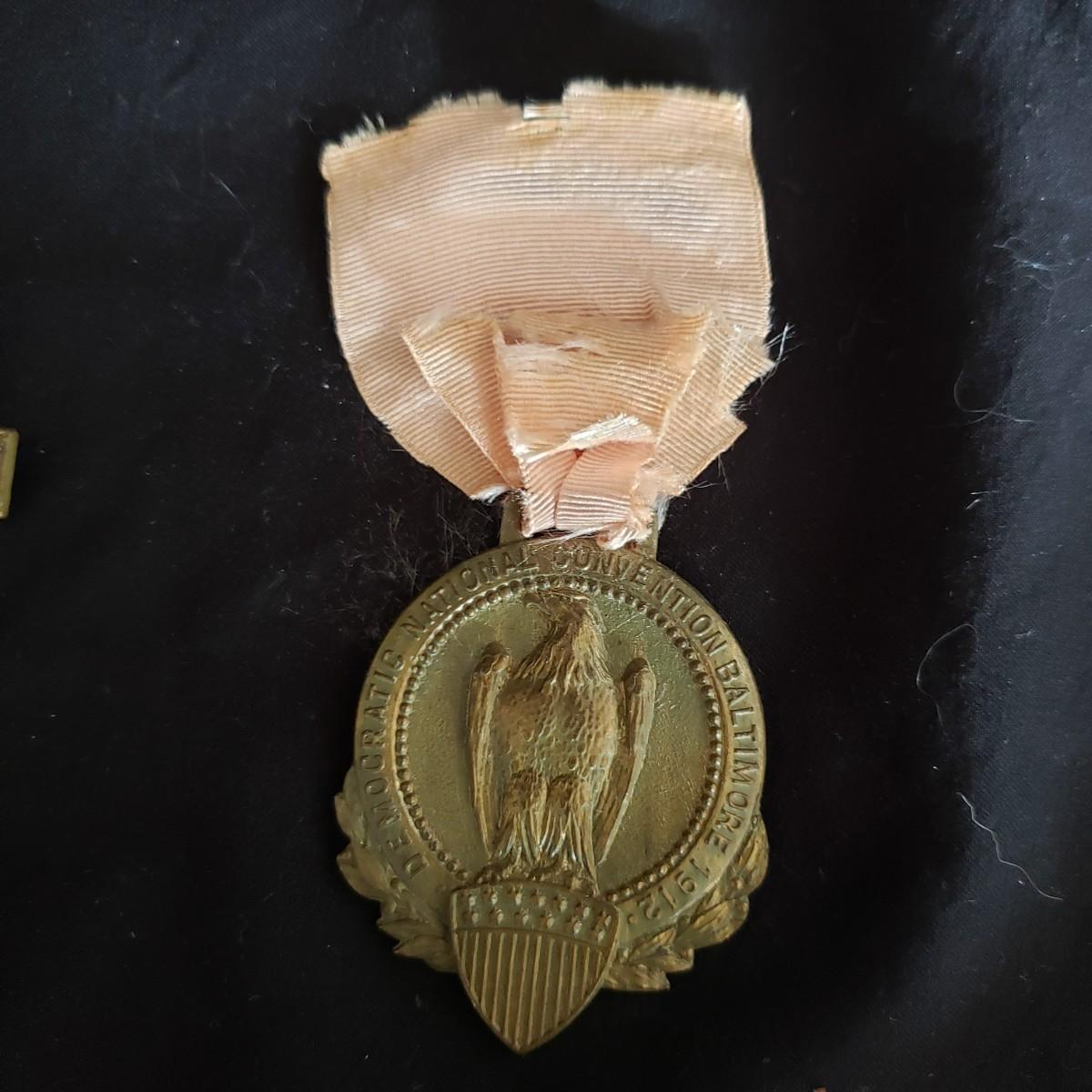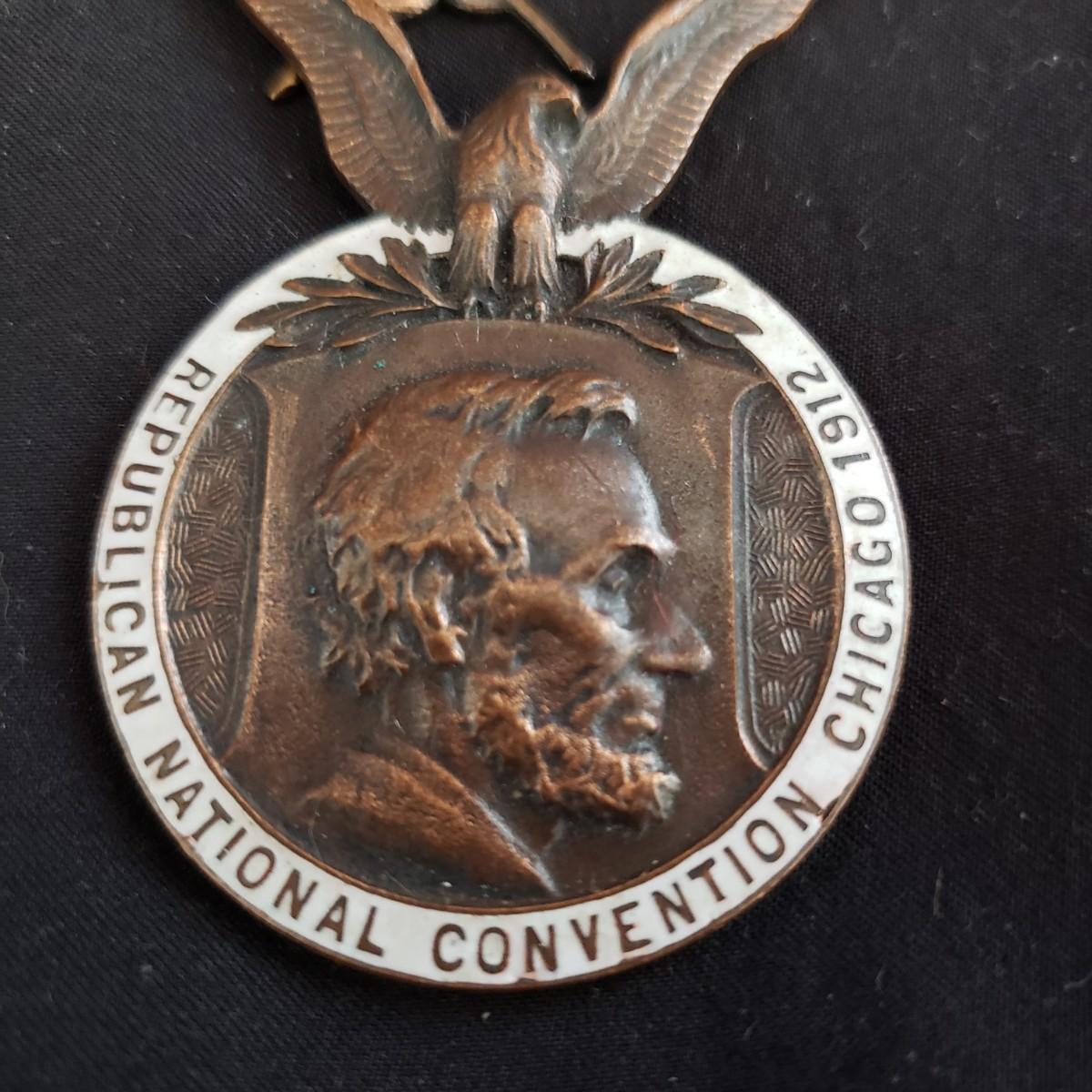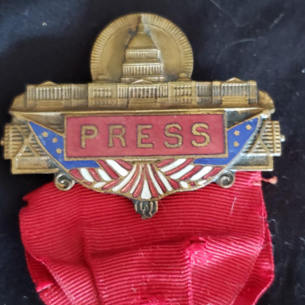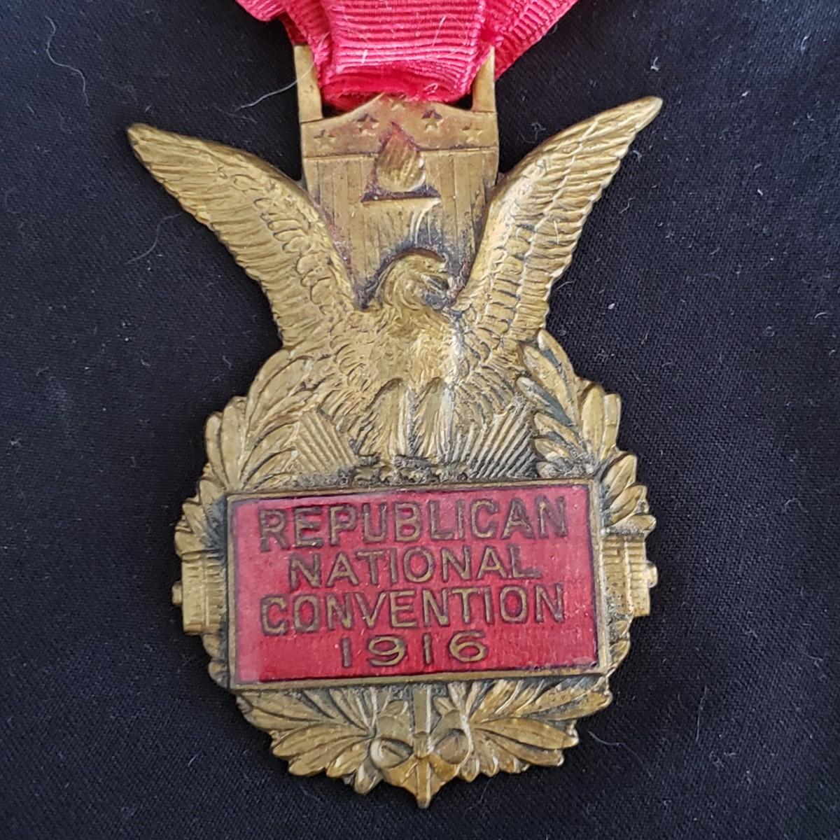 There are three antique press pins in this lot. The first one pictured (2" x 5") states 1912 Republican National Convention in Chicago. The second one states 1916 Republican National Convention. The third one states 1912 Democratic National Convention in Baltimore. All pins are made of metal. The ribbons are tattered seemingly due to age. The Democratic pin is in two pieces, as the ribbon has come apart from the top piece.