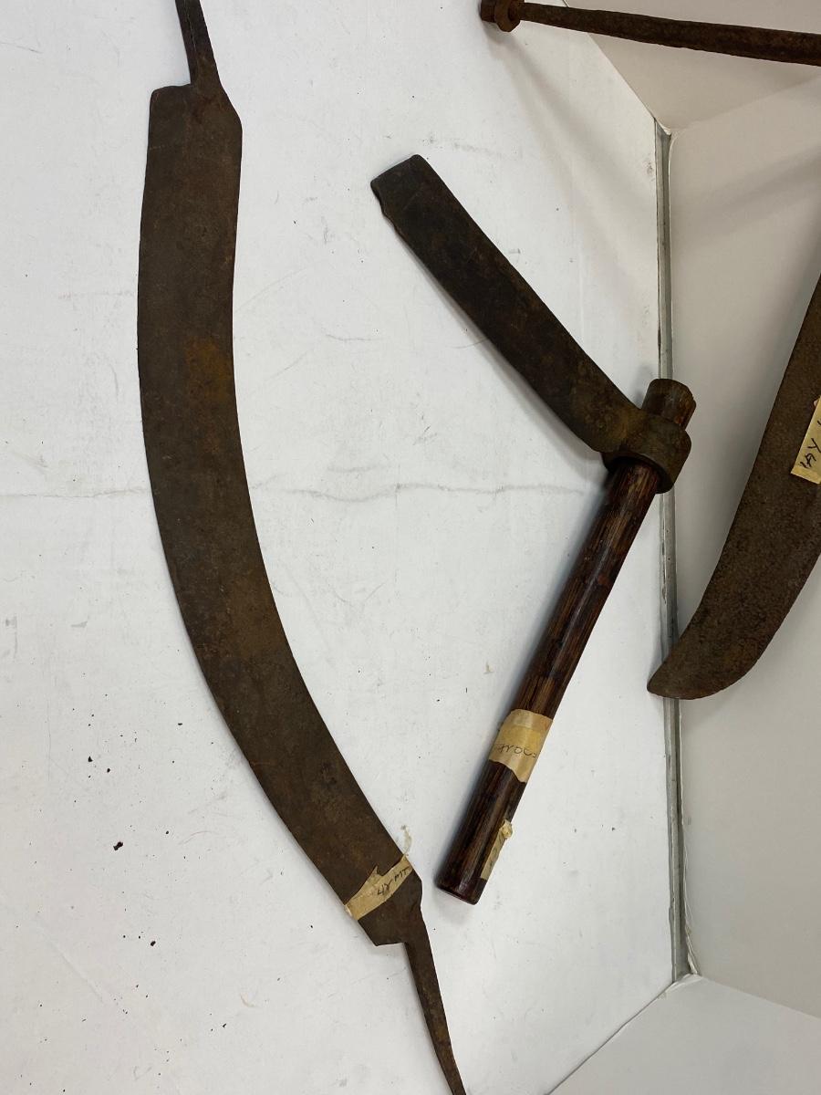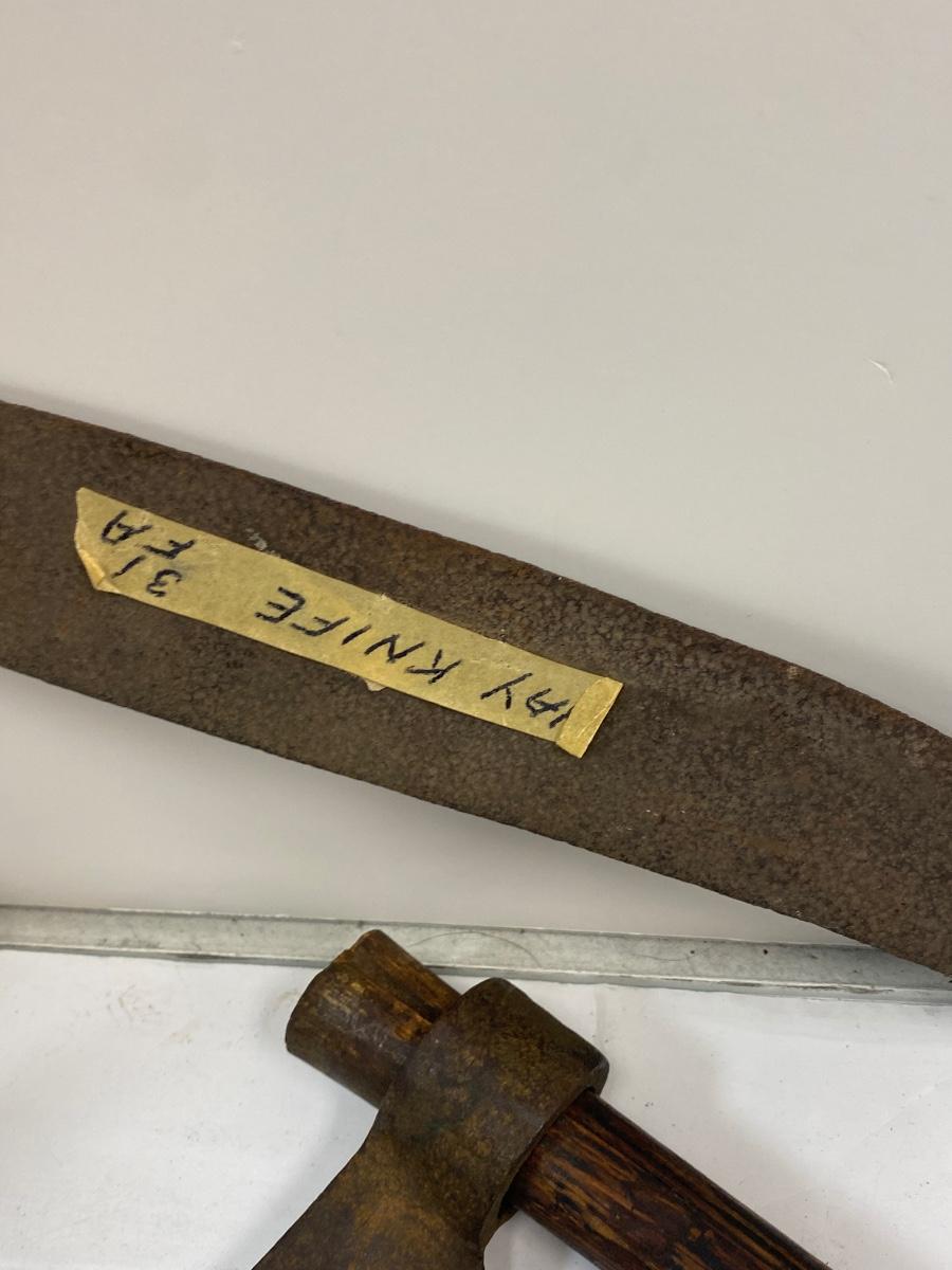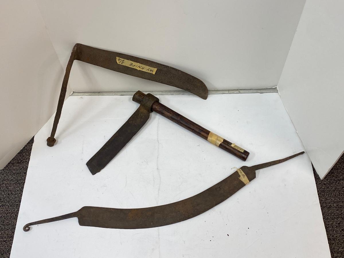 Antique Primitive Blacksmith Hay Knife Froe Spokeshave Blade. All in antique condition. Hay knife and spokeshave are missing wood handles. Great for display or repurpose/repair.