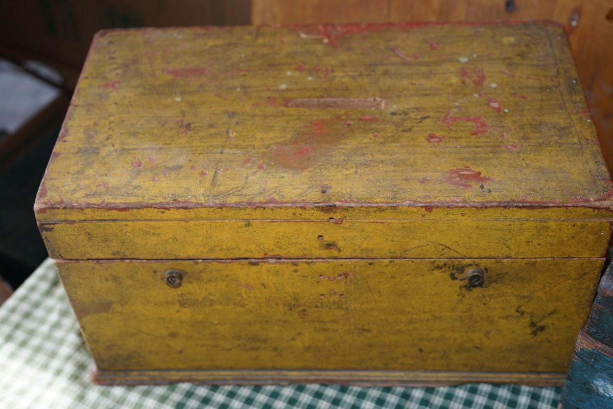 The other box is the original yellow charming color. It has a slot on the top. Most likely used as a voters box or ? the box measures: Length of 18" Height : 9 1/2" Width : 10" no lock . good condition.