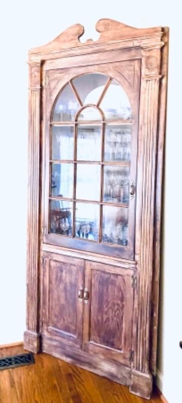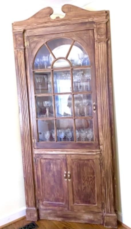 Great old corner cubboard salvaged from historic house - super broke pediment top, arched divided lite door with original glass, reeded side columns , medallions. Client stripped old paint leaving this perfect tone on tone rustic wood finish.