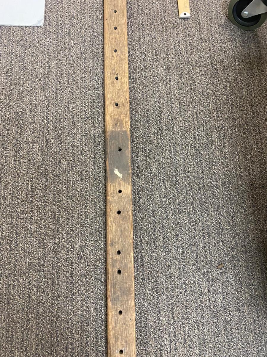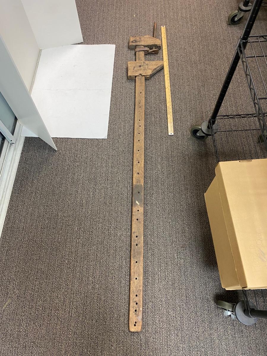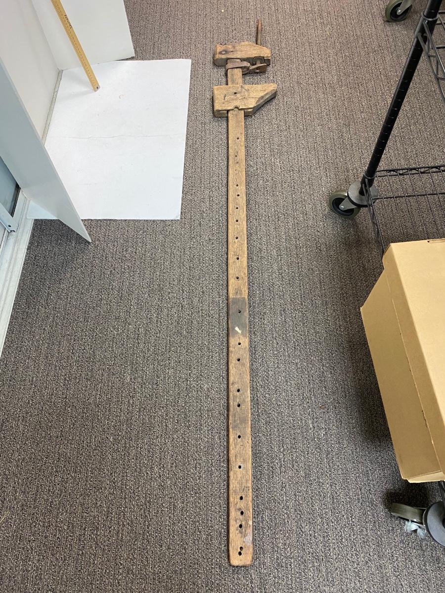 Antique Primitive Extra Long Wood Clamp Missing Pin. Over 6' length. Would hang and display great.