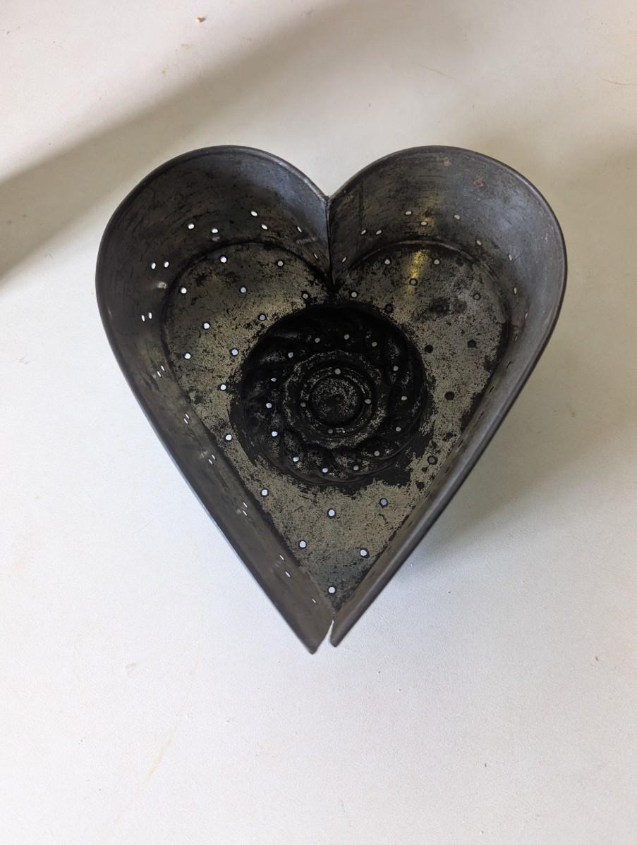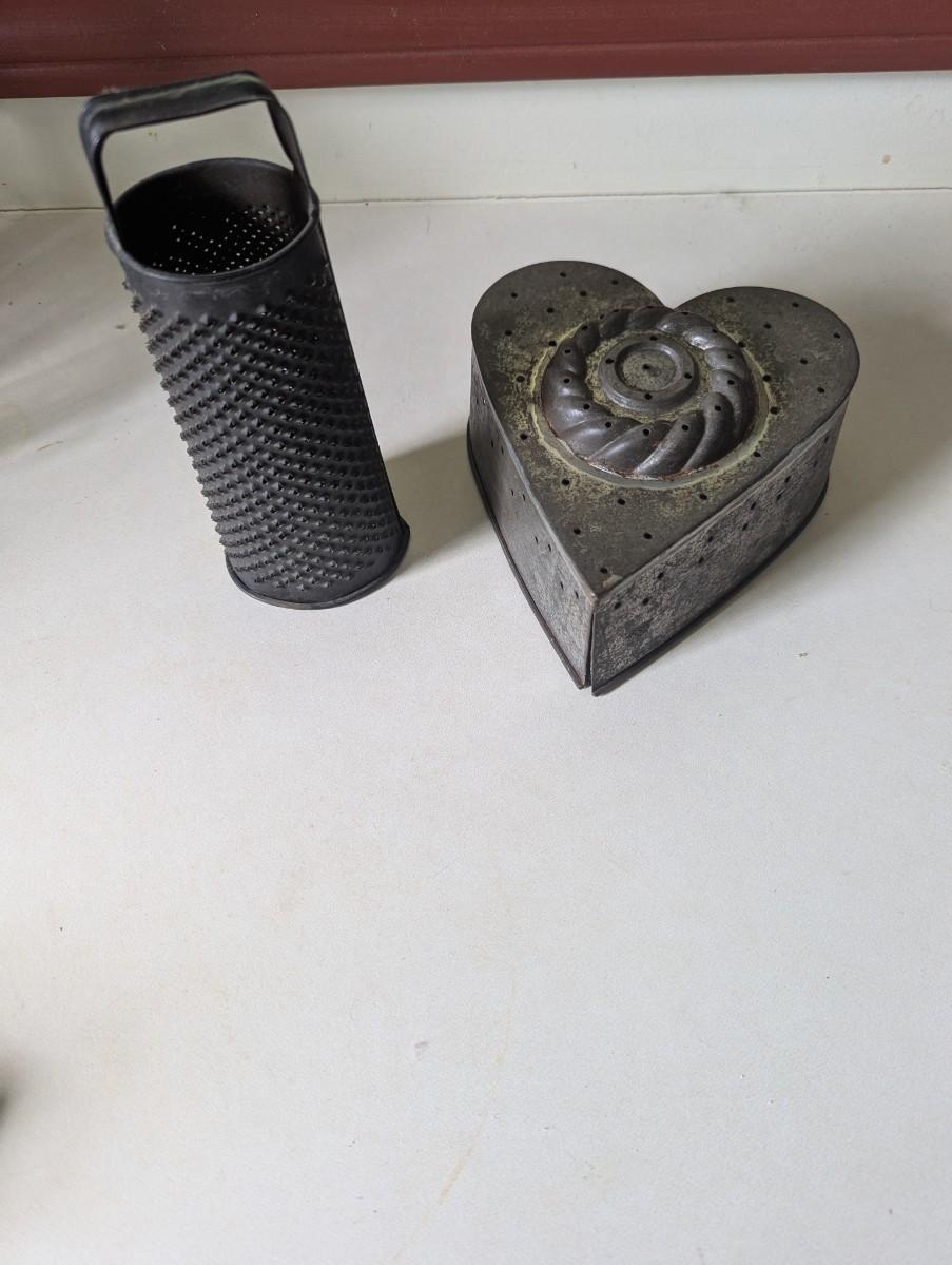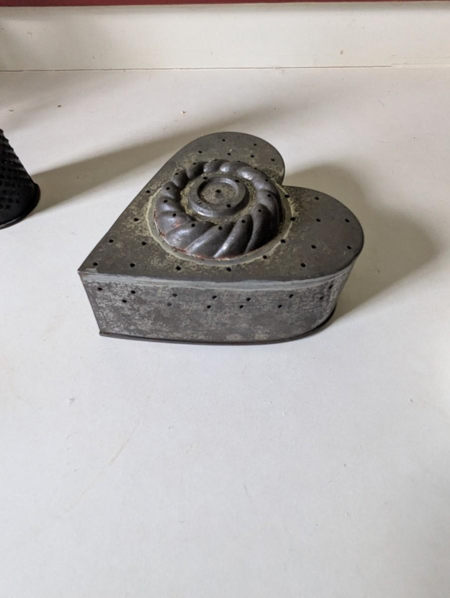 Antique Primitive Farmhouse American Heart Shaped Tin Cheese Strainer Round Grater (L)