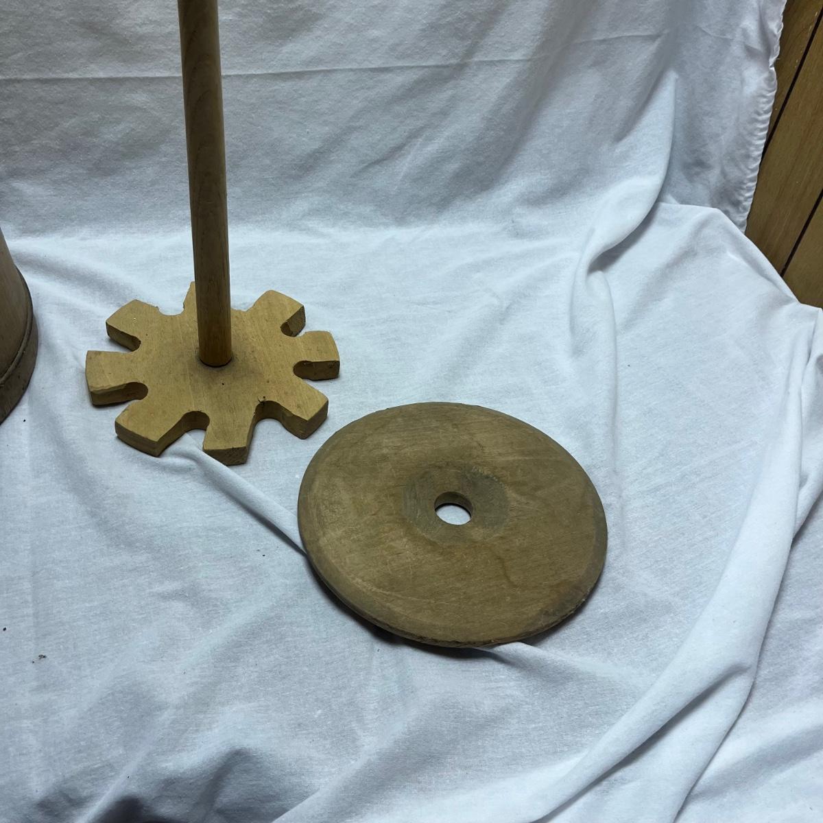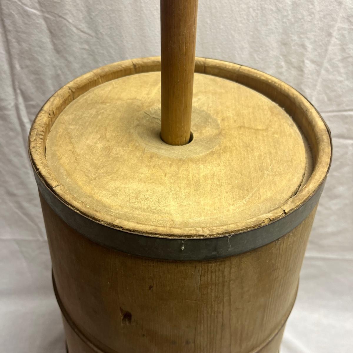 Lot includes a banded wood slat butter/milk churn with dasher and lid. Piece measures 14.5”D x 45”H.