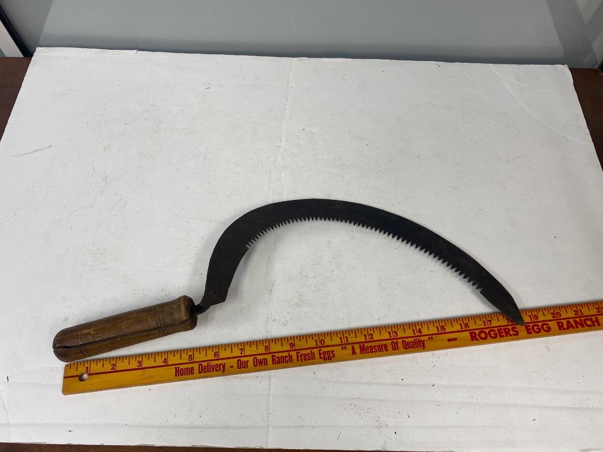 Antique Primitive Saw Tooth Inside Edge Sickle Handheld Reaper England. In good antique condition. Sharp saw tooth blade. About 18" length. Made in England.