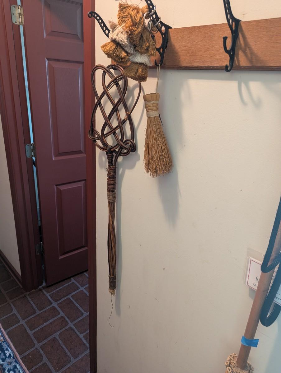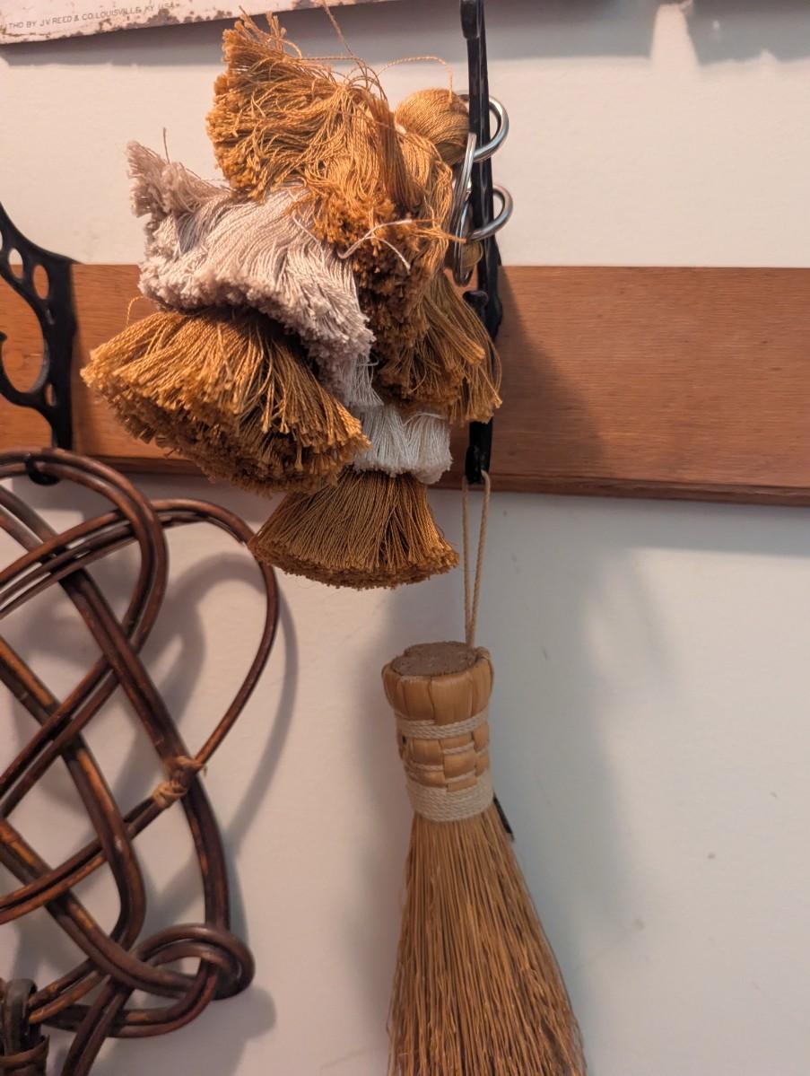 Antique Primitive Woven Rattan Rug Carpet Beater 33" & Hand Held Brush With Tassels