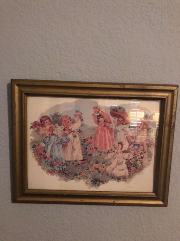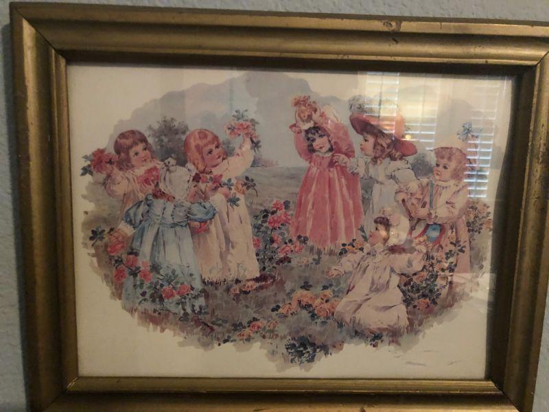VICTORIAN PRINT OF LITTLE GIRLS PLAYING IN A FIELD OF FLOWERS. GOLD FRAME