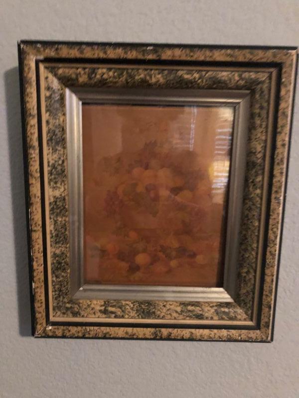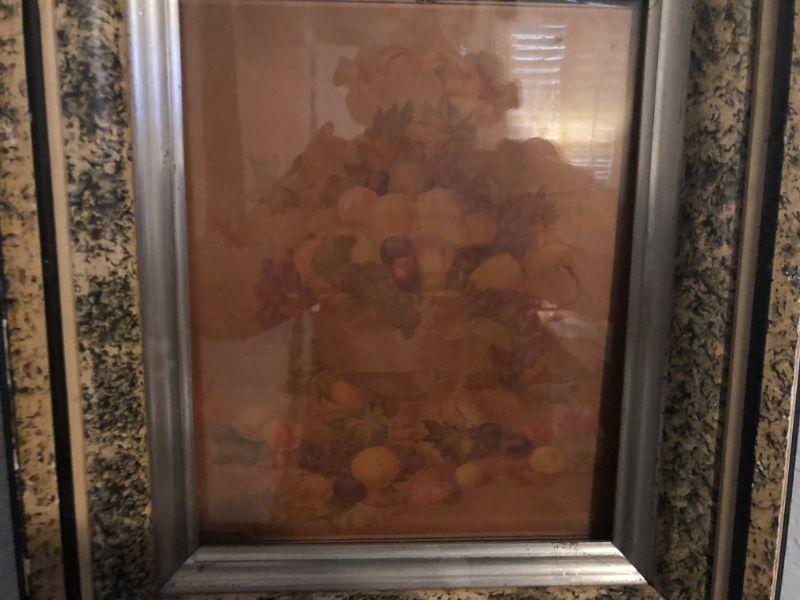 BEAUTIFUL COMPOTE AND FRUIT PRINT, MUTED COLORS. GORGEOUS ORIGINAL FRAME WITH GOLD INLAY. VERY OLD AND CHARMING. 14 X 12