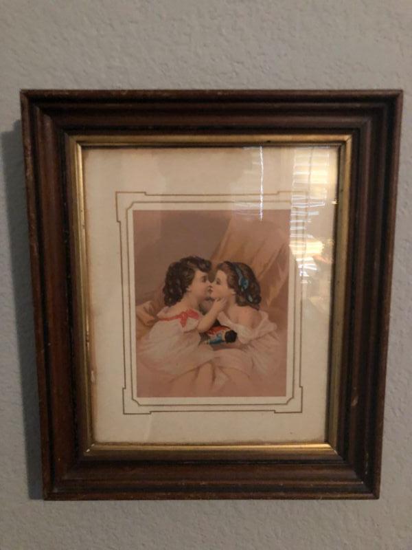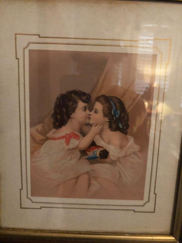 BEAUTIFUL VICTORIAN PRINT OF TWO YOUNG GIRLS KISSING. 12 X 14. ORIGINAL VERY OLD ORIGINAL WALNUT FRAME WITH GOLD INLAY.