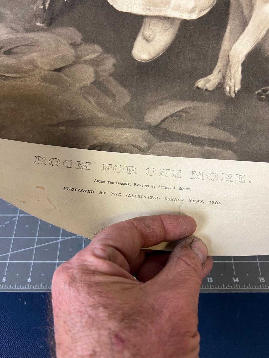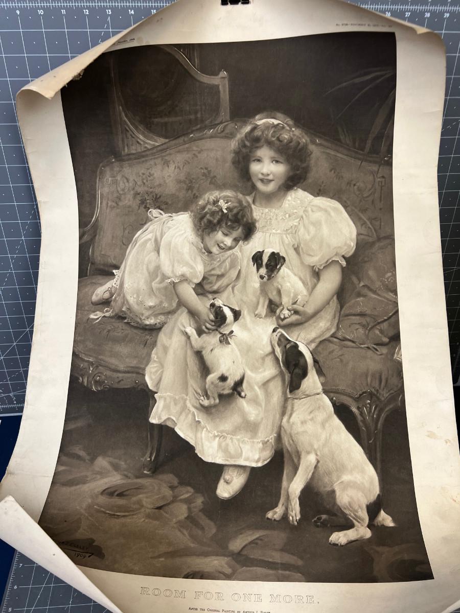 Antique Print Rolled Girl and Puppy, "Room for one more"