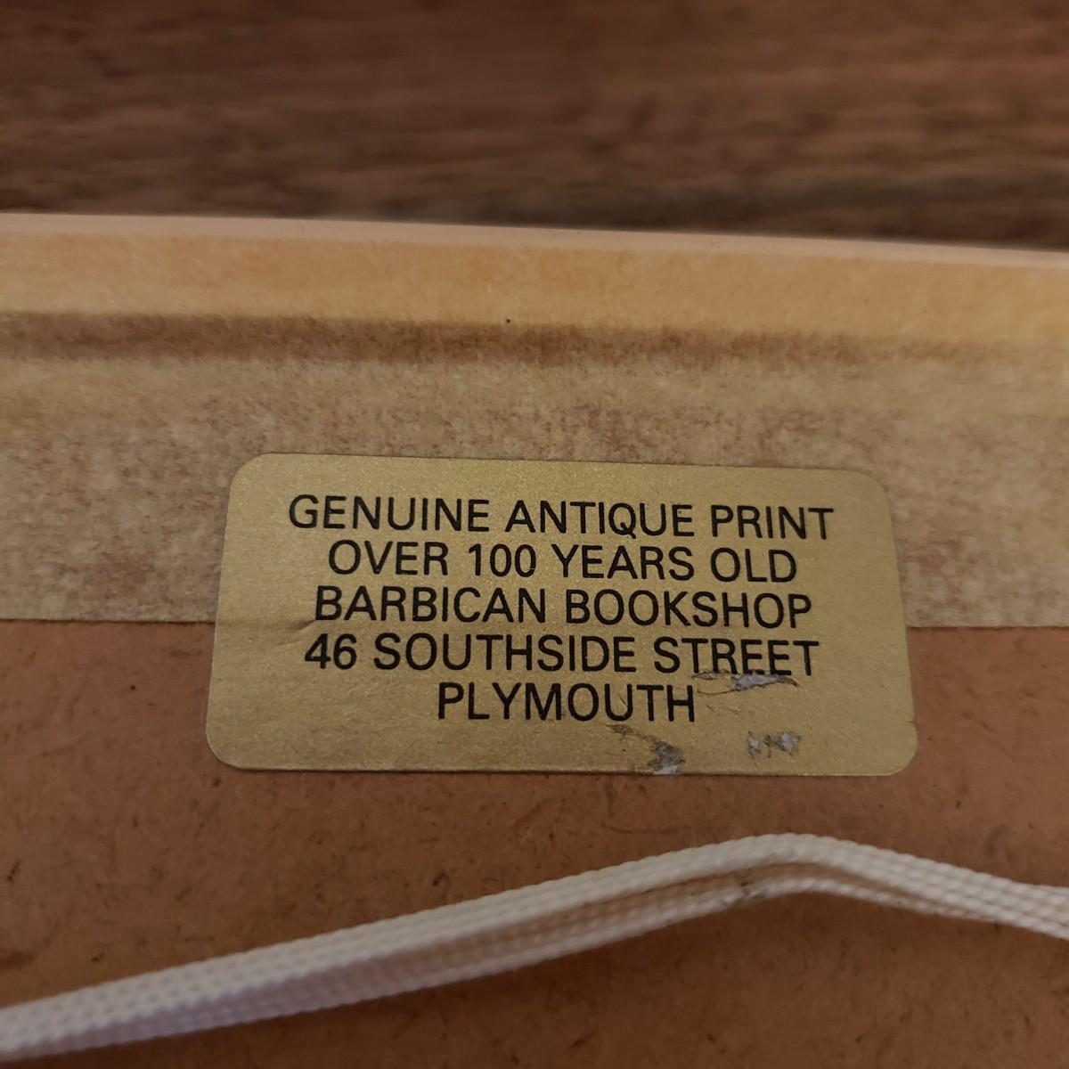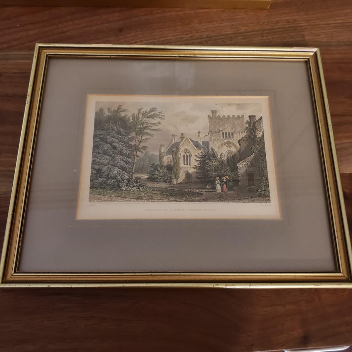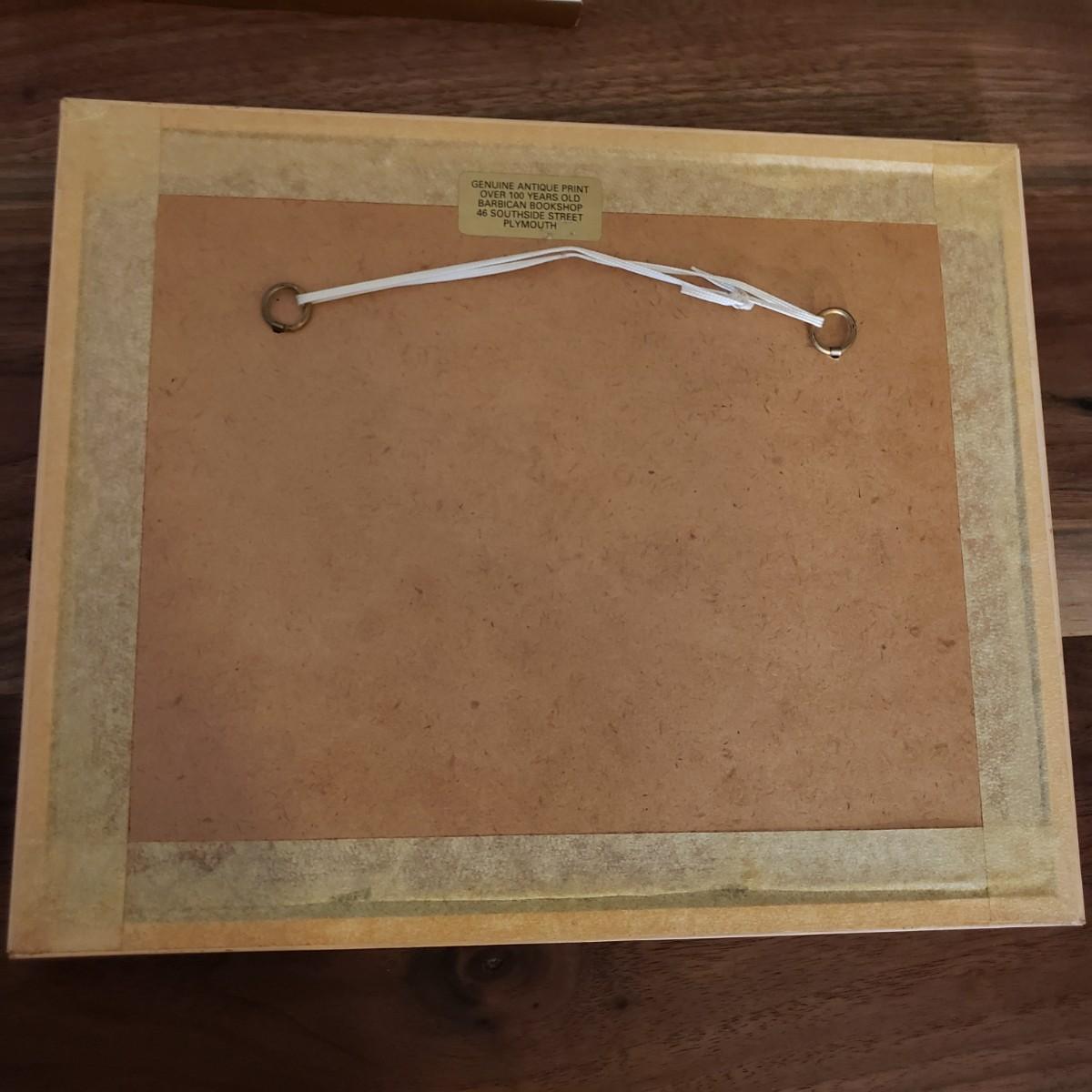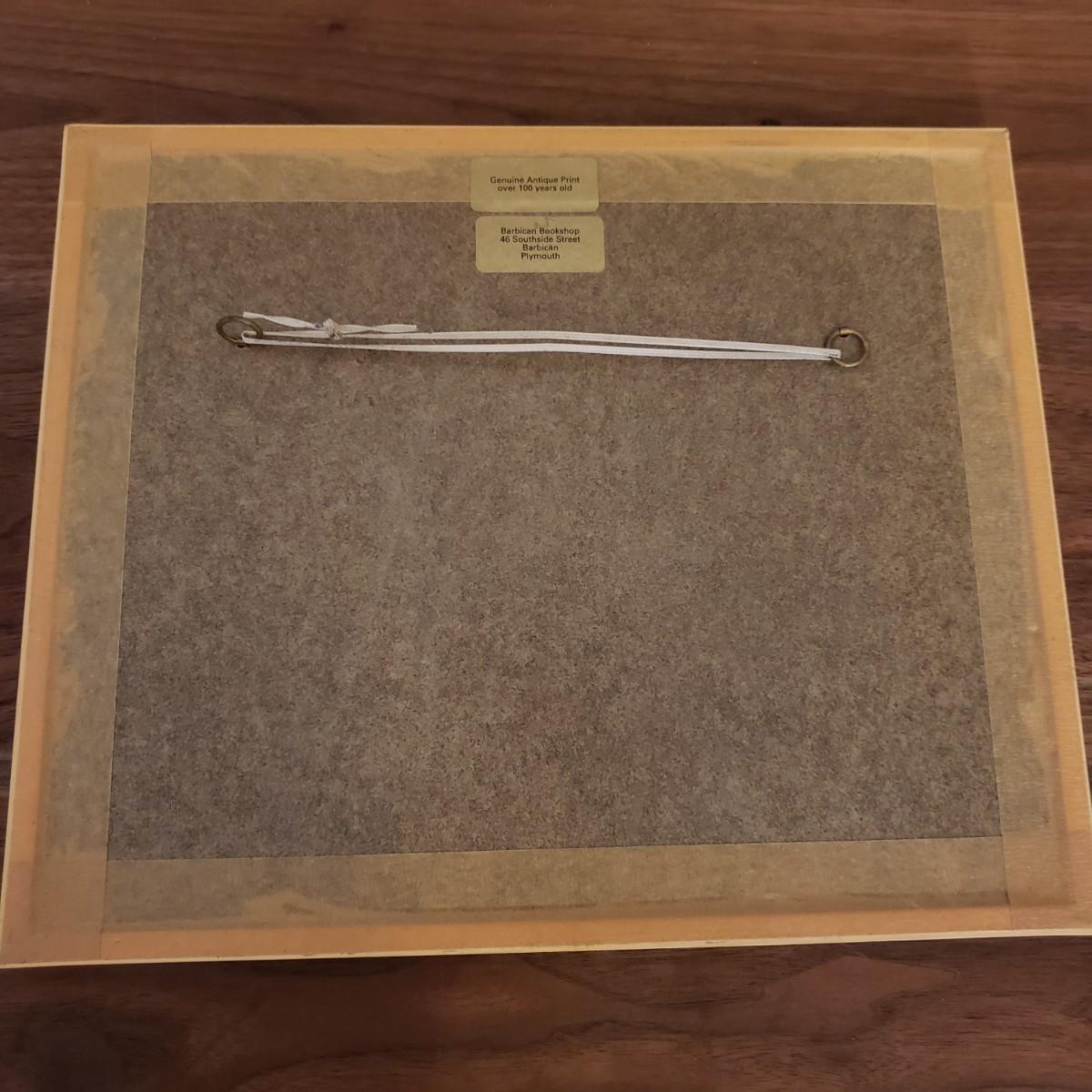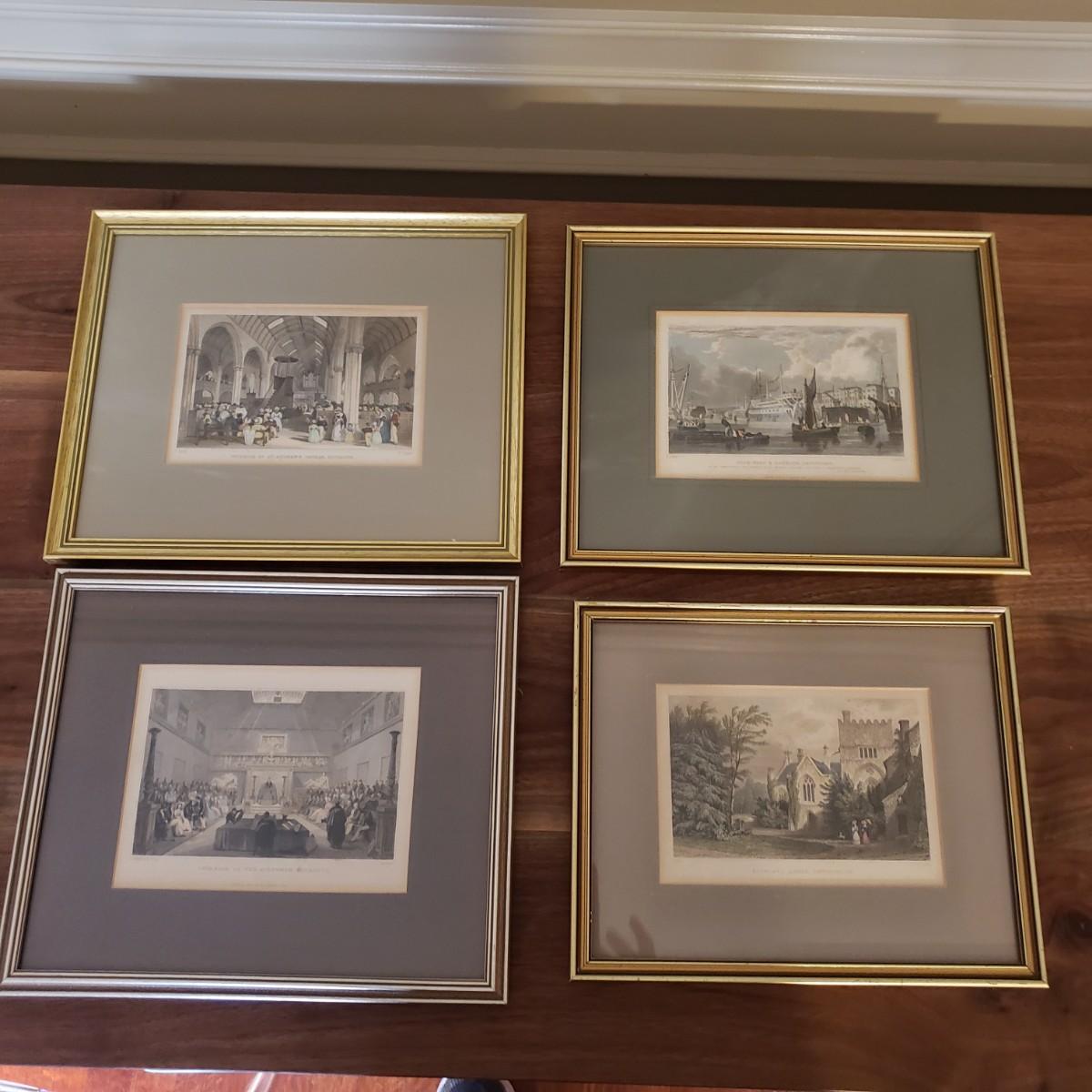 These four prints from England are framed in glass with gold paint on wood. The three largest frames measure 11" x 10". The sticker on the back of three of the frames claim the prints are more than 100 years old.