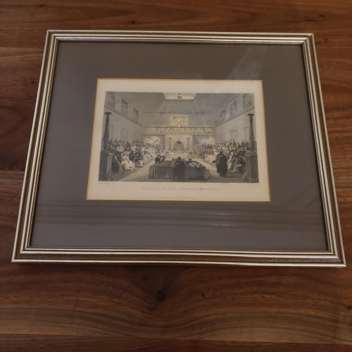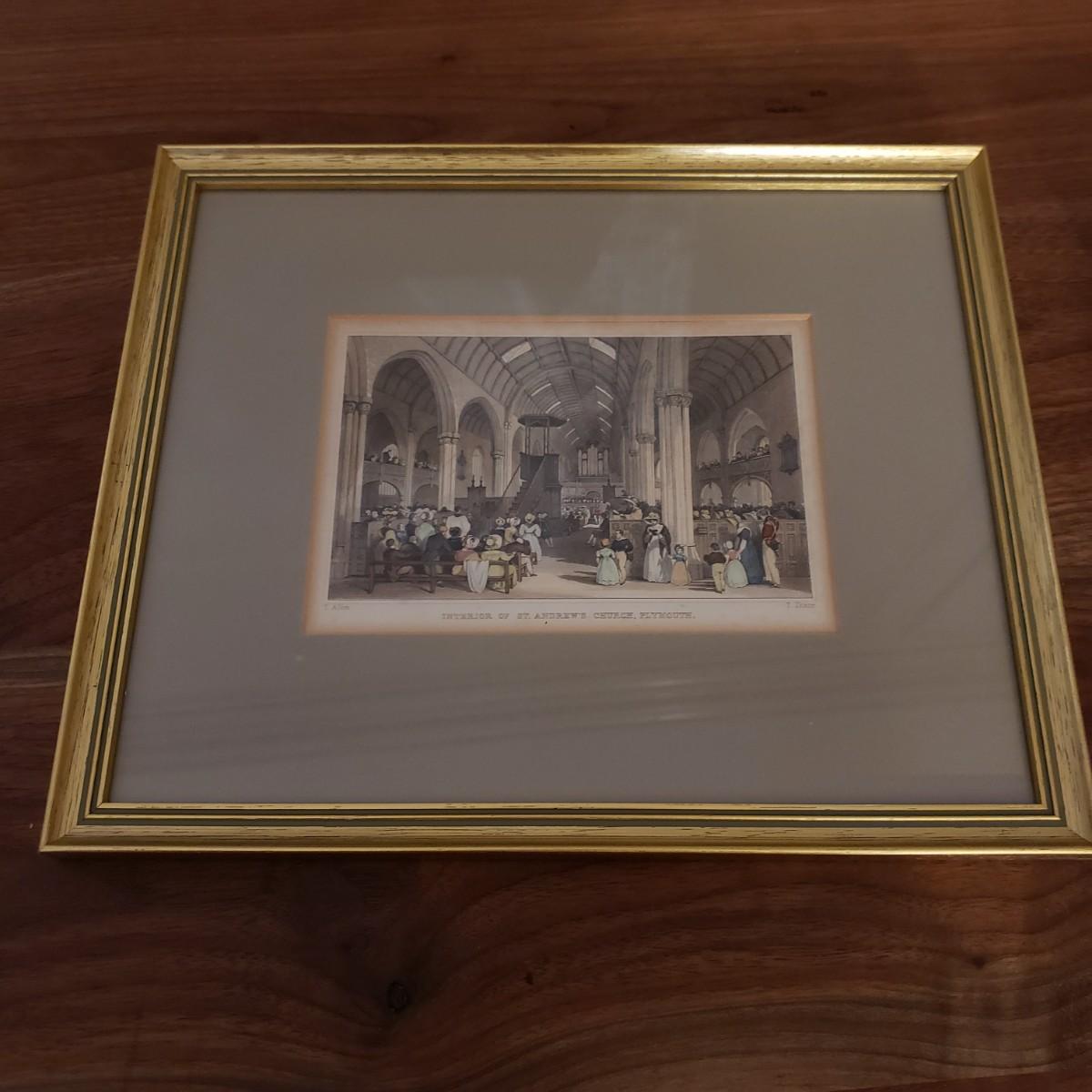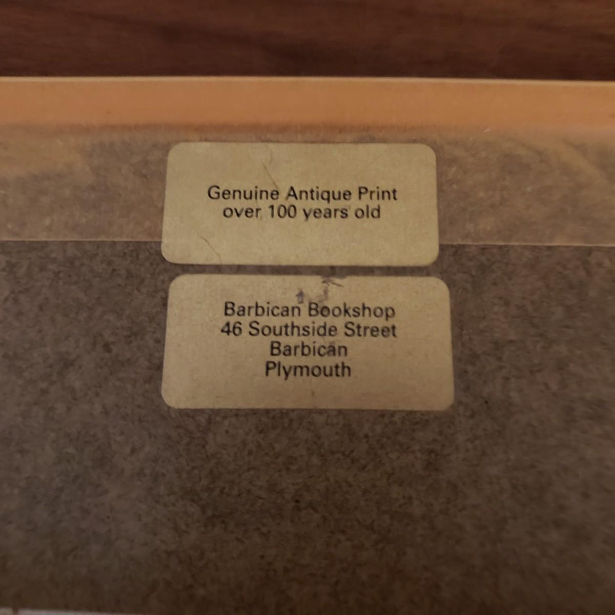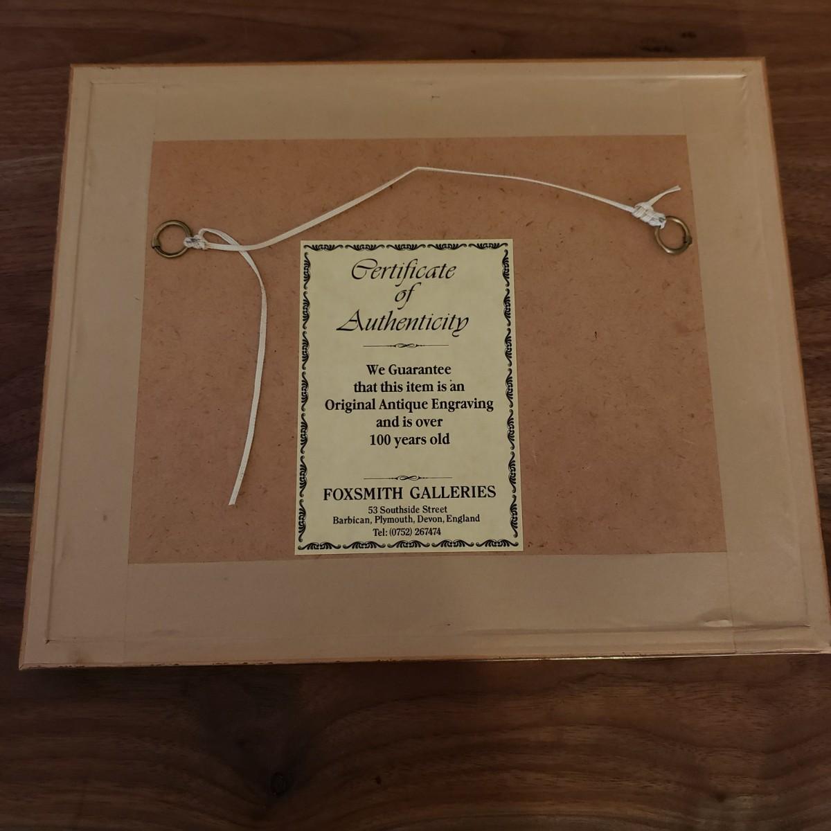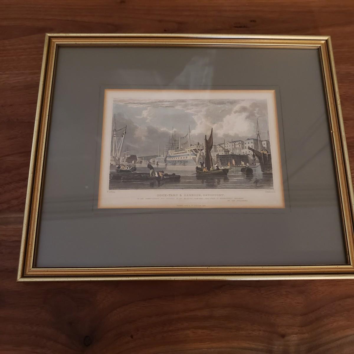 These four prints from England are framed in glass with gold paint on wood. The three largest frames measure 11" x 10". The sticker on the back of three of the frames claim the prints are more than 100 years old.