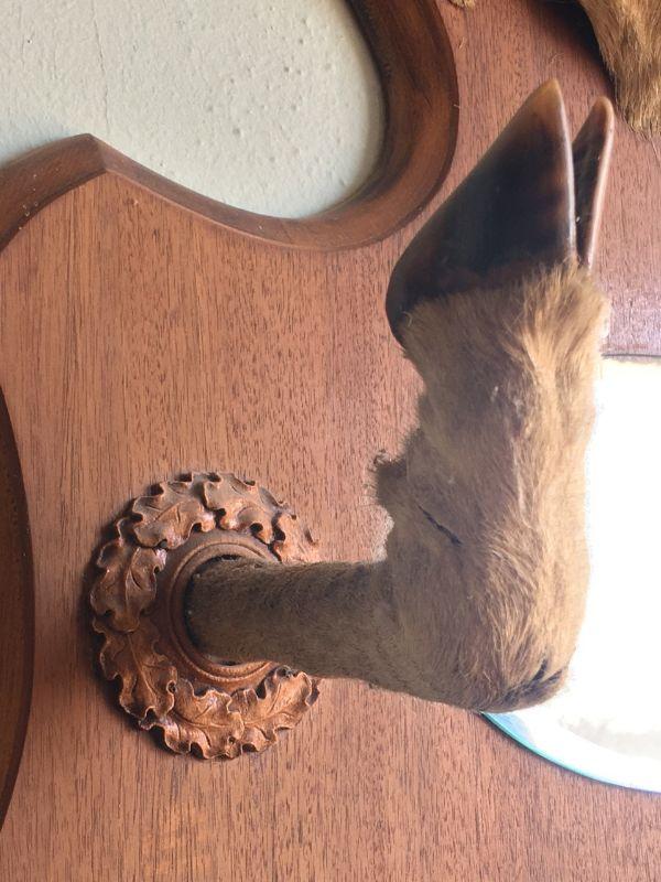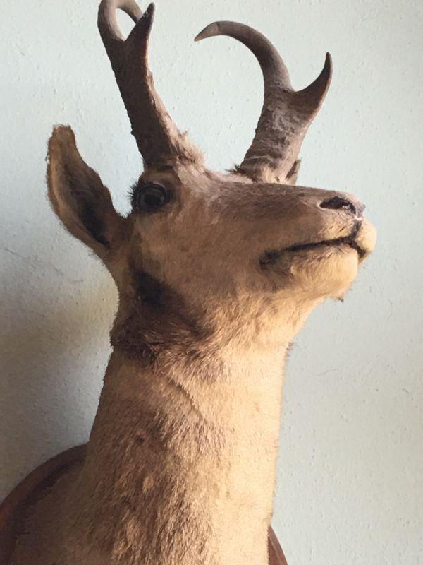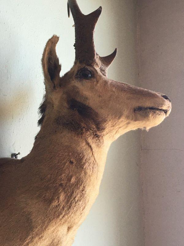 Antique Pronghorn Antelope Shoulder Mount with mirror and hoof hooks. Pretty good condition for its age! Mirror has a bit of silver loss, but not much. Prefer local pickup but will crate and ship with buyer's preferred shipper.
